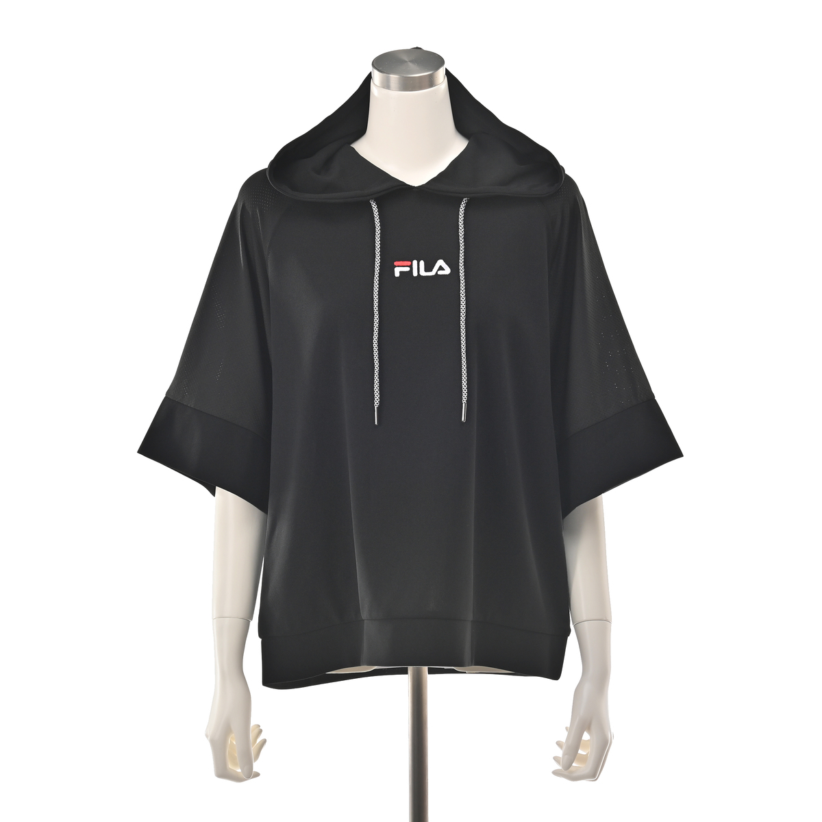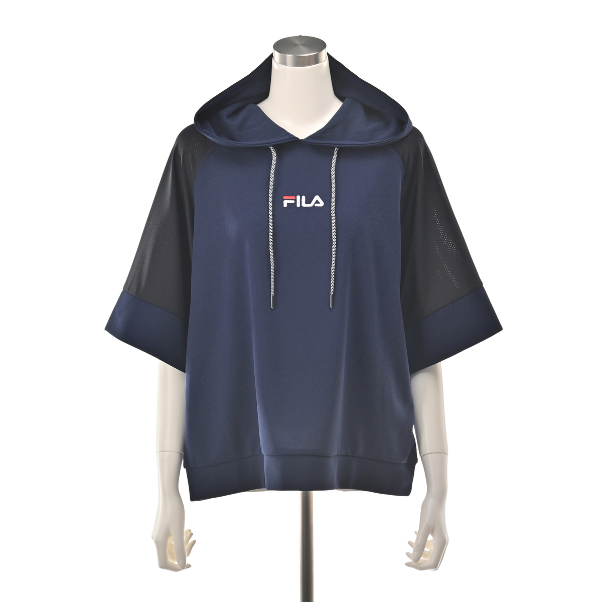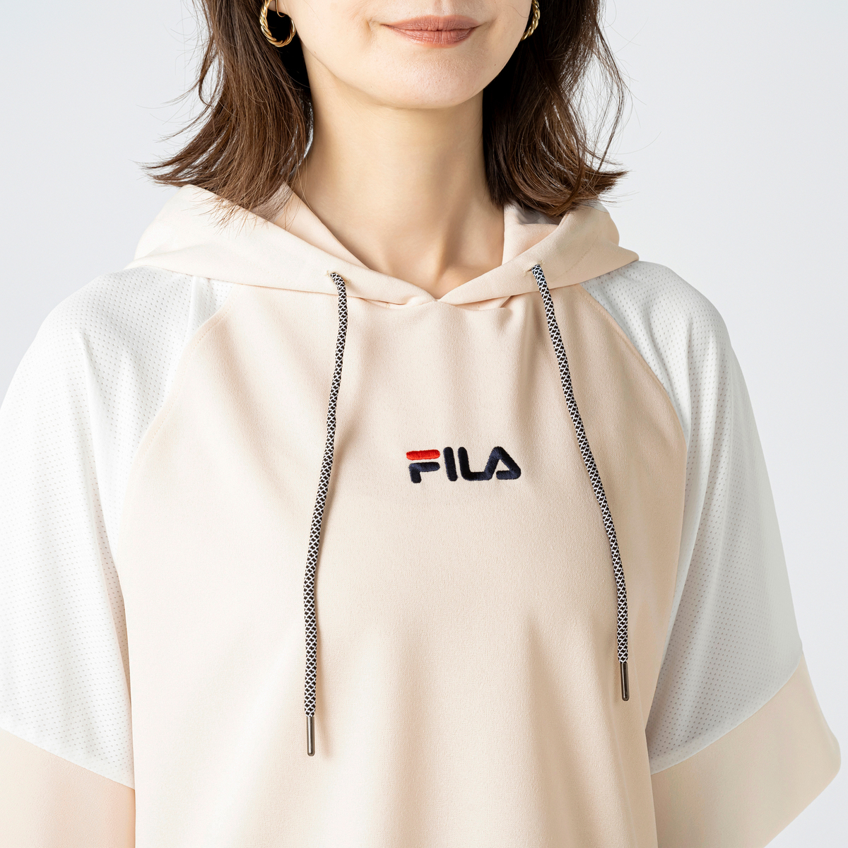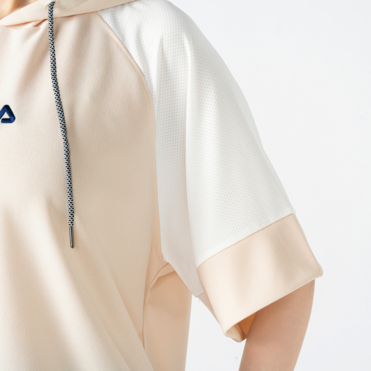 UVカット効果とストレッチ性がある着やすいメッシュフーディ。ゆったりとしたシルエットと、二の腕をさりげなくカバーする袖丈で、体のラインを拾いにくいのも嬉しいポイントです