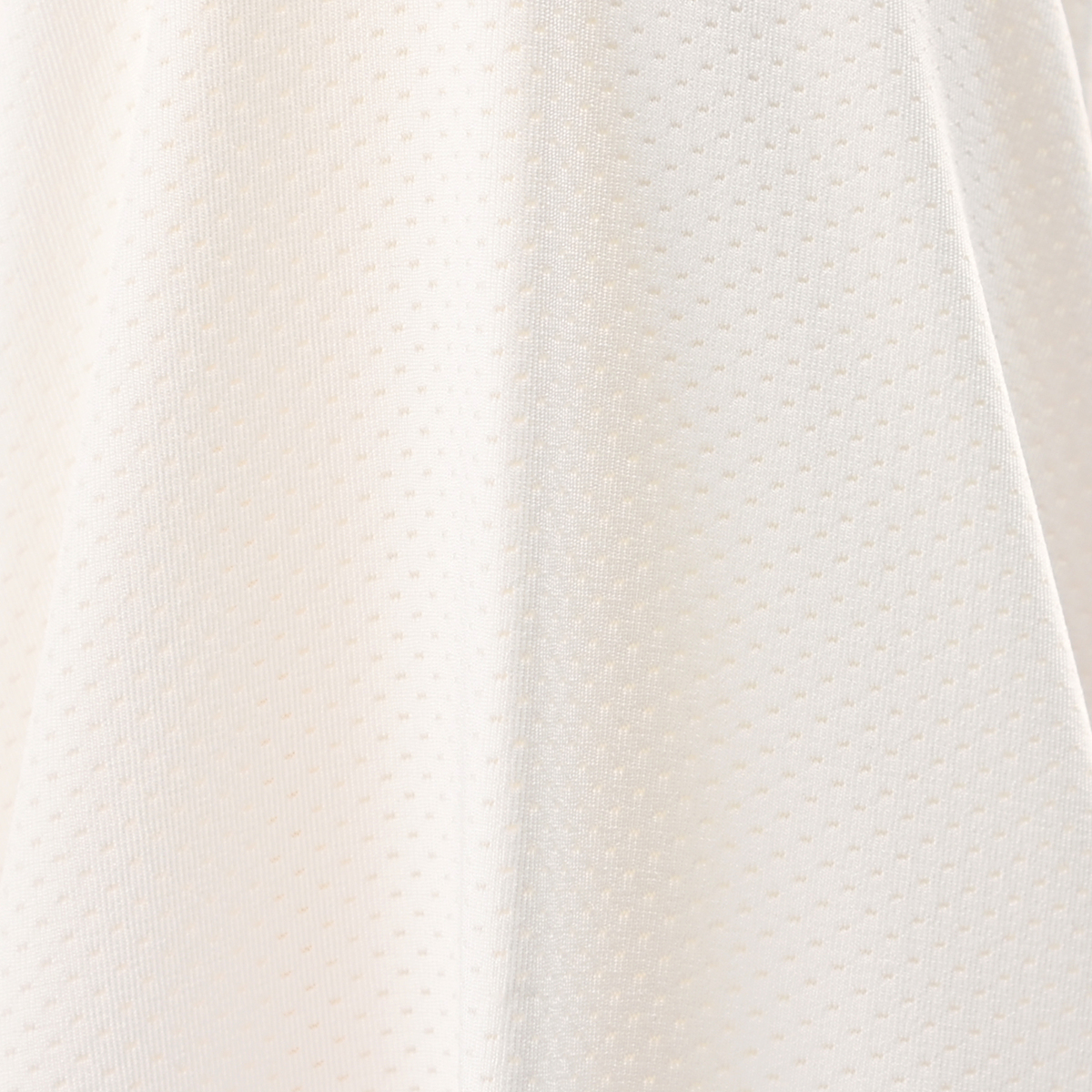 本体には、落ち感のあるカットジョーゼット素材を使用。カジュアルになりすぎず、なめらかで上品な印象に。肩から袖にかけては、アイレットメッシュ素材を切り替えで使用。程よい透け感があり、涼しさと軽やかさをプラスしています