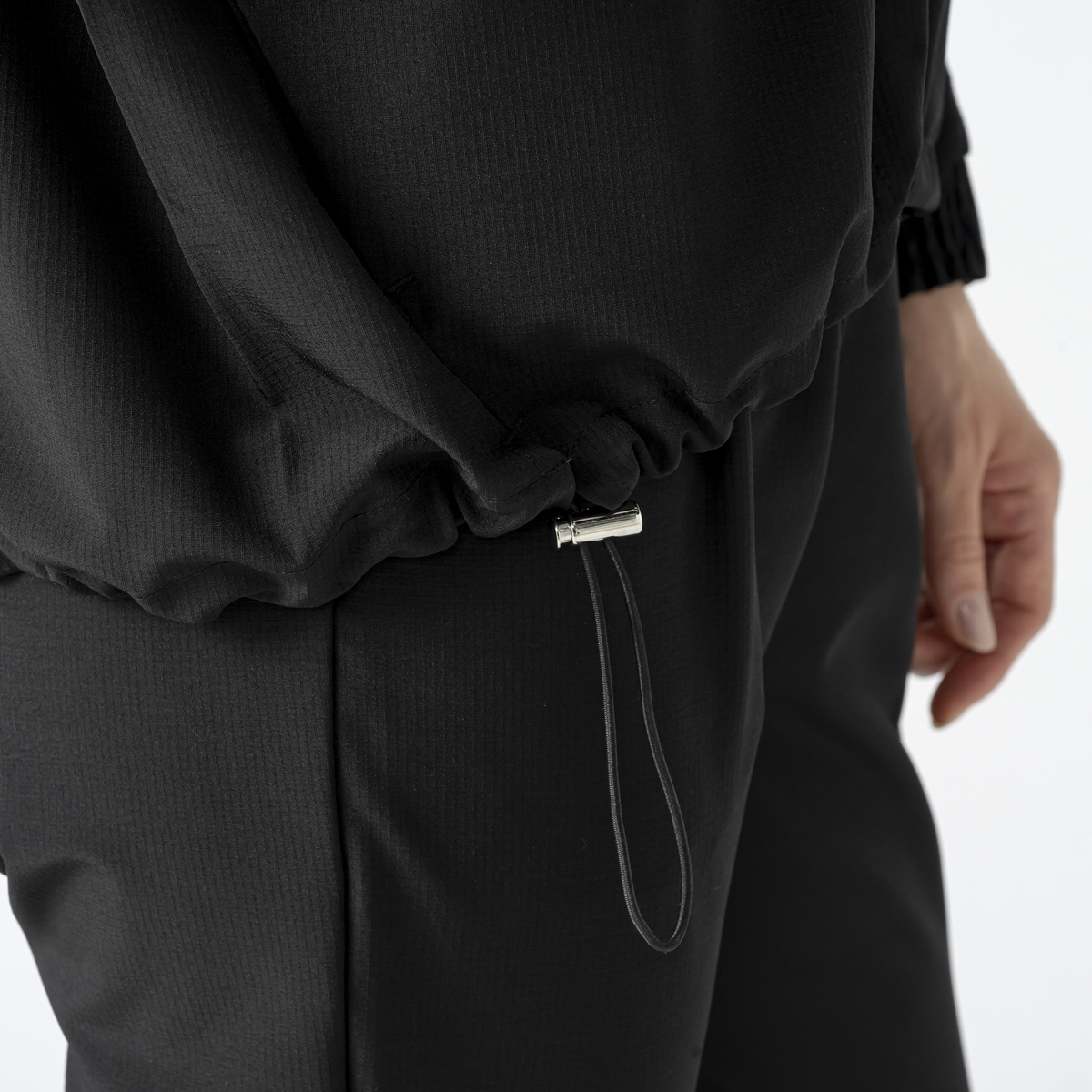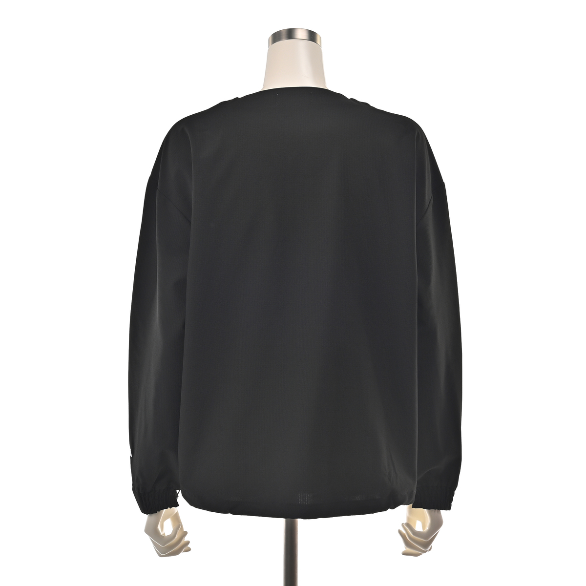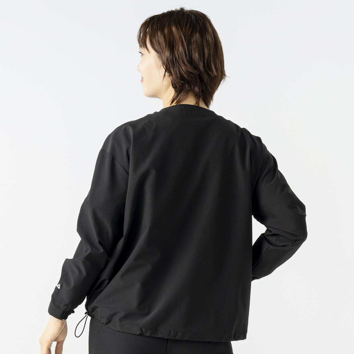 シルエットは丸みをもたせたフォルムで、裾と袖口にギャザーを入れ、前を閉めても開けてもすっきり見える仕立てに。裾はスピンドルで好みのフィット感に調整できます。左袖口にはロゴ刺繍でアクセントを添えています