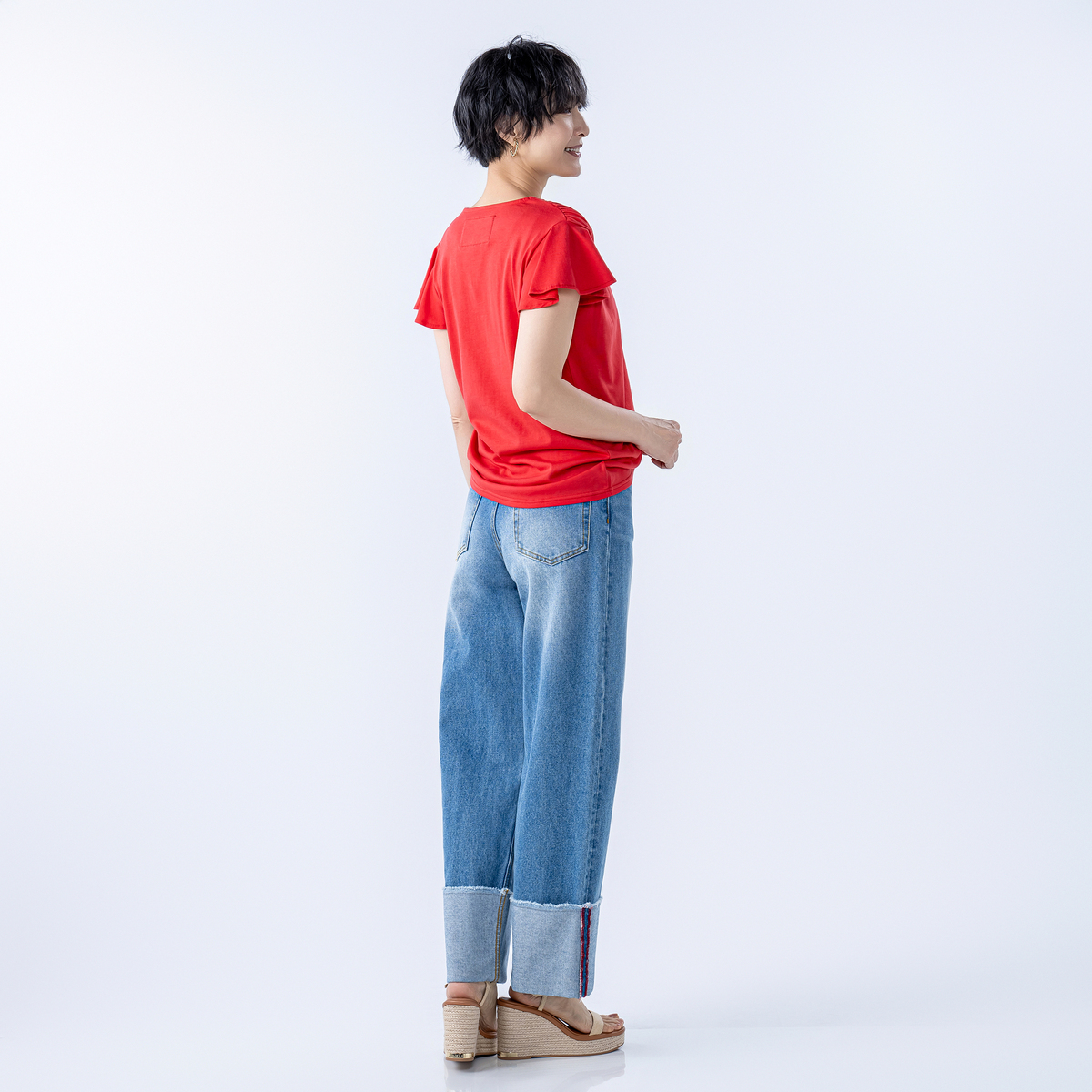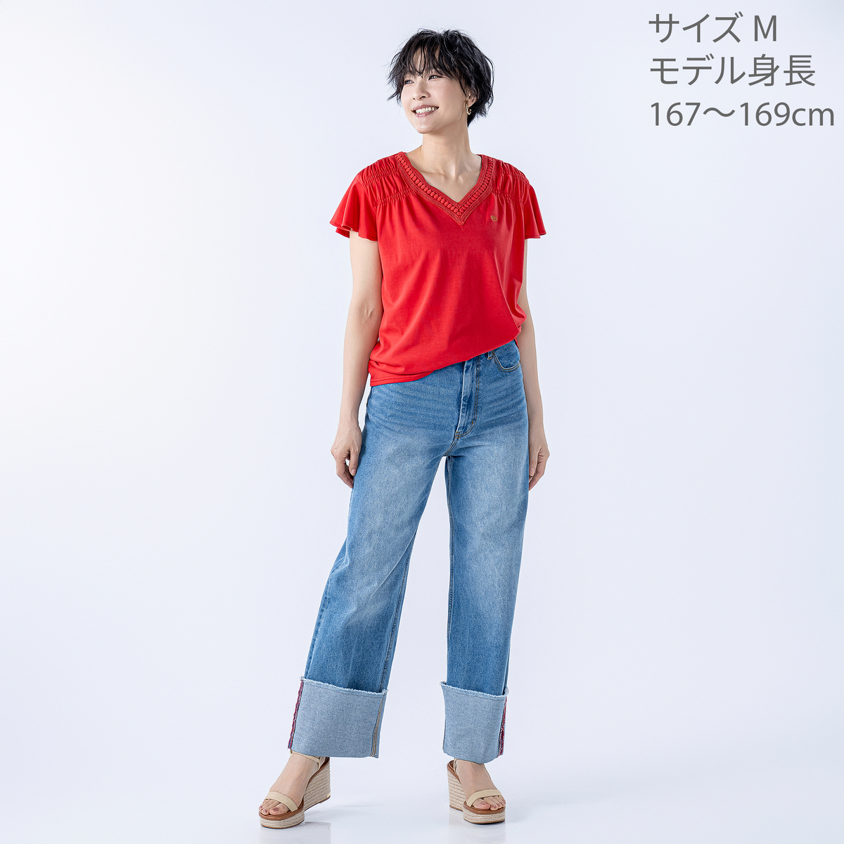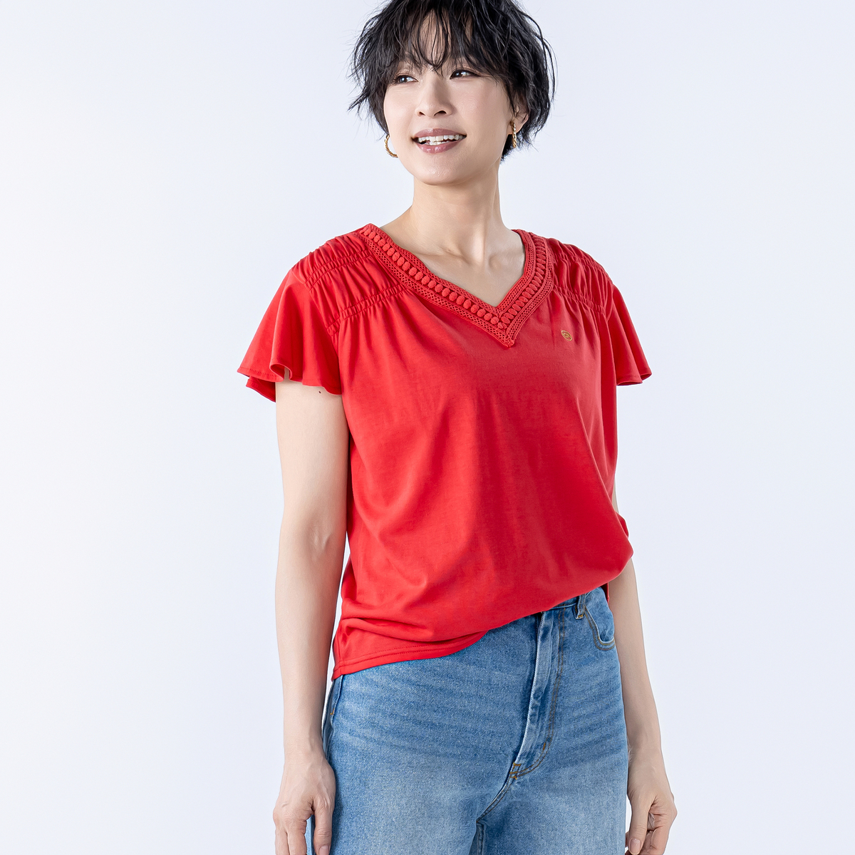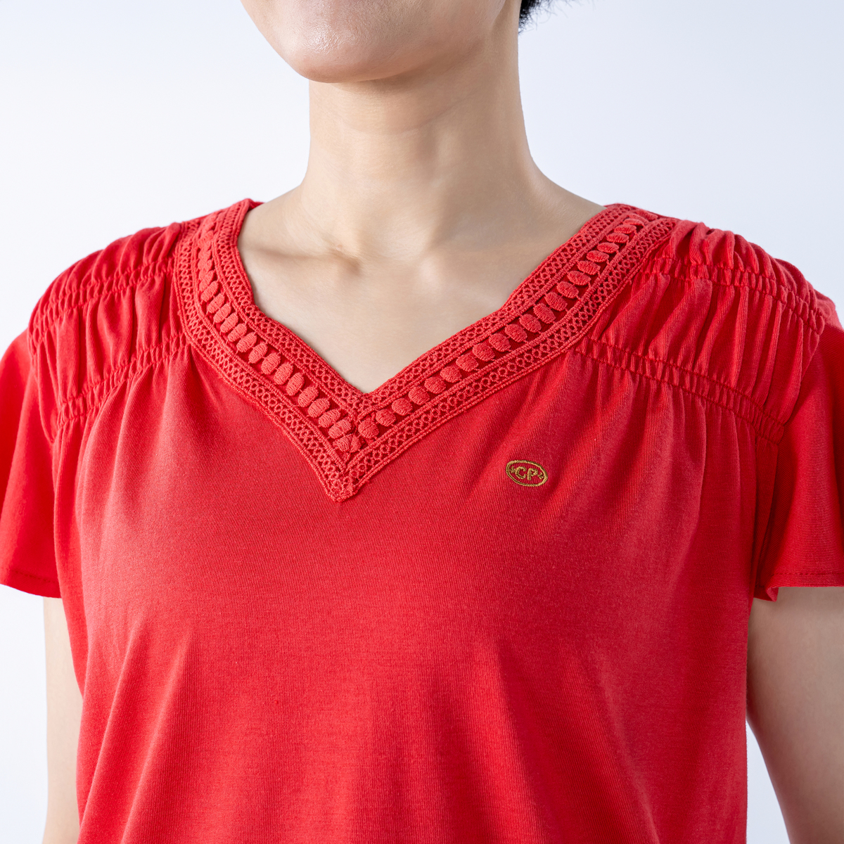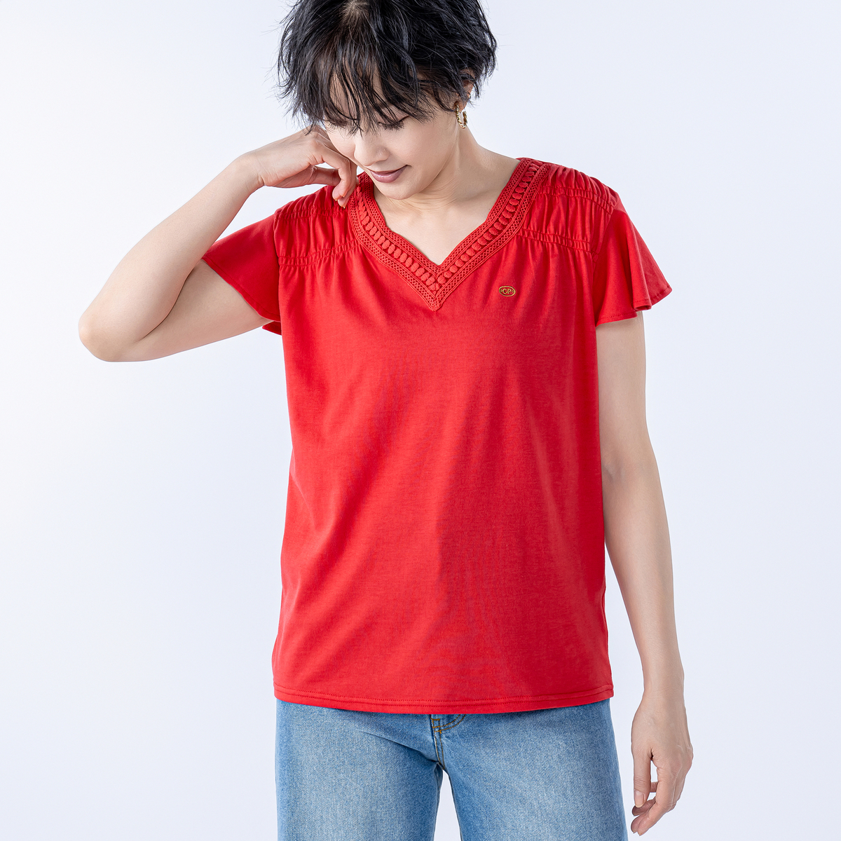 首元に身生地と同色のレースをあしらったVネックプルオーバー。肩周りにはシャーリングを施し、肩から腕のラインがすっきり見えます