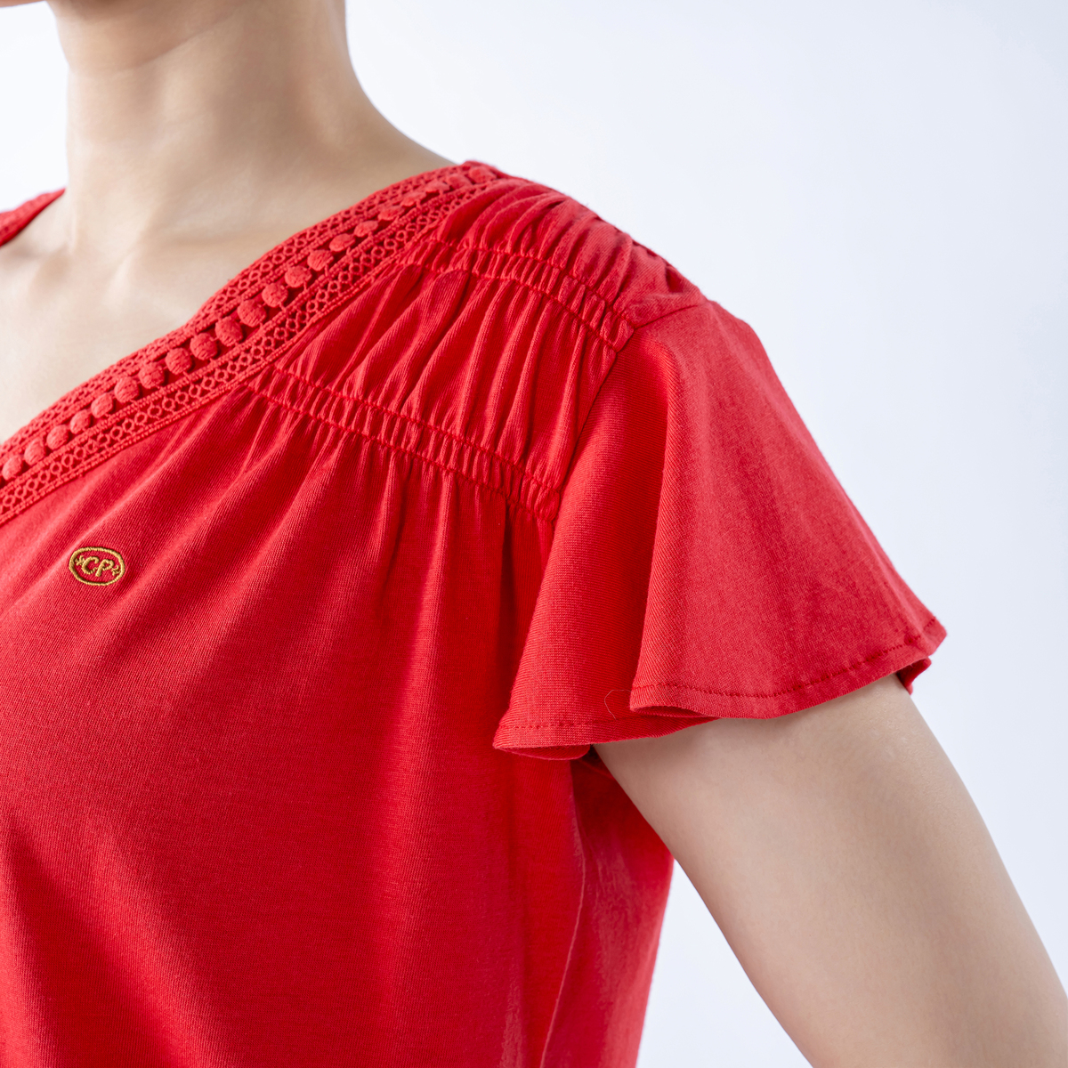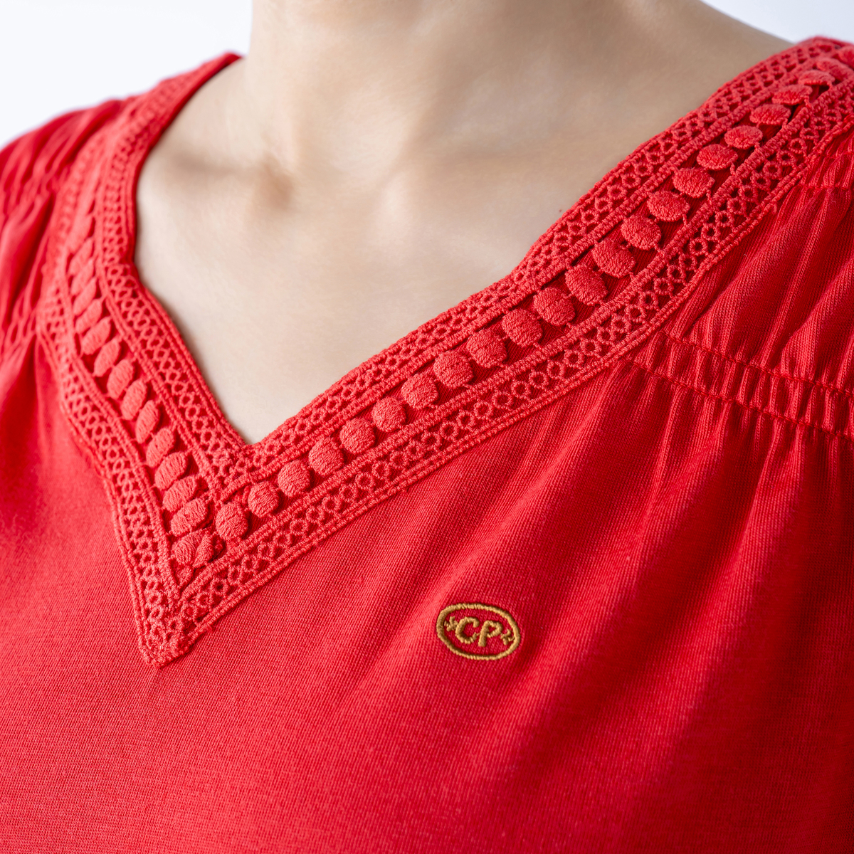 サラッとした肌触りのカットソー天竺素材を使用。胸元にはさりげなくワンポイント刺繍をあしらいアクセントになっています