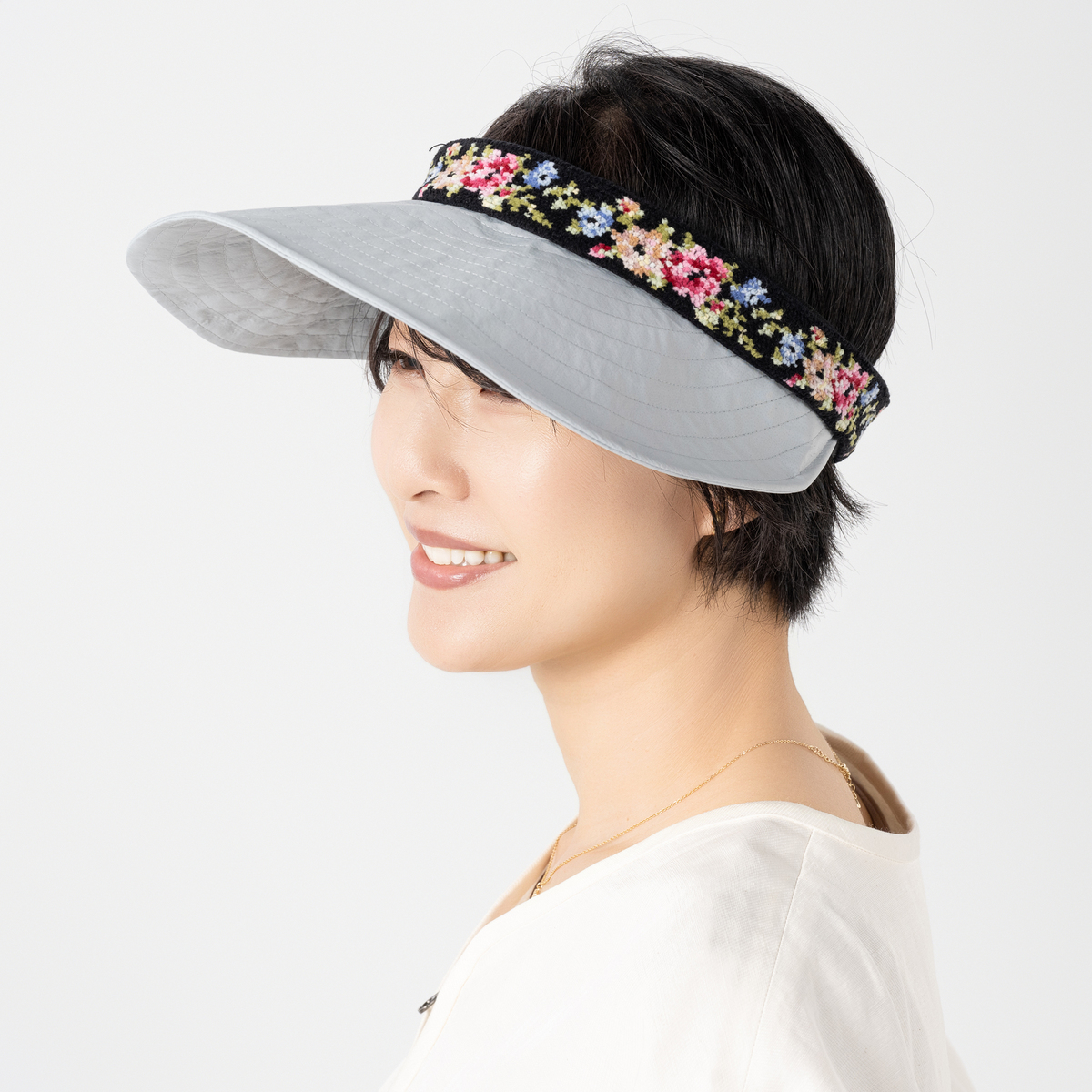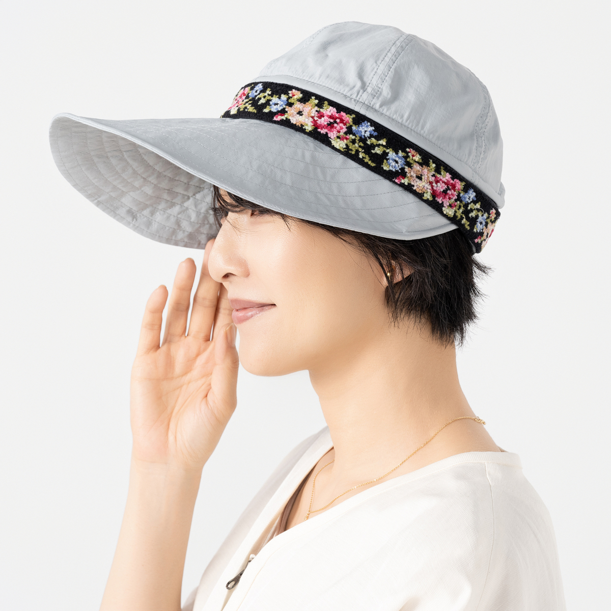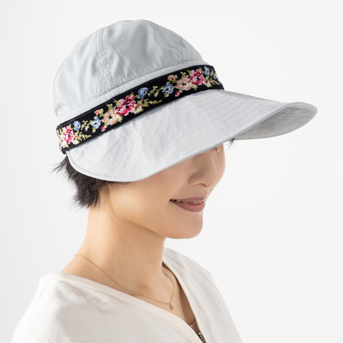 ソフトな生地感のキャップ。ファスナーで頭部を取り外してサンバイザーとしても使えます。プラントモチーフのシェニール織テープがアクセントに。カジュアルなスタイルにも、ちょっとしたお出かけにも合わせやすく、コーディネートの幅が広がります