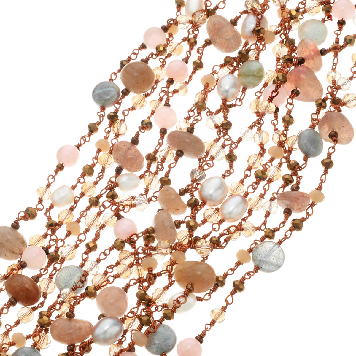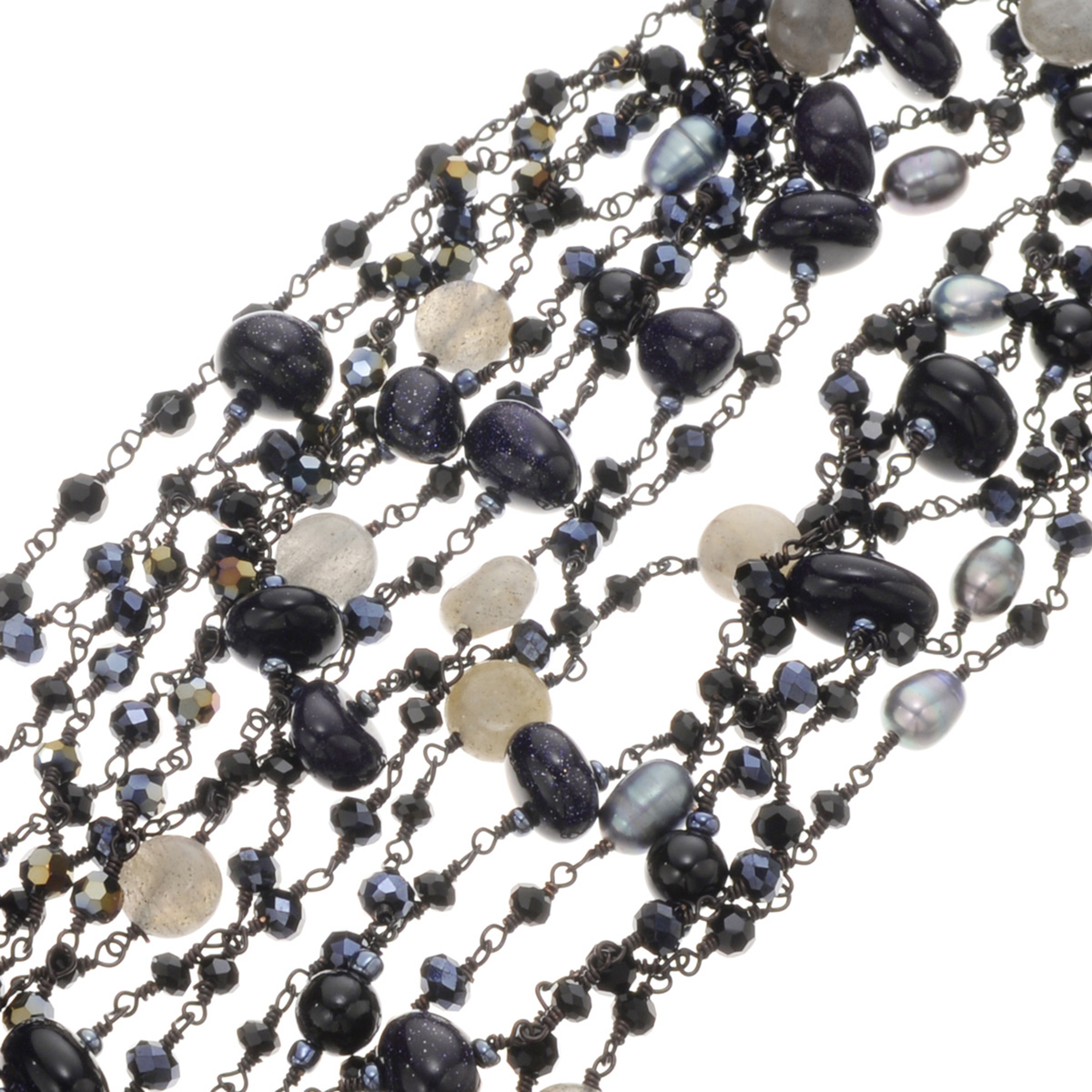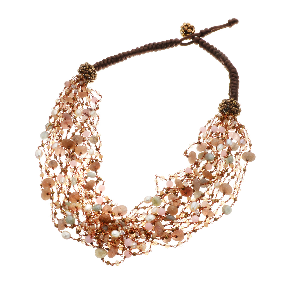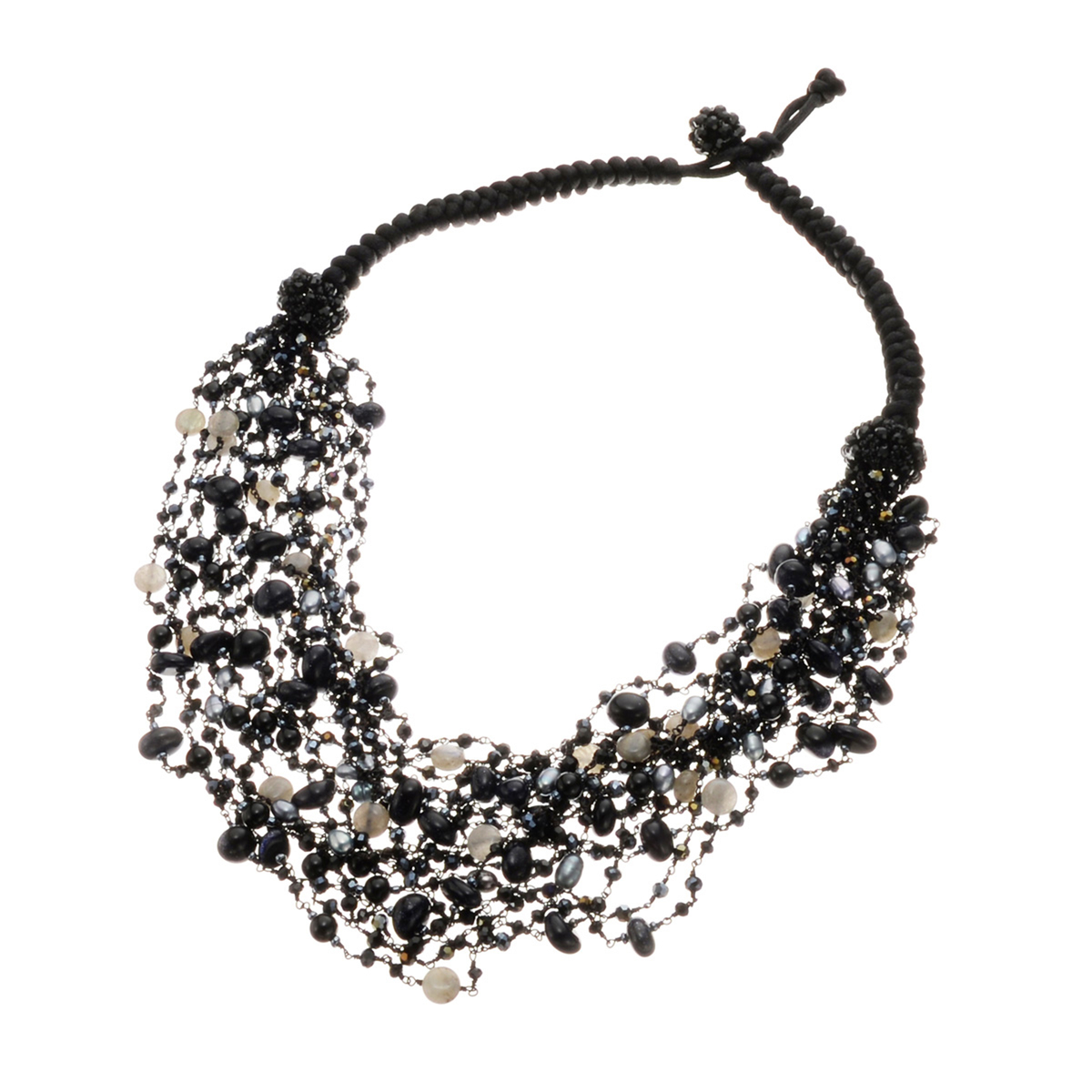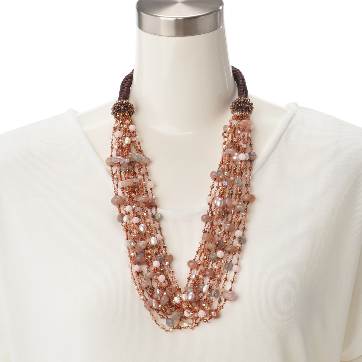 ボリューミーなデザインが特長の、存在感あるネックレスです。フェルスパー、パールなど様々なパーツで表情豊かにデザイン。ブラウンとブラックの2色ご用意しました