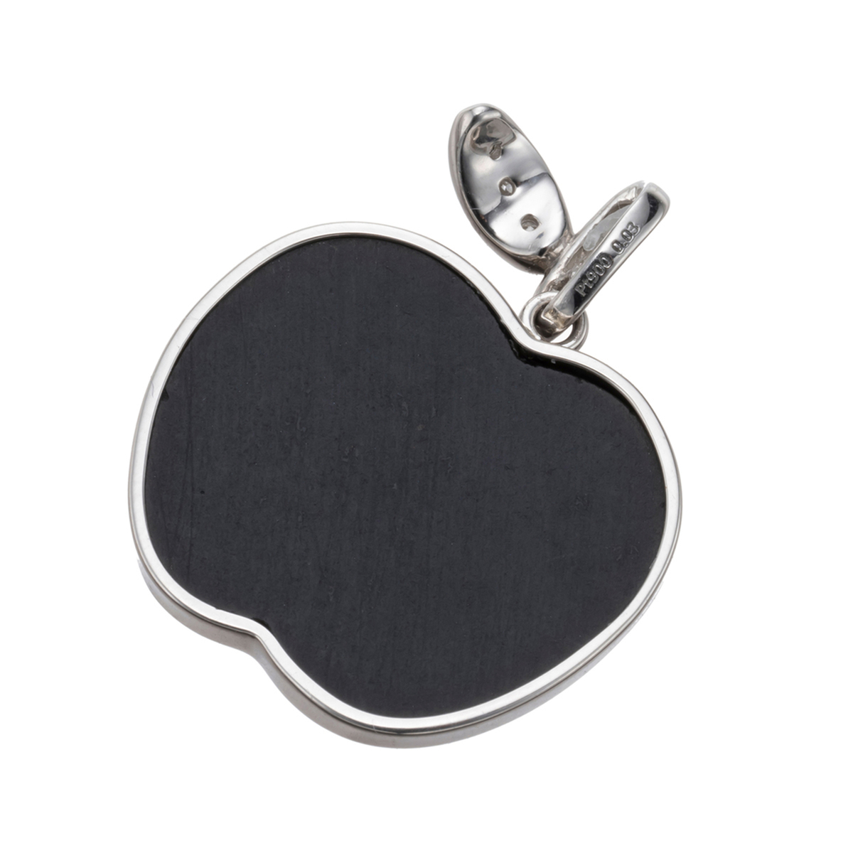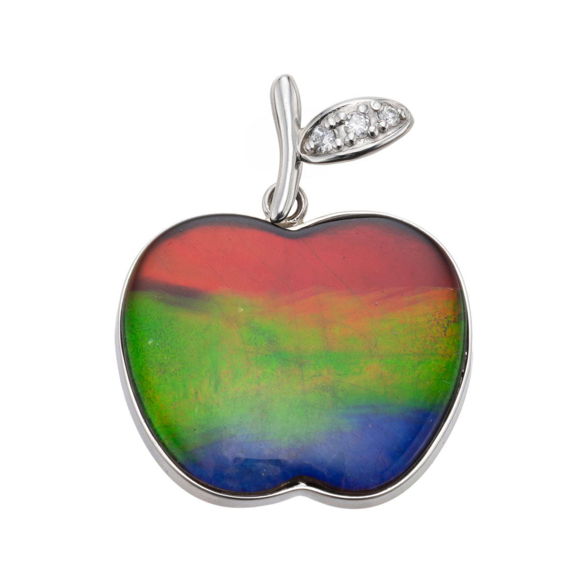 リンゴ型にアンモライトを切り出した、愛らしいペンダントヘッド。リーフ部分にはダイヤモンドを配し、地金にはプラチナを使って、アンモライトの美しい色彩を引き立てています
