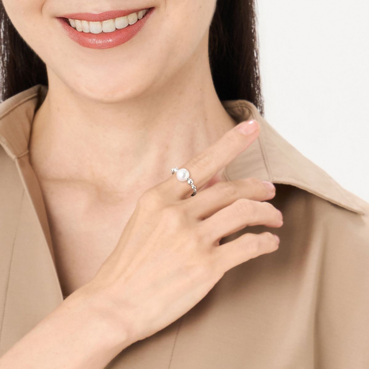 中芯に形状記憶合金を用いたフリーリング。8〜20号の指に対応し、8.0mmUPのセミラウンドのアコヤ真珠が手元に穏やかな輝きを添えます。気分や装いに合わせて、お好きな指で楽しめます