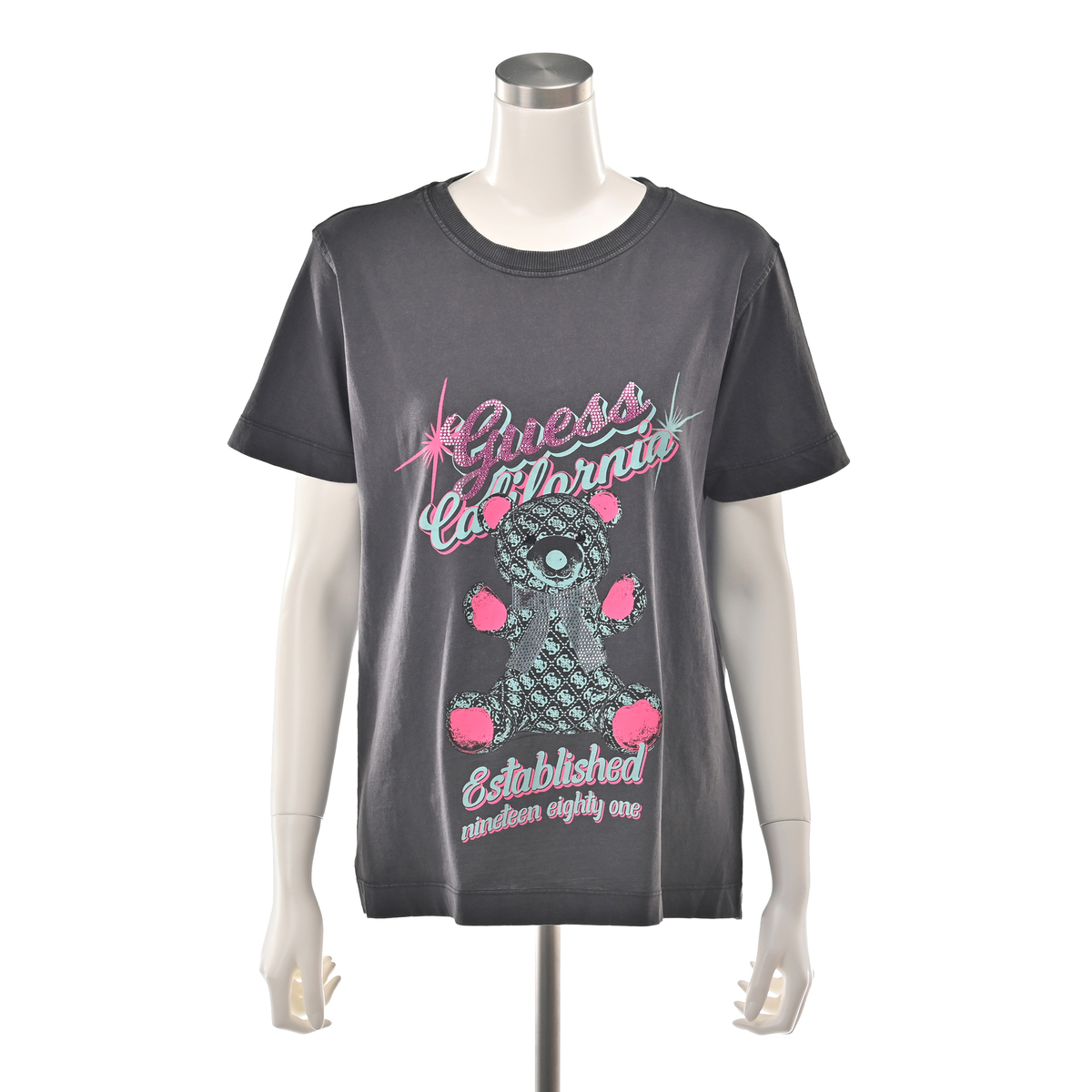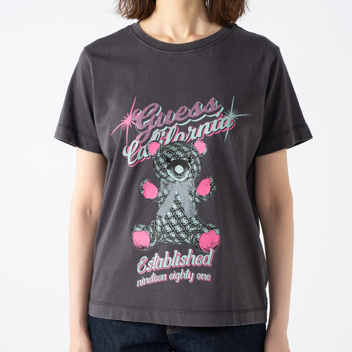 落ち着いた色合いのボディに、鮮やかなGUESSベアのプリントが映えるTシャツ。存在感がありながら幅広いアイテムと合わせやすく、パンツはもちろん裾を結んでスカートに合わせたり、ジャケットやパーカーのインナーにも活躍します