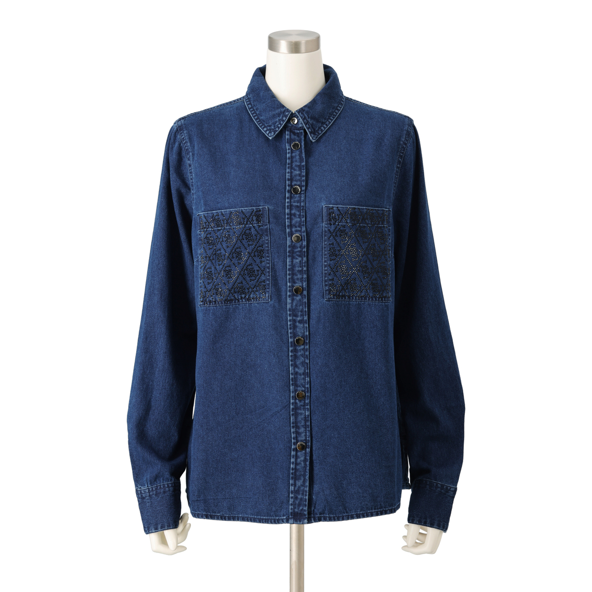 胸元の刺繍が印象を引き締める、デザイン性のあるデニムシャツ。個性的なポケットが全体にリズムを添え、程よいフィット感で一枚でも着映えします。インナーやニットとの組合せも自然に馴染み、季節を通して気分に合わせた表情が楽しめます