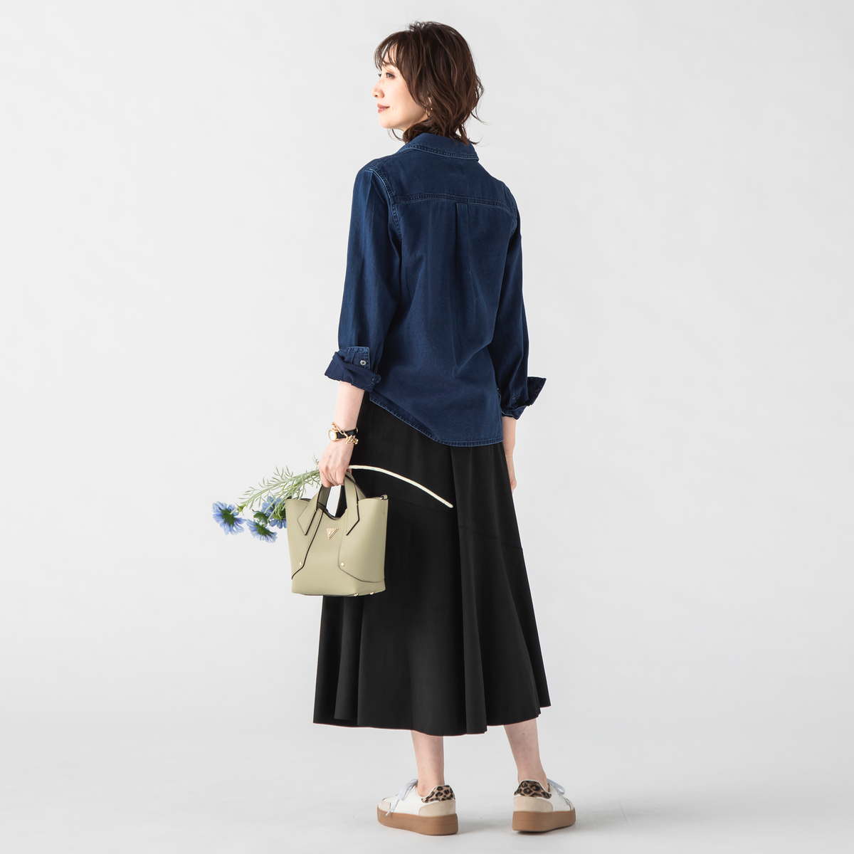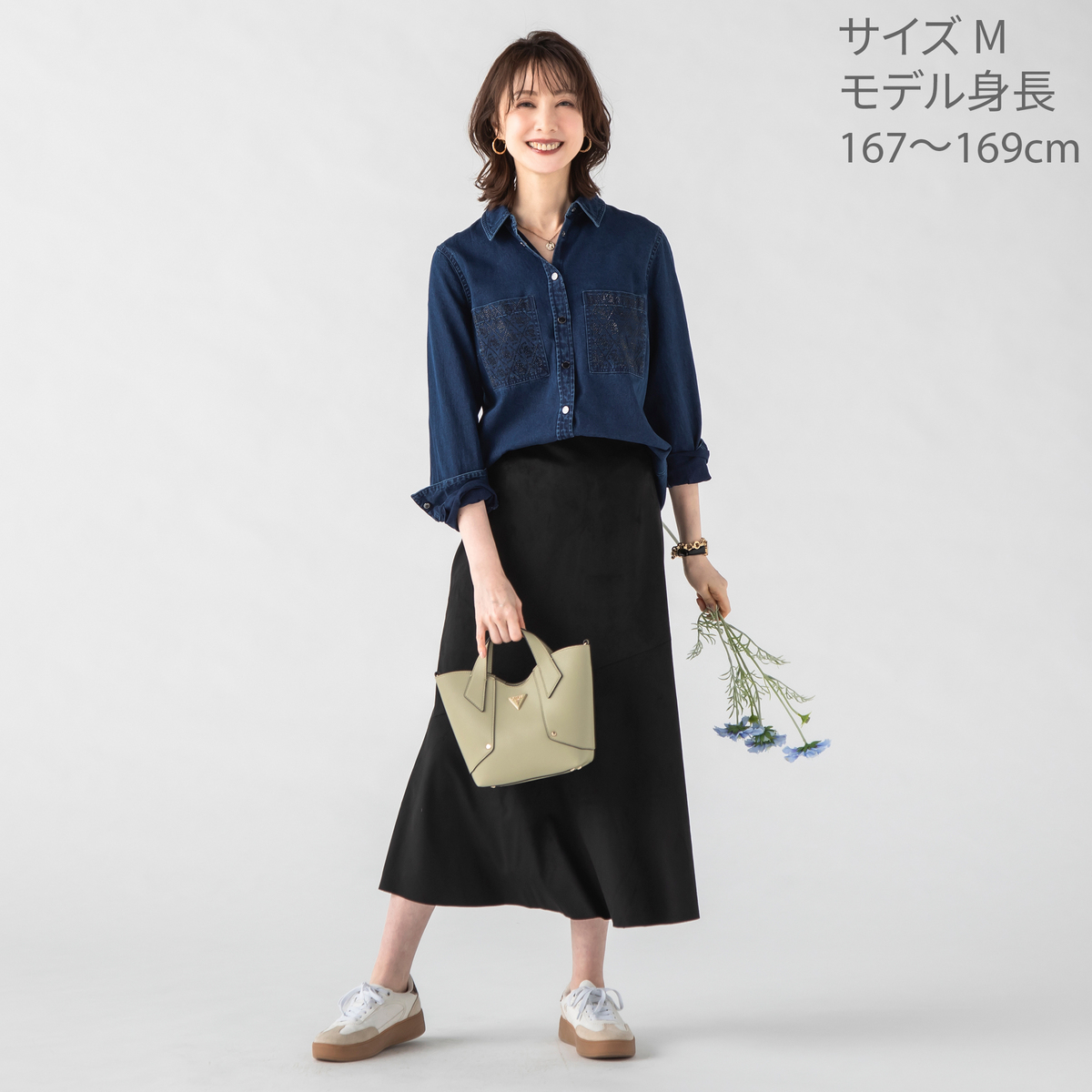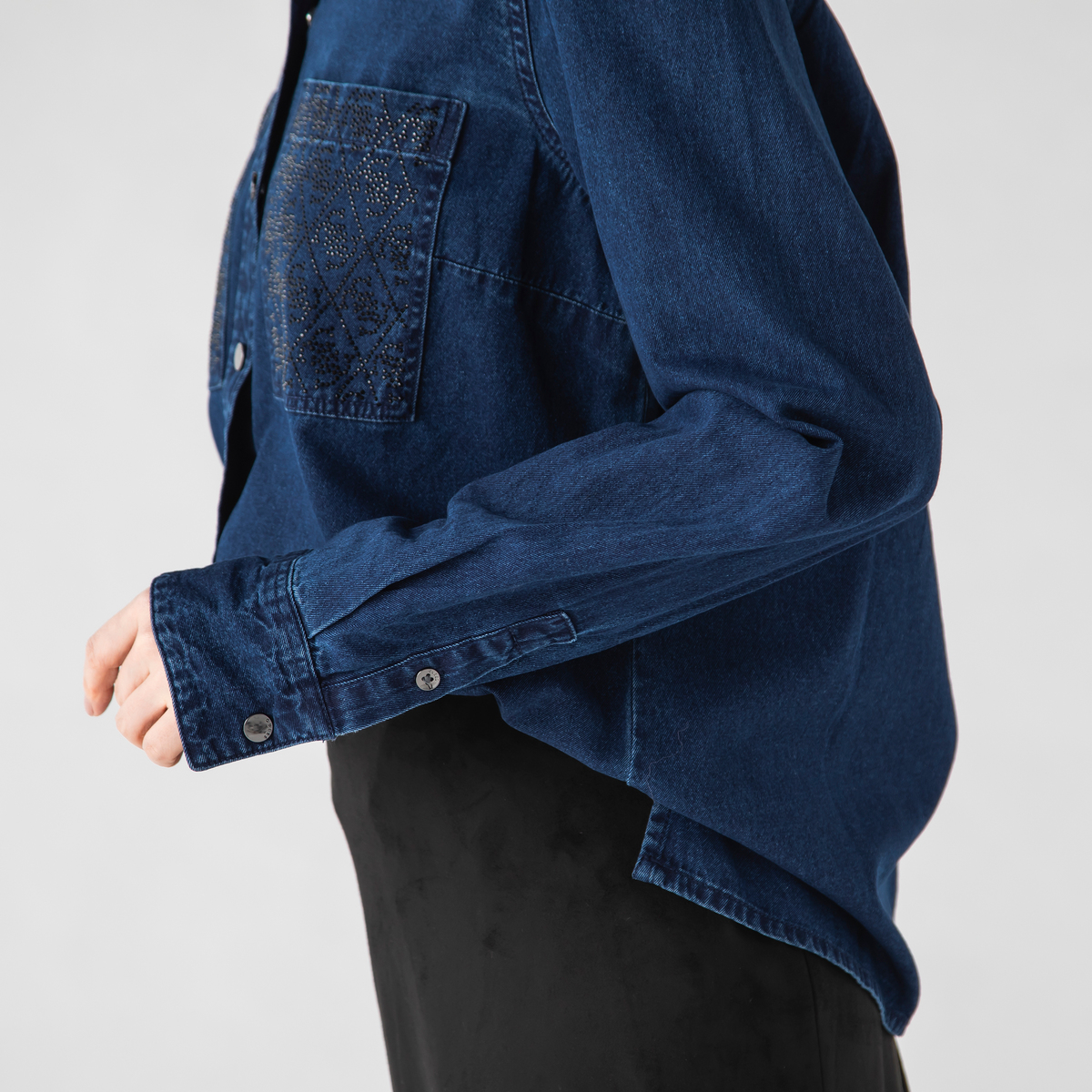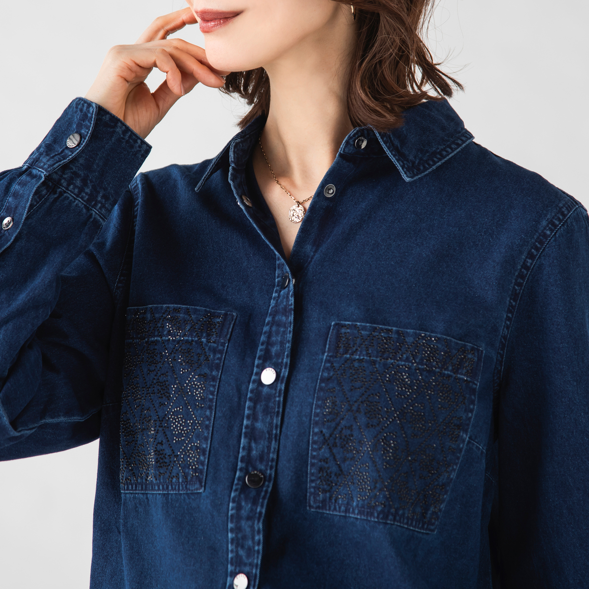 胸元の刺繍が印象を引き締める、デザイン性のあるデニムシャツ。個性的なポケットが全体にリズムを添え、程よいフィット感で一枚でも着映えします。インナーやニットとの組合せも自然に馴染み、季節を通して気分に合わせた表情が楽しめます
