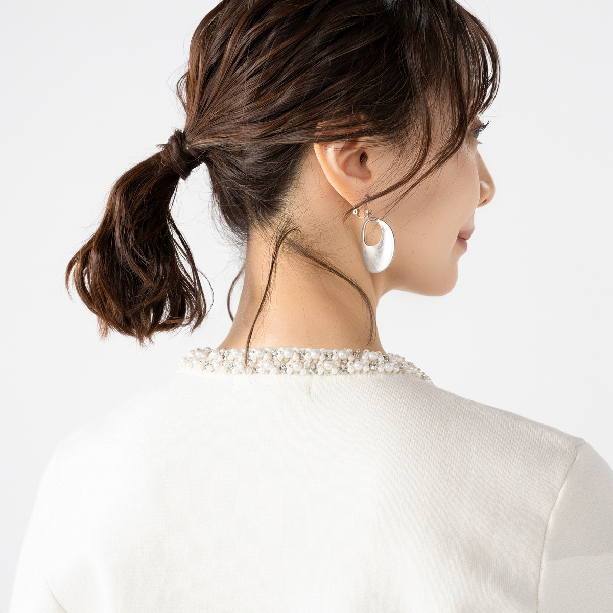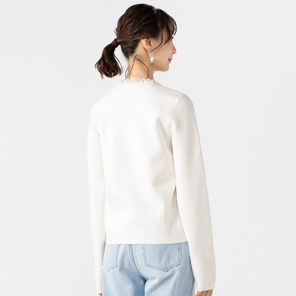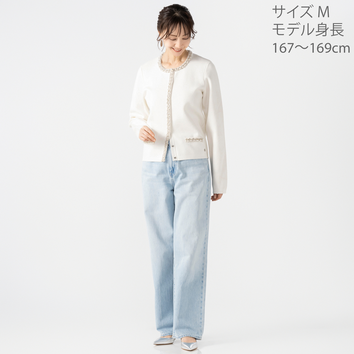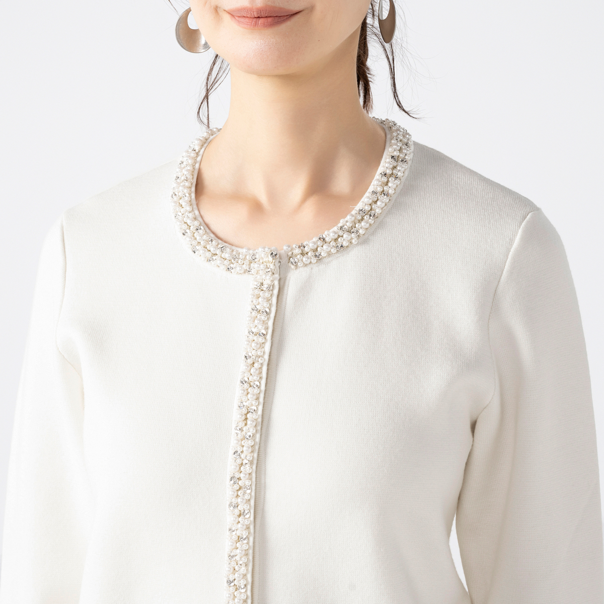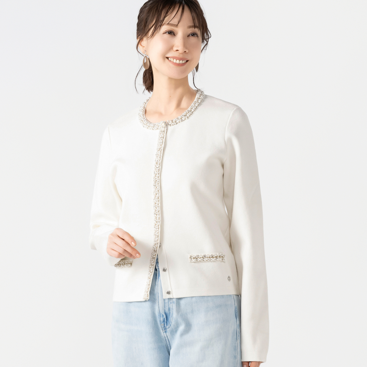 首元や飾りポケット、ボタンラインに煌めくビジューを散りばめたニットカーディガン。華やかさがありながらも優しい雰囲気に仕上げました