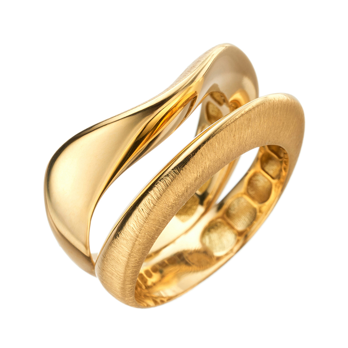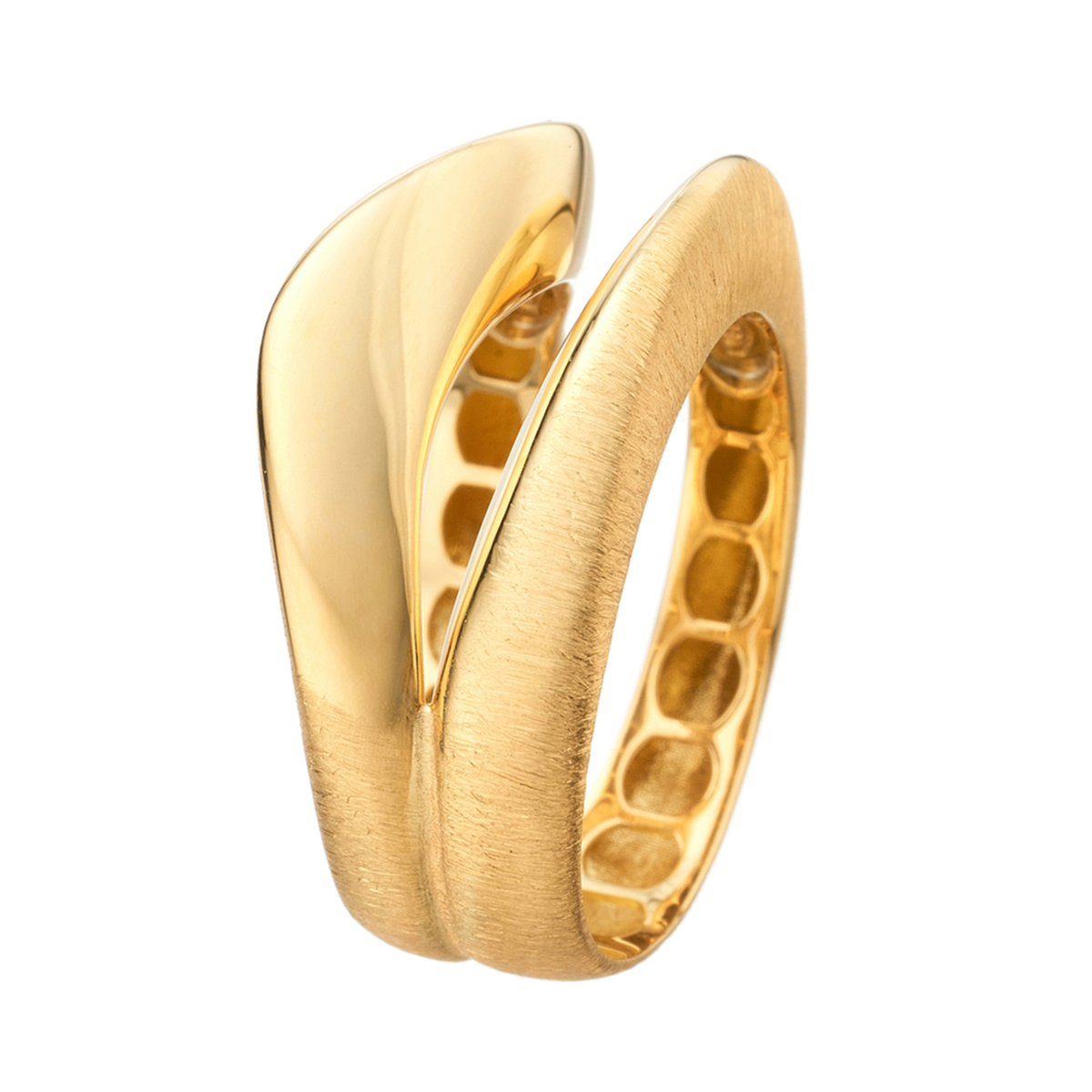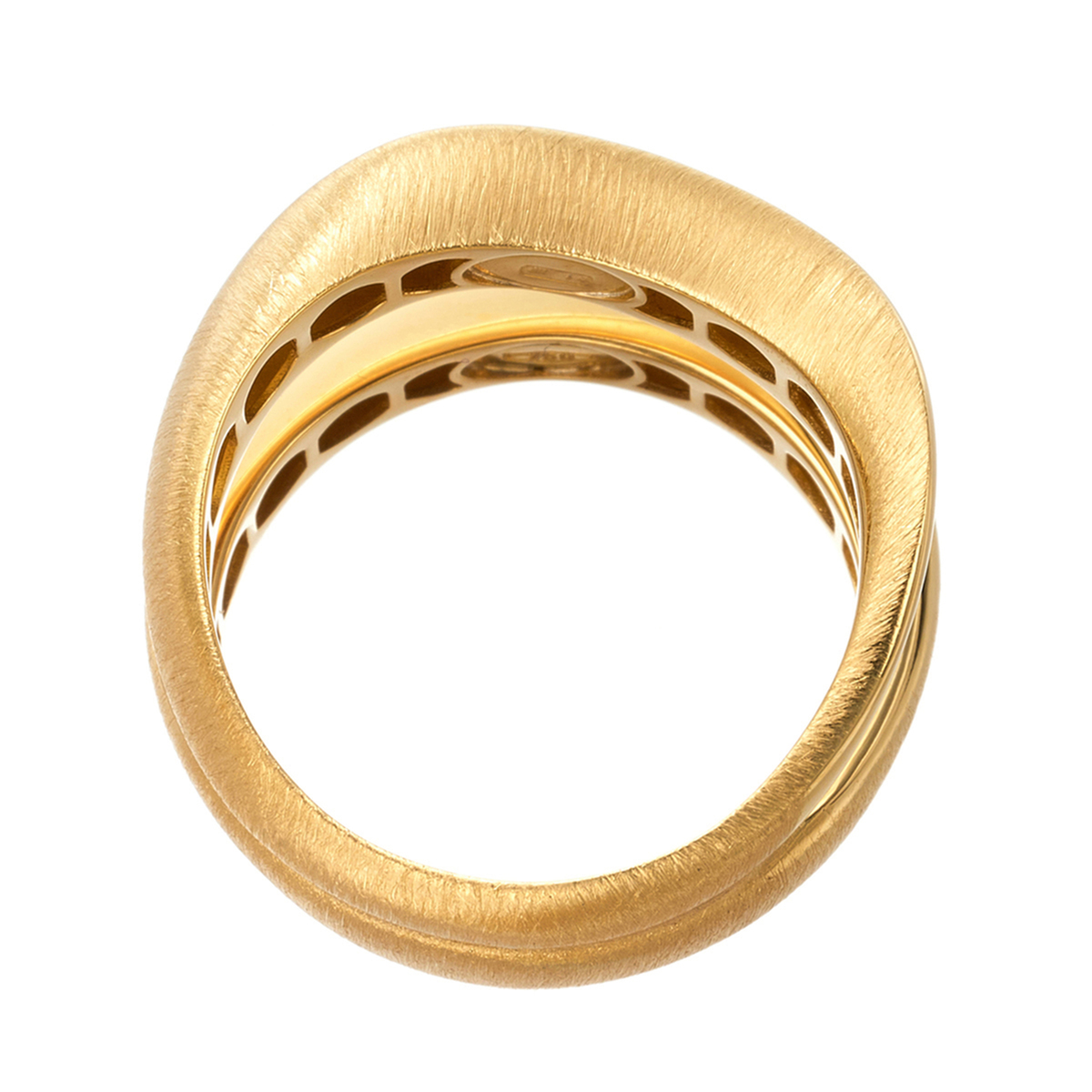流れるように美しいラインでお手元を魅力的に演出する、18Kイエローゴールドのリング。イタリアならではのデザイン性と技術力が結集した、躍動感溢れる個性的なデザインです。全体的にサテンのような仕上げの中に、鏡面の部分がアクセントになり、優美な存在感を感じさせます