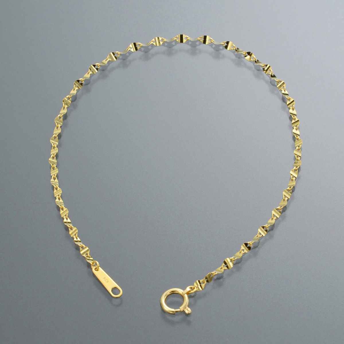 純金の表情豊かな輝きが楽しめる、ペタルチェーンのブレスレットです。鏡面プレスにより、花びらのように幅感をもったパーツの向きが交互につながったデザイン。様々な角度から光を受け、まばゆい輝きを放ちます