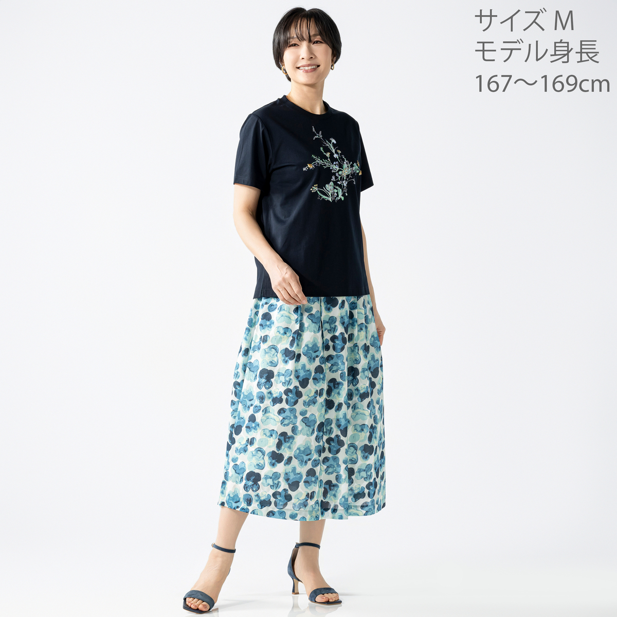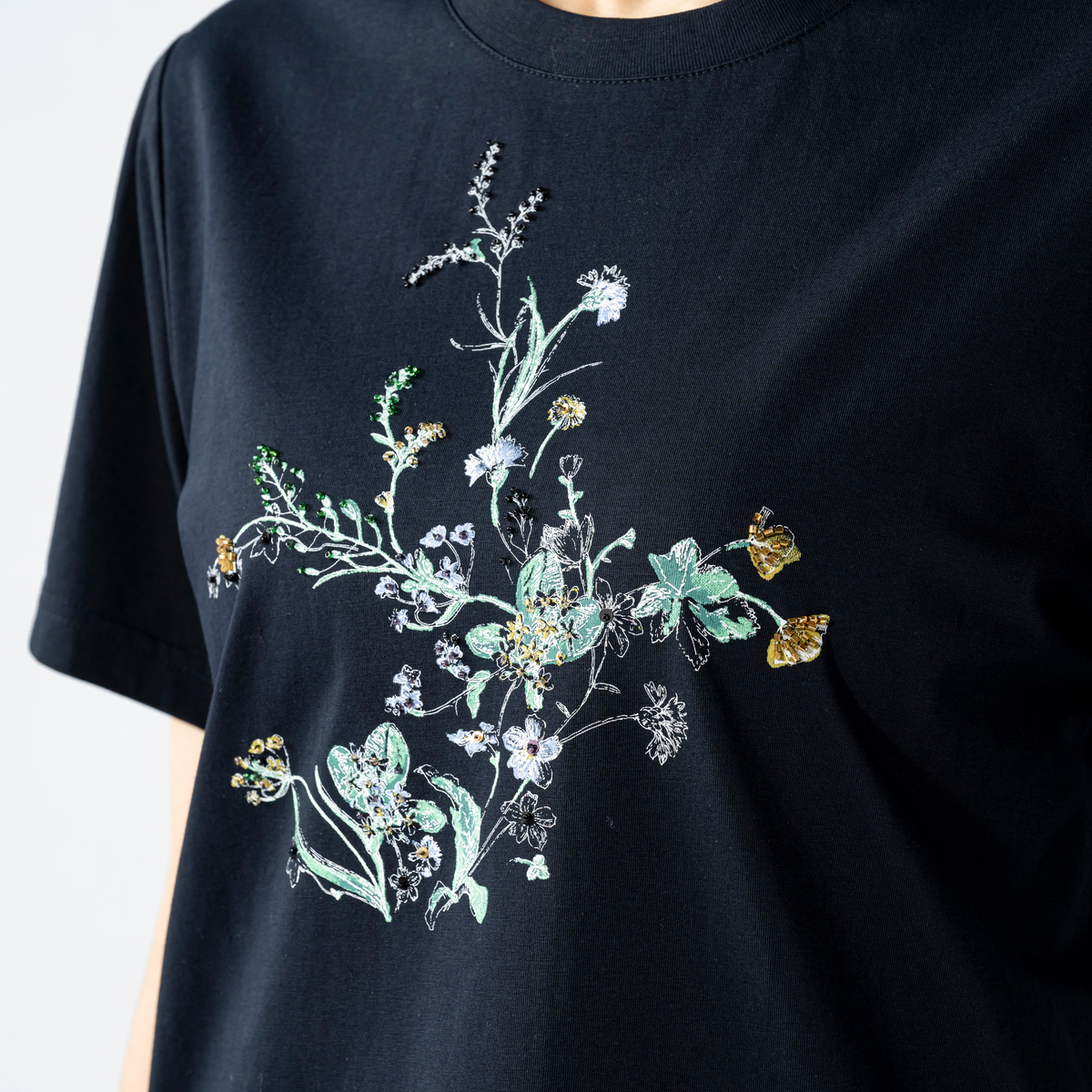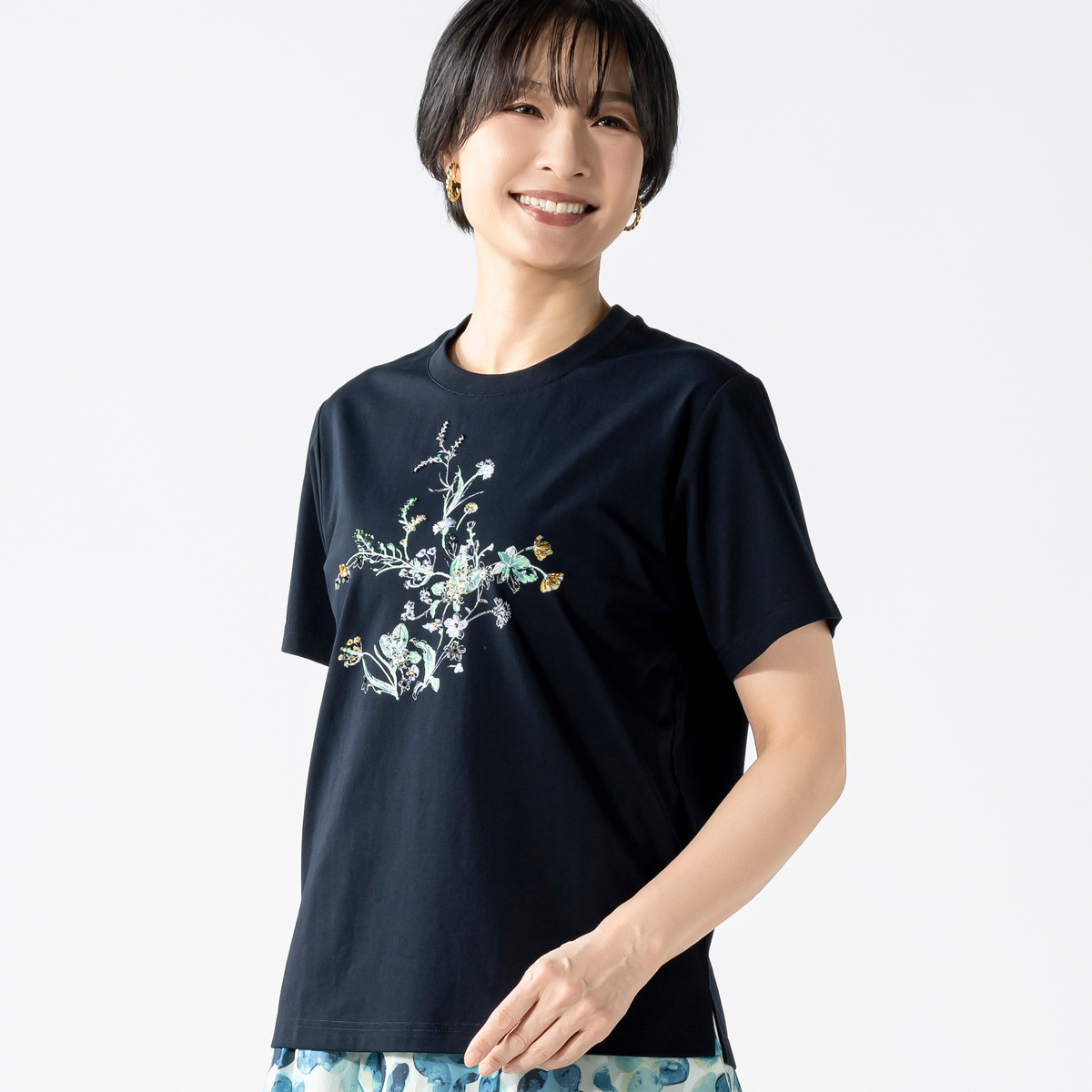 プリント柄に手付けでビーズをあしらったTシャツ。細やかな装飾がコーデのポイントになってくれます