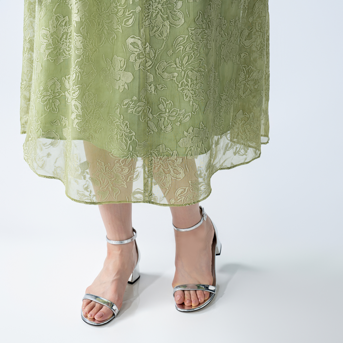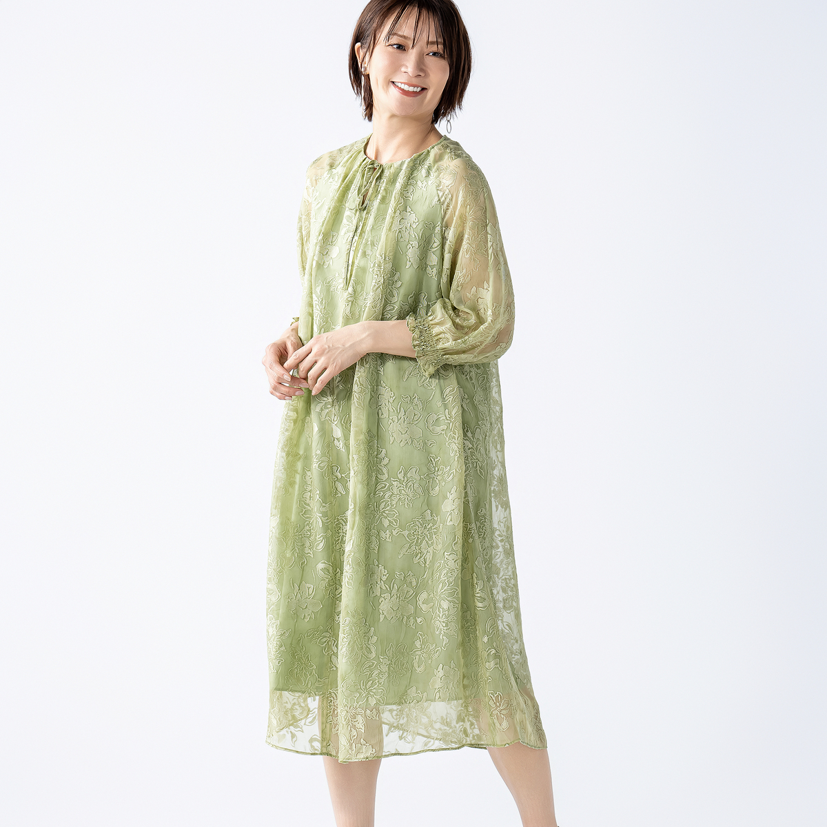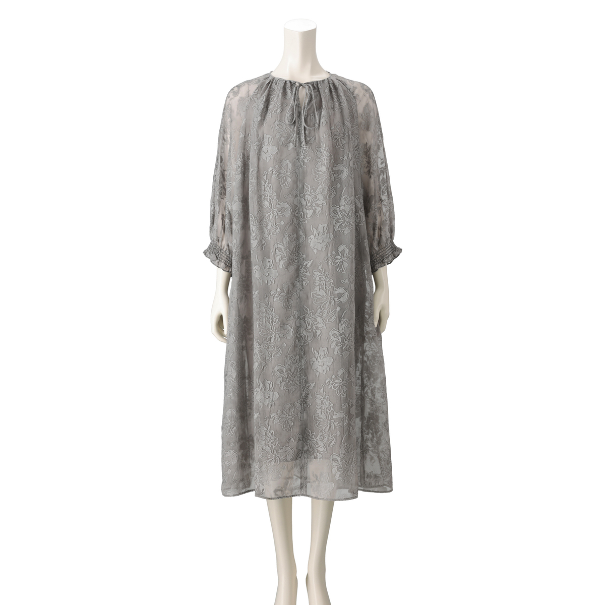 上品なフラワー柄が印象的なワンピース。ジャガード編みの素材に刺繍を施しました