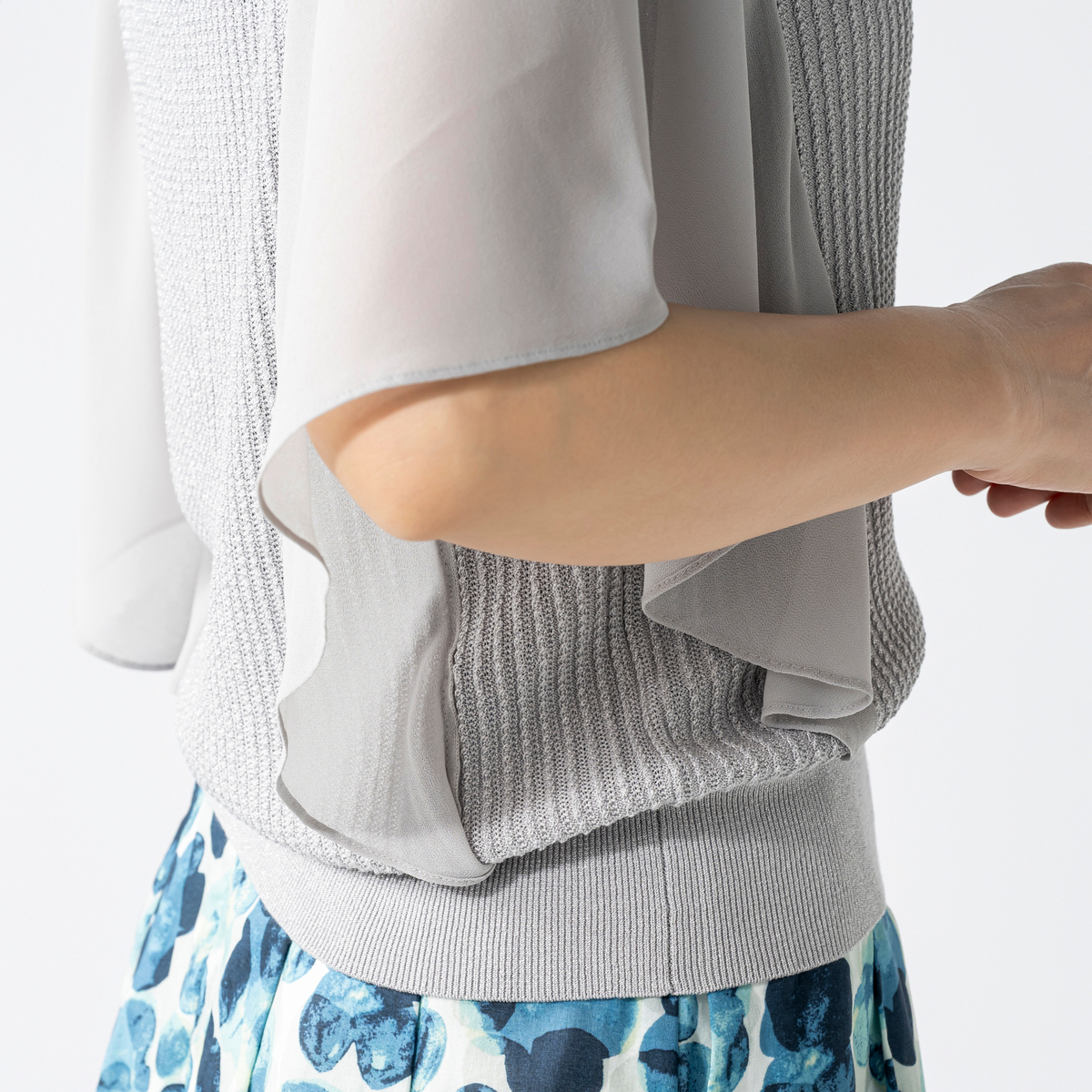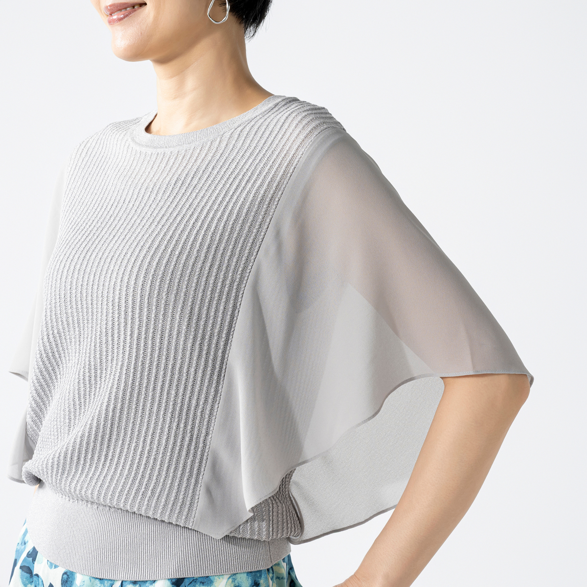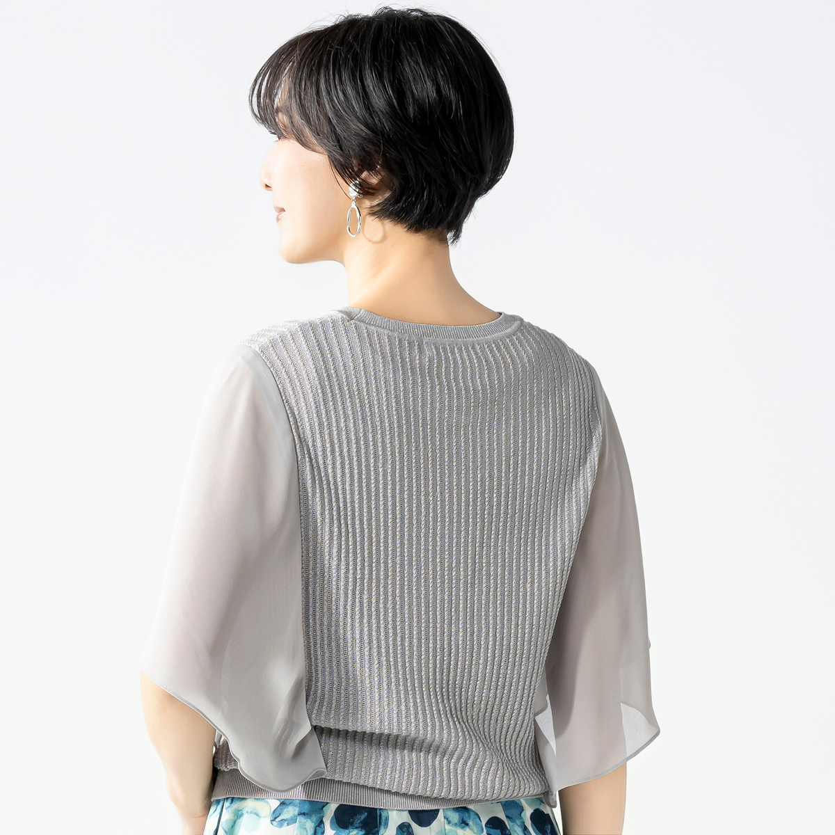 ニット本体には、サステナブルな再生繊維にシルクや5種類の糸をミックス。軽やかなポリエステル素材のスリーブが、動きに合わせてふんわりと揺れるデザインです