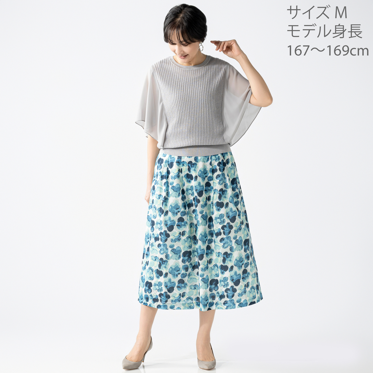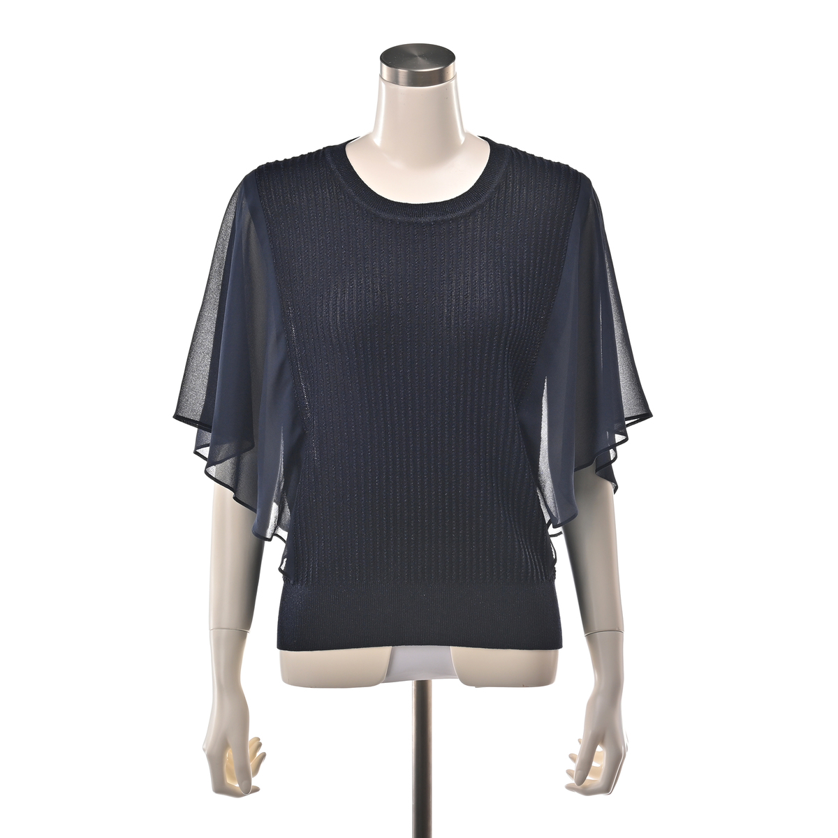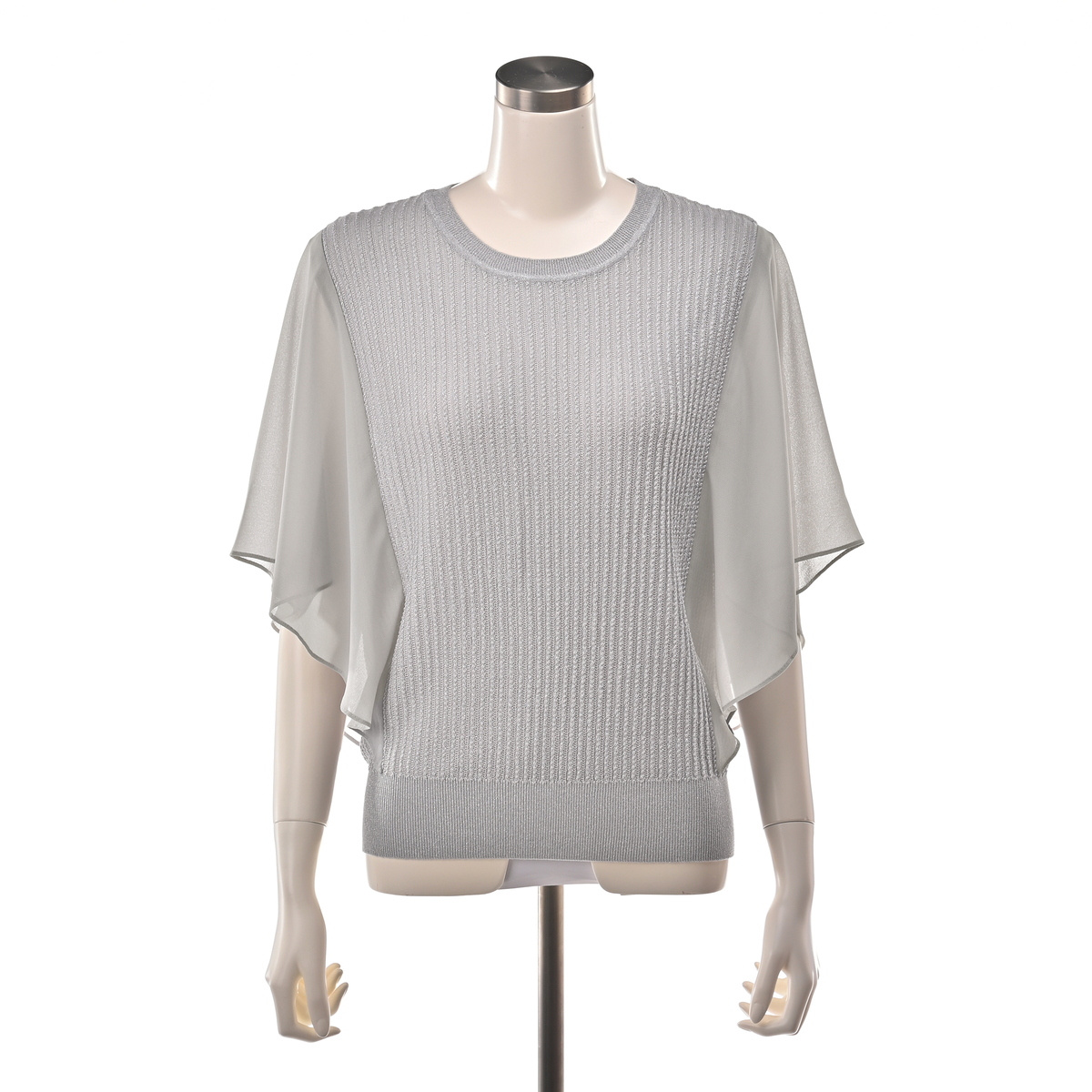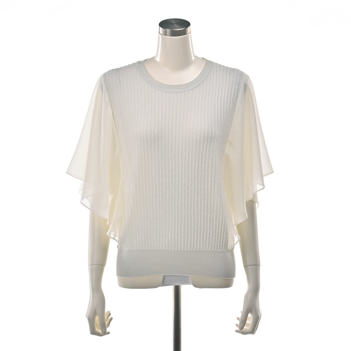ニット本体には、サステナブルな再生繊維にシルクや5種類の糸をミックス。軽やかなポリエステル素材のスリーブが、動きに合わせてふんわりと揺れるデザインです