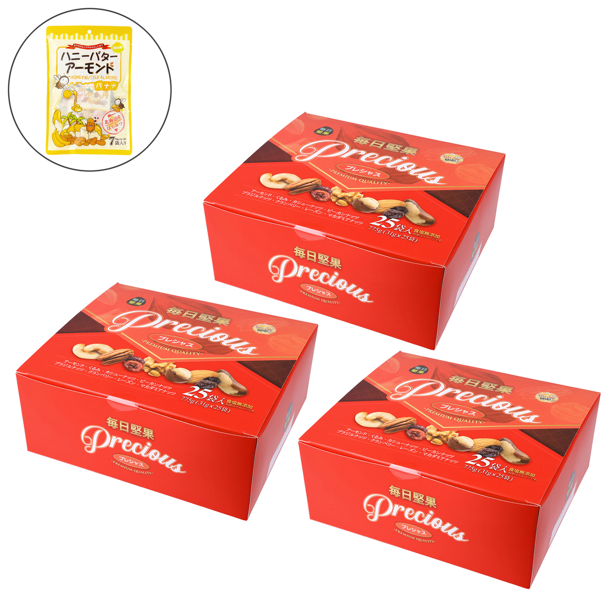 [アレルギー物質特定原材料8品目] くるみ [内容量] 775g(31g×25袋) [保存方法] 直射日光を避け、常温で保存してください [栄養成分表示] 1袋(31g)当たり エネルギー192.5kcal/たんぱく質5.3g/脂質16.1g(飽和脂肪酸1.8g、n-3系脂肪酸0.5g、n-6系脂肪酸5g、トランス脂肪酸0g)/コレステロール0mg/炭水化物7.8g(糖質5.7g、食物繊維2g)/食塩相当量0.003g/ビタミンB1 0.1mg/ビタミンB2 0.1mg/ビタミンB6 0.08mg/ビタミンE2.8mg/亜鉛0.8mg/鉄0.8mg/銅0.3mg/マグネシウム58.9mg/カリウム182mg/カルシウム41.5mg/マンガン0.6mg /セレン8.7μg オレイン酸7g/α-リノレン酸0.5g/ロイシン0.33g/イソロイシン0.18g/バリン0.22g [お召し上がり方] 開封後はお早めにお召し上がりください [注意事項] ※まれに原材料の皮や殻が残っている場合がありますので、ご注意ください ※農作物のため色、形状にばらつきがあります ※ミックス商品のため内容にばらつきが生じることがあります ※ドライフルーツの水分によりナッツがしっとりした食感になる場合がありますが、品質に問題ございません ※予告無く仕様を変更する場合があります ※本品1袋(31g)あたりのセレン含有量は8.7μg です。日本人の18歳以上男女の1日のセレン耐容上限量は350〜450μgとされています(「日本人の食事摂取基準(2020年版)」より)食べ過ぎにはご注意ください ※本品は食品です [原料原産地] アーモンド(アメリカ) [原産国] 日本 [セット内容] ・毎日堅果プレシャス50袋セット ・毎日堅果プレシャス25袋セット ・ハニーバターアーモンドバナナ12g7袋セット(プレゼント) [原材料] アーモンド(アメリカ)、くるみ、カシューナッツ、ピーカンナッツ、ブラジルナッツ、乾燥クランベリー(クランベリー、砂糖、植物油脂)、レーズン(レーズン、植物油脂)、マカダミアナッツ [原材料] アーモンド(アメリカ)、くるみ、カシューナッツ、ピーカンナッツ、ブラジルナッツ、乾燥クランベリー(クランベリー、砂糖、植物油脂)、レーズン(レーズン、植物油脂)、マカダミアナッツ