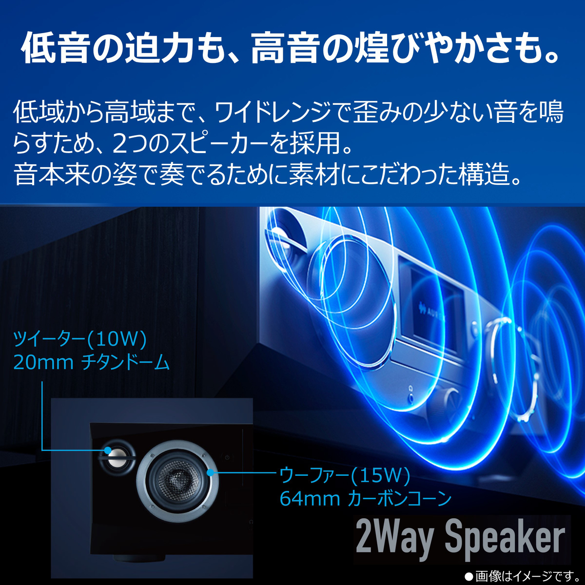 *2ウェイスピーカーを駆動するため、総合出力50Wのツイーターとウーファー専用のマルチアンプを使用しています