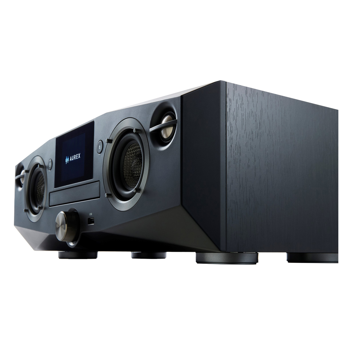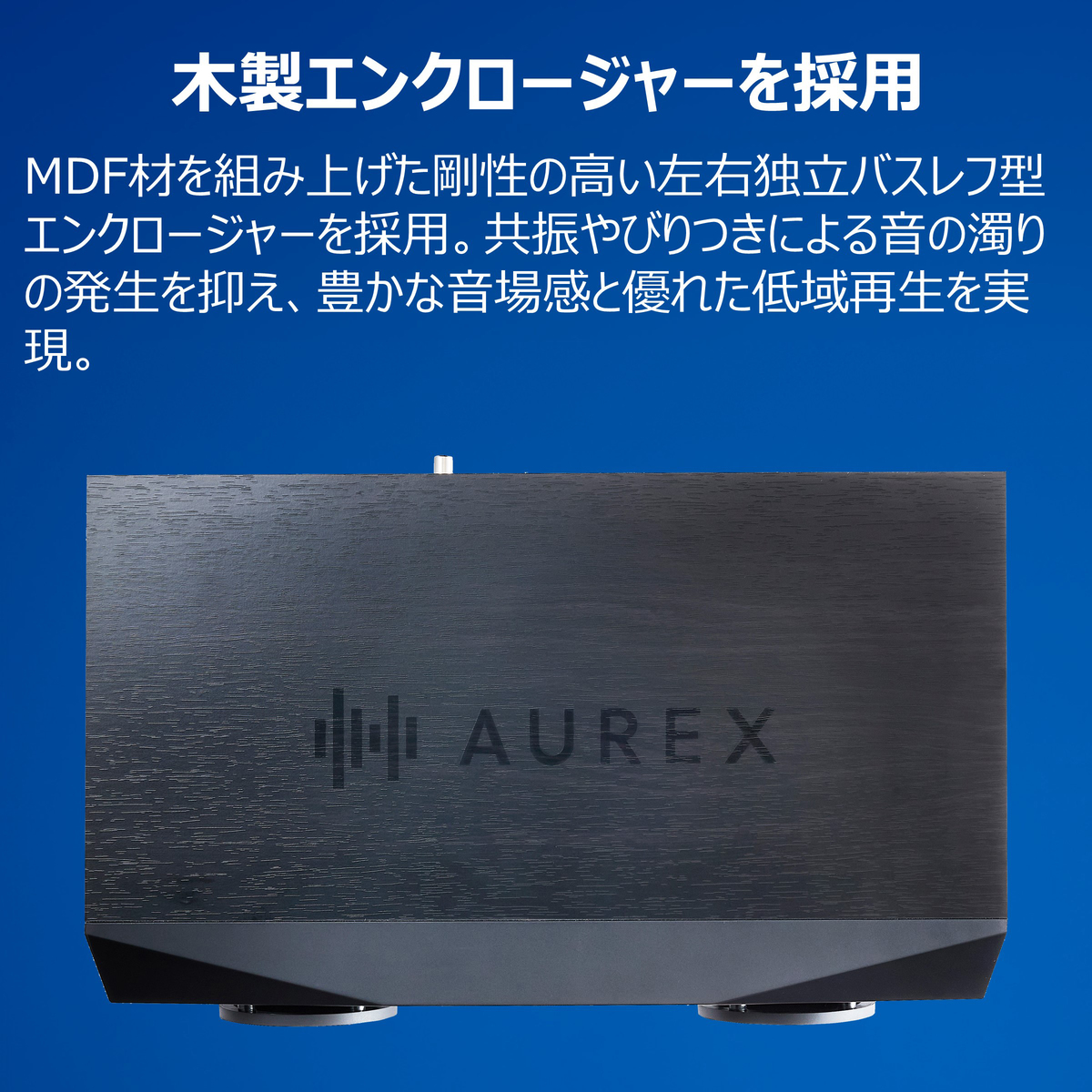 チタンドームツイーターやカーボンコーンウーファーを採用し、低音から高音までバランスよく再生*。木製エンクロージャーが豊かな音声感と優れた低域再生を実現。直方体のエッジ回折による周波数特性の乱れを軽減し、音場感を豊かに再現します