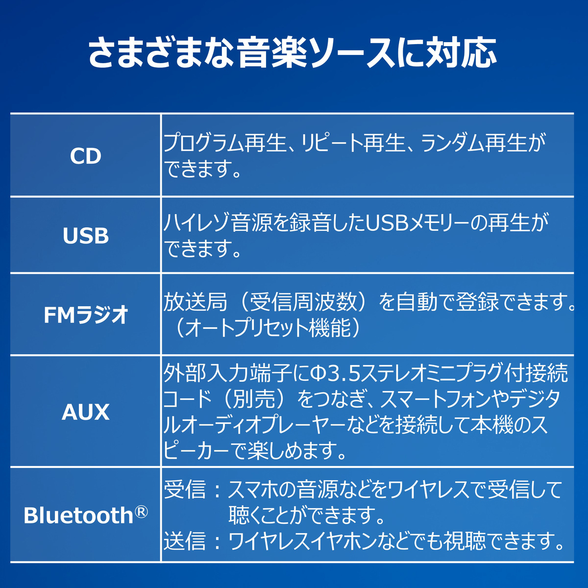 見やすい液晶やジョグダイヤルで操作も簡単。CD、USB、FMラジオ、Bluetooth接続など幅広いソースに対応し、リモコンのBASSボタンで低音を強調した再生も選べます