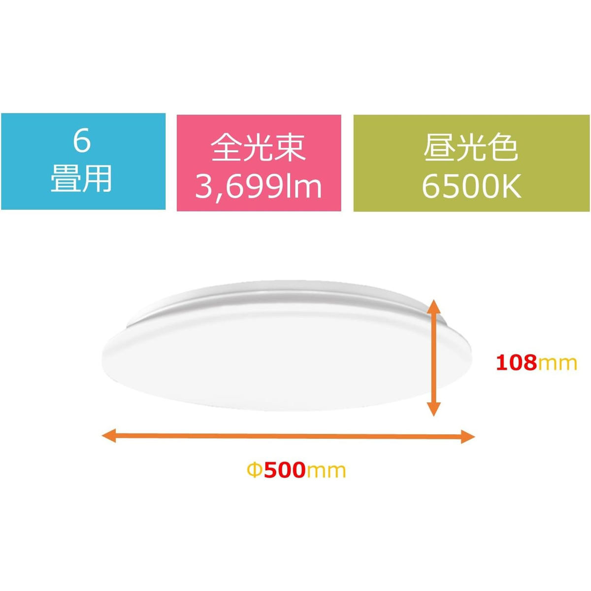 全光束は3,699lmで、おすすめの畳数表記の中で上限値の明るさです*。消費電力は33.6W、光源色は昼光色(6500K)です