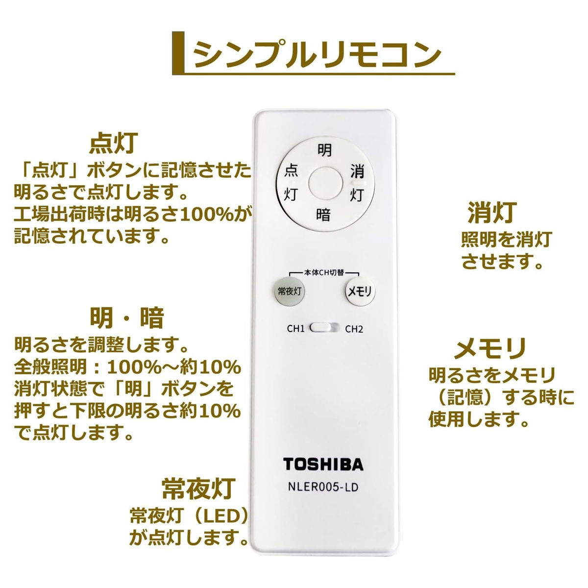 常夜灯の明るさは、リモコンで6段階調節可能です。常夜灯ボタンを押して点灯させ「明」「暗」ボタンで明るさを調整できます