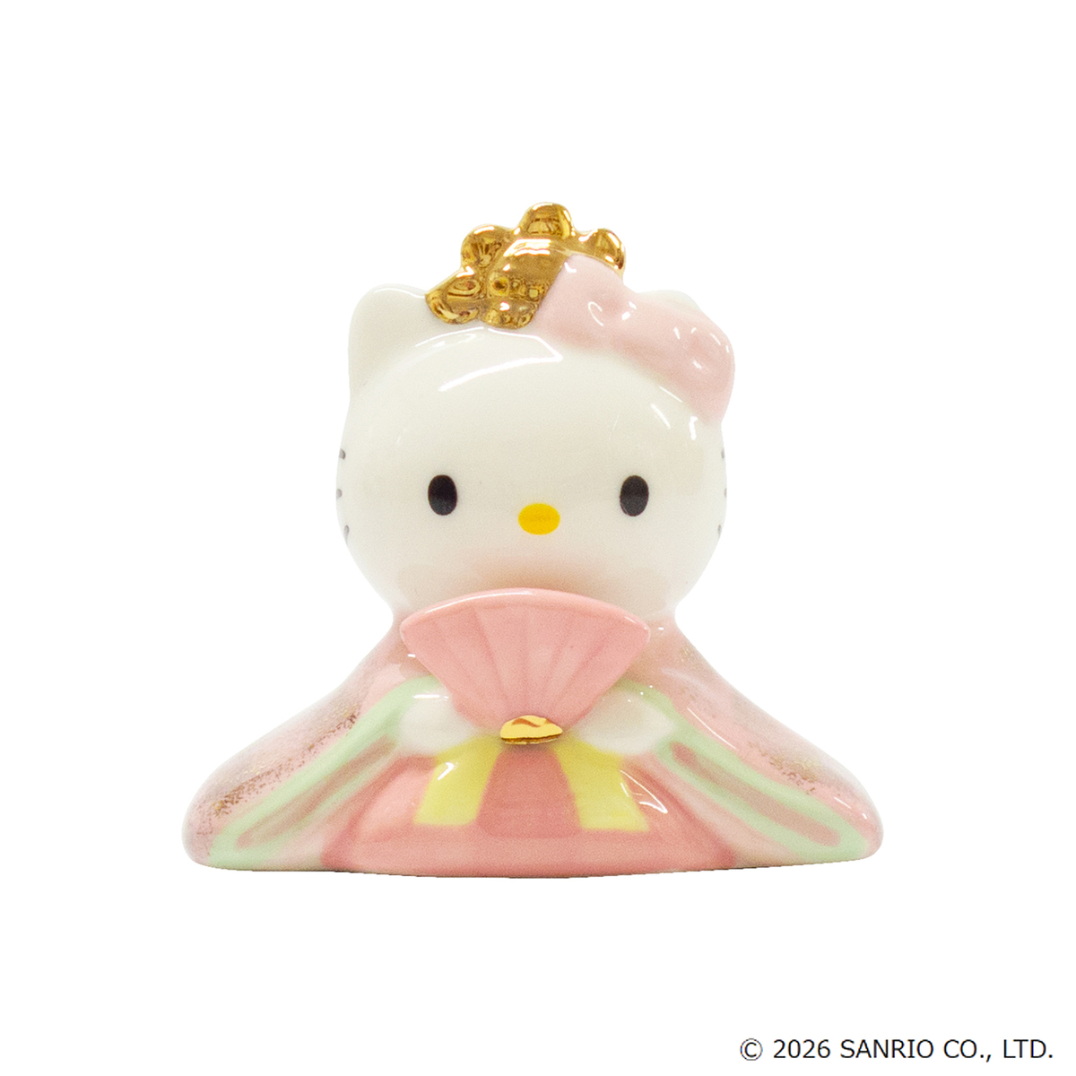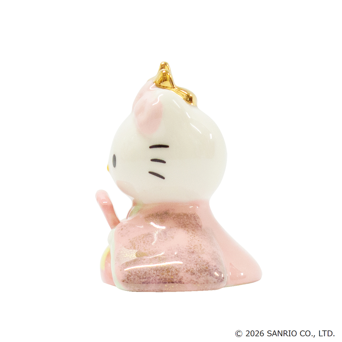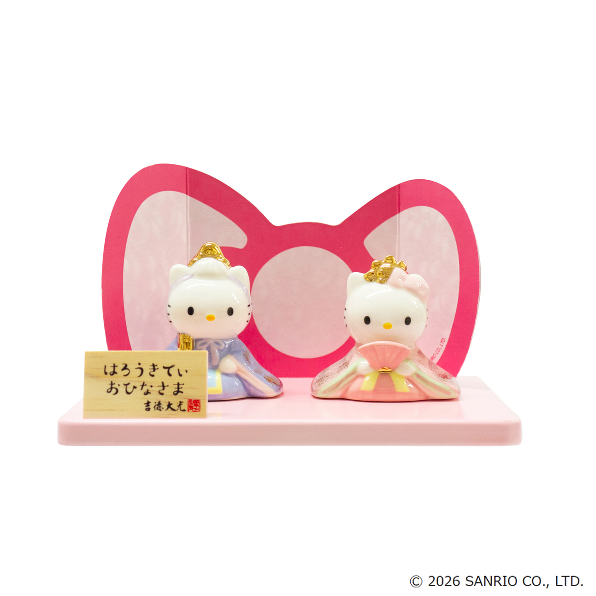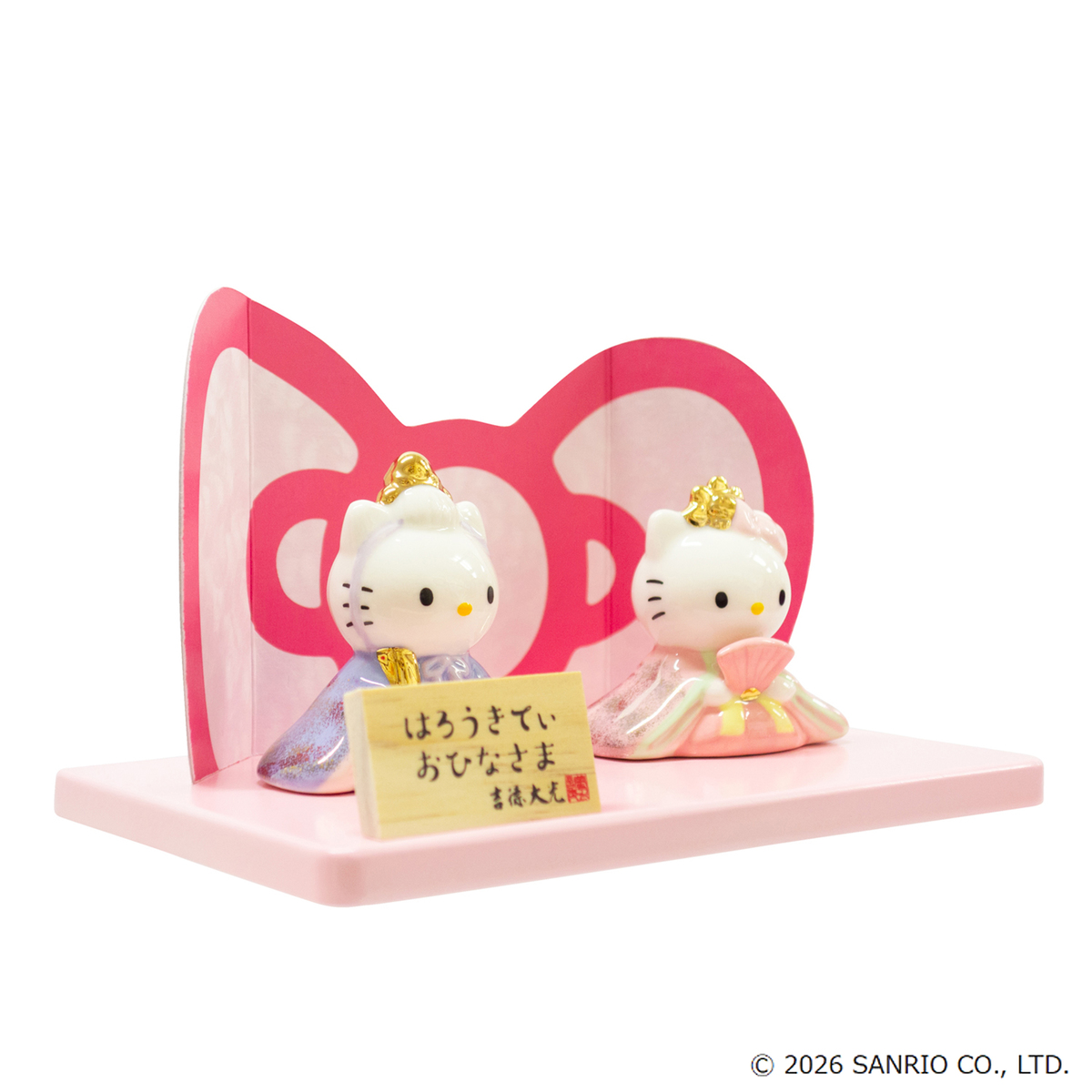 ハローキティの磁器ひな人形。コンパクトなサイズ感と可愛らしい色使いが特徴です。屏風はハローキティのリボンをデザインしました