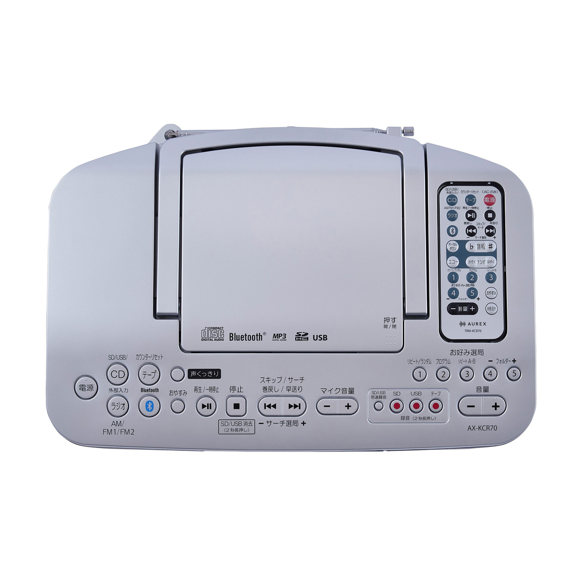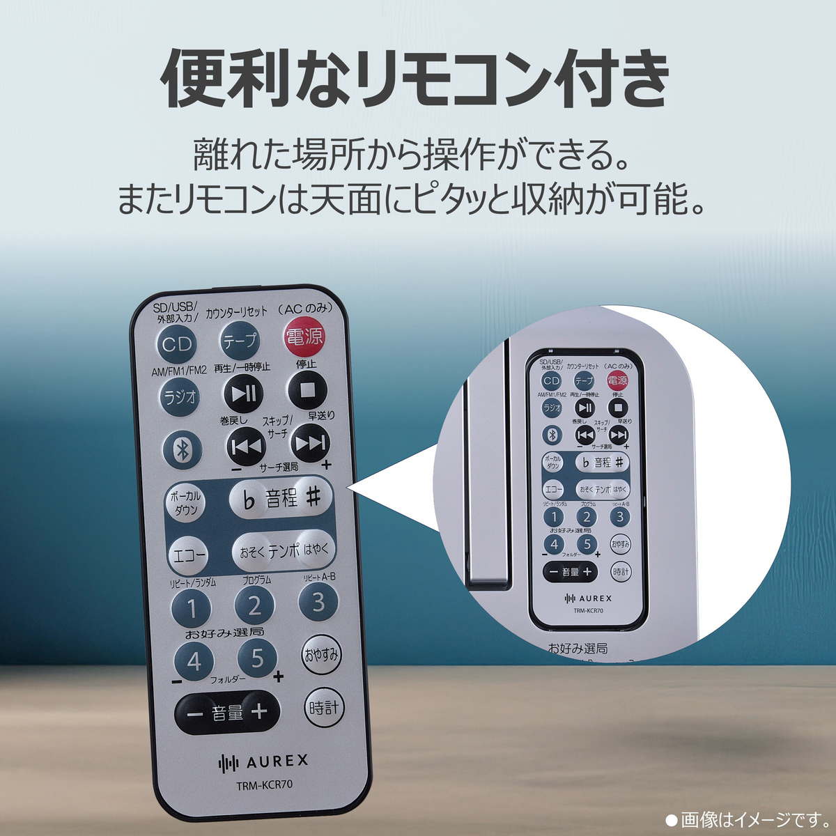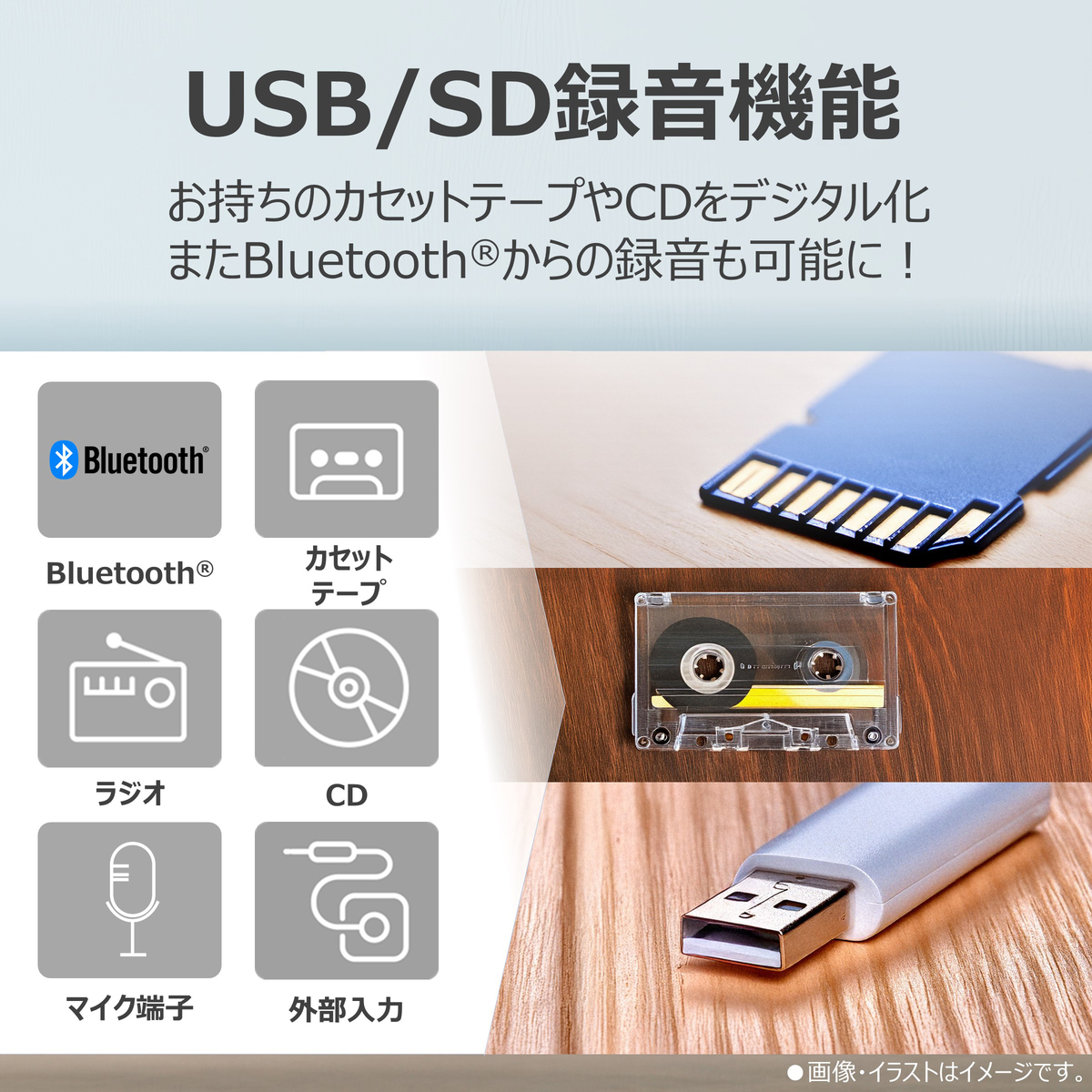 テープへの録音はもちろん、SDカードやUSBメモリーへの録音や、CD(MP3を含む)からSDカード、USBメモリーへの倍速録音にも対応。スマホや音楽プレーヤーなどの音源もBluetoothで手軽にSDやUSBに録音可能*。お気に入りのカセットテープの音源を、SDカードやUSBメモリーに簡単に録音して手軽にデジタル化もできます。便利なリモコン付きです