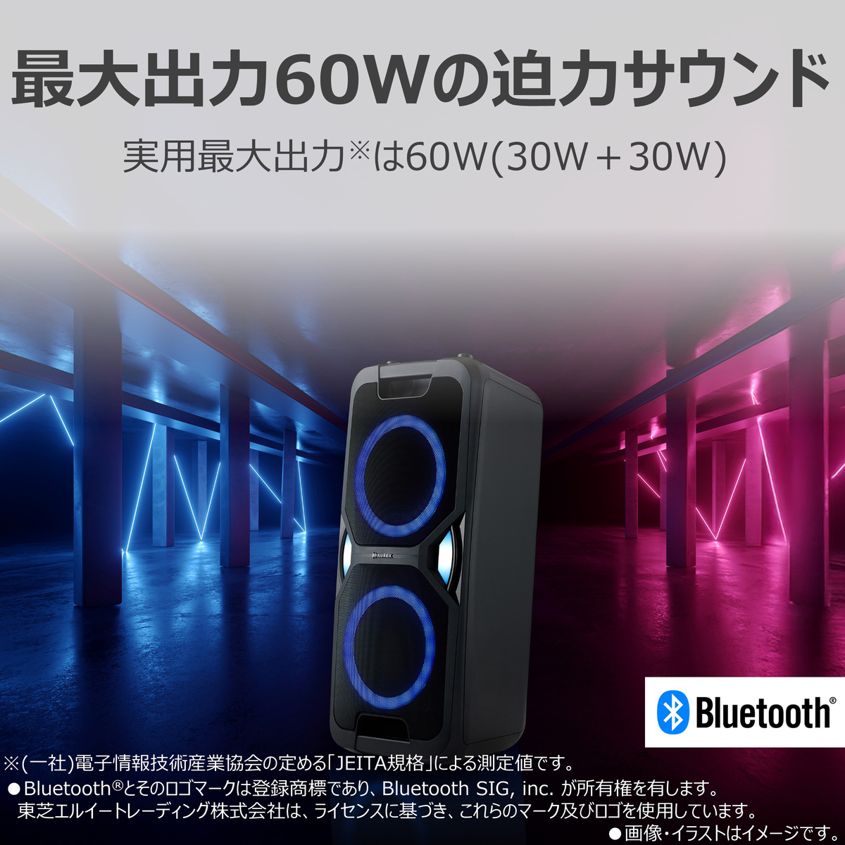 最大出力合計60W(*1)のパワフルなサウンドと7色LEDの光が、パーティーやレッスンを鮮やかに彩るスピーカー。音楽に合わせた多彩な演出で、幅広いシーンを盛り上げます