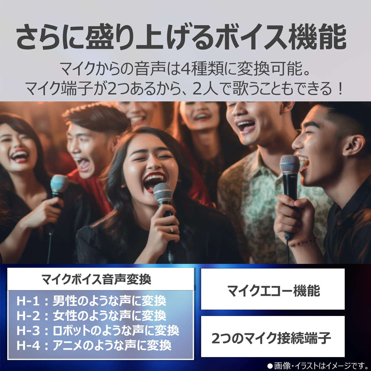 3時間の充電で最大約10時間再生が可能(*2)。5種類のイコライザー、マイクボイス音声変換やマイクエコー機能を搭載(*3)。カラオケやイベントなど、さまざまなシーンで使い方が広がります