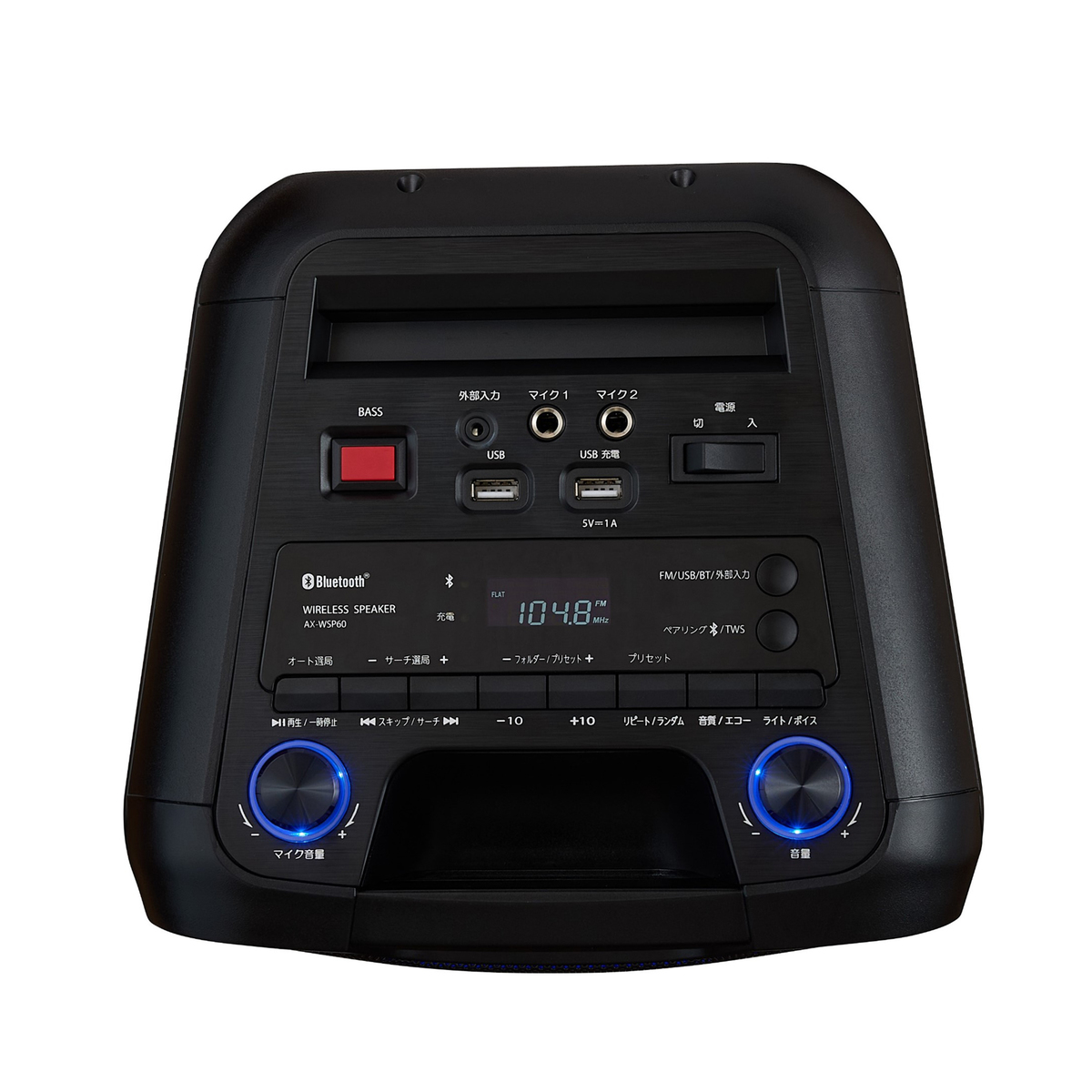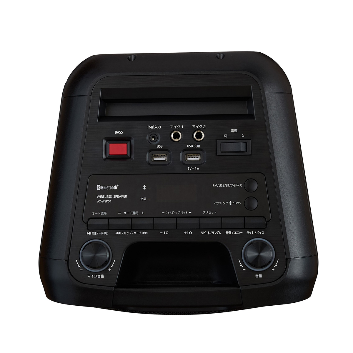 [商品内容] ・本体 ・電源コード ・横置き用シリコンゴムクッション(直径21mm、厚さ3.5mm)×4個 [サイズ] 約幅25.9×高さ60.8×奥行26cm(突起物含む) [重量] 約6800g [充電時間] 約3時間 [使用可能時間] (50%の音量):約10時間 [仕様] 端子 入力/出力 外部入力:φ3.5 mm ジャック マイク入力:φ6.3 mm ジャック ×2 USB メモリー部 再生形式 MP3 メモリー 32 MB〜32 GB 対応メモリー USB1.1 または USB2.0 再生可能 USB メモリー USBーIF 認証品 Bluetooth 部 Bluetooth仕様 バージョン 5.4 無線機器クラス クラス 2 対応プロファイル A2DP、AVRCP 周波数 2.402〜2.480 GHz(2.4 GHz ISM セグメント) 通信距離 10m以下 [使用方法] <USBメモリーから聴く> ・FM/USB/BT/外部入力ボタンを押して、USBモードを選択する ・USBメモリーを本機の上面にあるUSB音楽用ポートに接続する ・再生するには再生/一時停止ボタンを押す <Bluetoothを利用する> ・FM/USB/BT/外部入力ボタンを押して、Bluetoothモードを選択する ・お使いの機器の説明書に従って機器のBluetooth機能を有効にし、本機「AX-WSP60」を探し、接続する ・Bluetoothペアリング接続した機器を操作して再生を開始する <マイクを使用する> マイク入力はどのモードでも使用できます ・お使いのマイクを本機のマイク1またはマイク2の6.3mm端子に接続する ・本機のマイク音量ダイヤルを回してマイク音量を調整する [お手入れ] ・やわらかい布で汚れを軽く拭き取ります。汚れがひどいときは、水で薄めた中性洗剤をやわらかい布に含ませ、固く絞ったあとに拭き取ります。そのあと乾いた布で拭きます ・ベンジンやシンナー等は使用しないで下さい。外装ケースには、殺虫剤などの揮発性の薬剤をスプレーしないで下さい ■取り扱い説明を充分にご確認の上、ご使用下さい 【中国製】 [注意事項] ※次のような場所に置かない、使用しない ・心臓ペースメーカーを装着している方は装着部から22cm以内 <もし異常が起こったら> ※異常・故障時には、すぐに使用を中止し、USBーACアダプターを抜く ・煙が出たり、異常なにおいや音がする ・音声が出ないことがある ・内部に水や異物が入った ・電源コードが異常に熱い ・本体に変形や破損した部分がある <電源コード・電源プラグについて> ※電源プラグは交流100Vコンセントに根元まで確実に差し込む ※電源プラグの刃と刃の取り付け面にゴミやホコリがついている場合は、プラグを抜き、ゴミやホコリをとる ※電源コードを取り扱うときは、次のことを守る ・傷つけない ・延長するなど加工しない ・加熱しない ・引っ張らない ・重いものを載せない ・はさまない ・無理に曲げない ・ねじらない ・束ねない ※電源プラグをコンセントから抜くときは、電源プラグ部を持って引き抜く ※ぬれた手で電源プラグを抜き差ししない <ご使用について> ※持ち運ぶときは電源プラグをコンセントから抜き両手でしっかりと持つ ※落としたり強い衝撃を与えて本体を破損したときはすぐに電源を切り電源プラグをコンセントから抜く ※分解・修理・改造はしない ※異物を入れない ※雷が鳴り出したら、FMアンテナ・電源プラグに触れない ※花瓶など液体の入ったものを本機の上に置かない ※本機の上にのったり、重いものを置いたりしない ※長時間、音が歪んだ状態で使わない