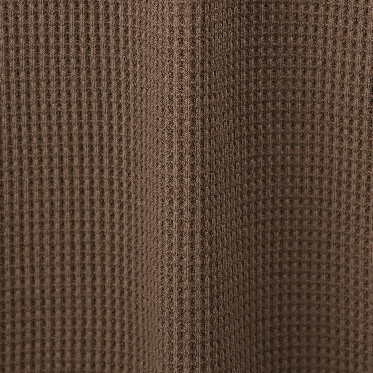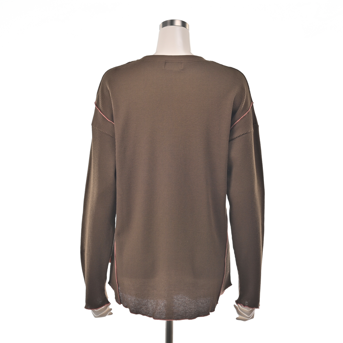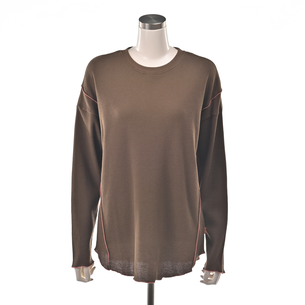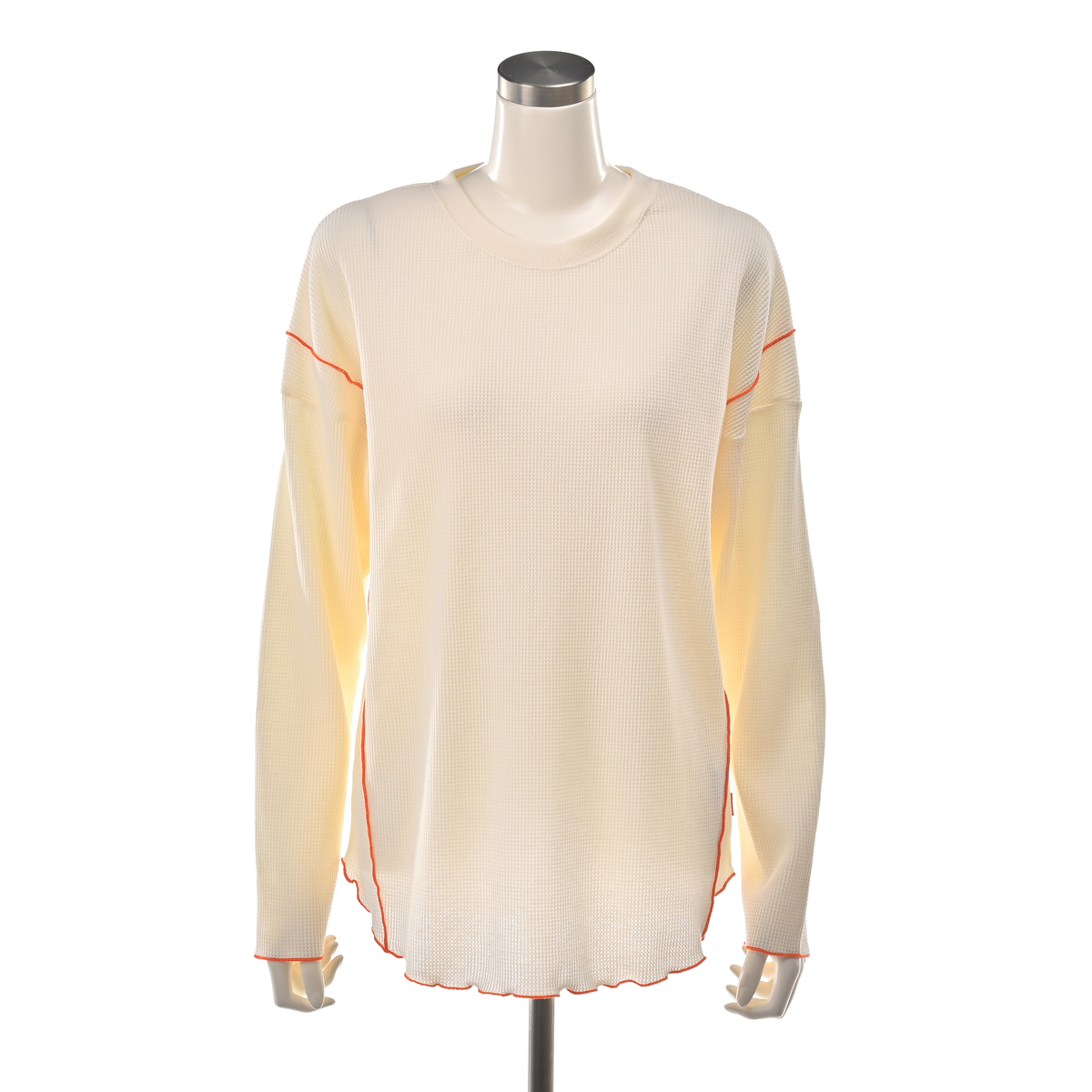 伸縮性のあるワッフル生地で仕立てたロンT。柔らかな肌触りと動きやすさが魅力です。配色メローステッチが全体を引き締め、体型をきれいに見せながら、モダンなアクセントを添えます
