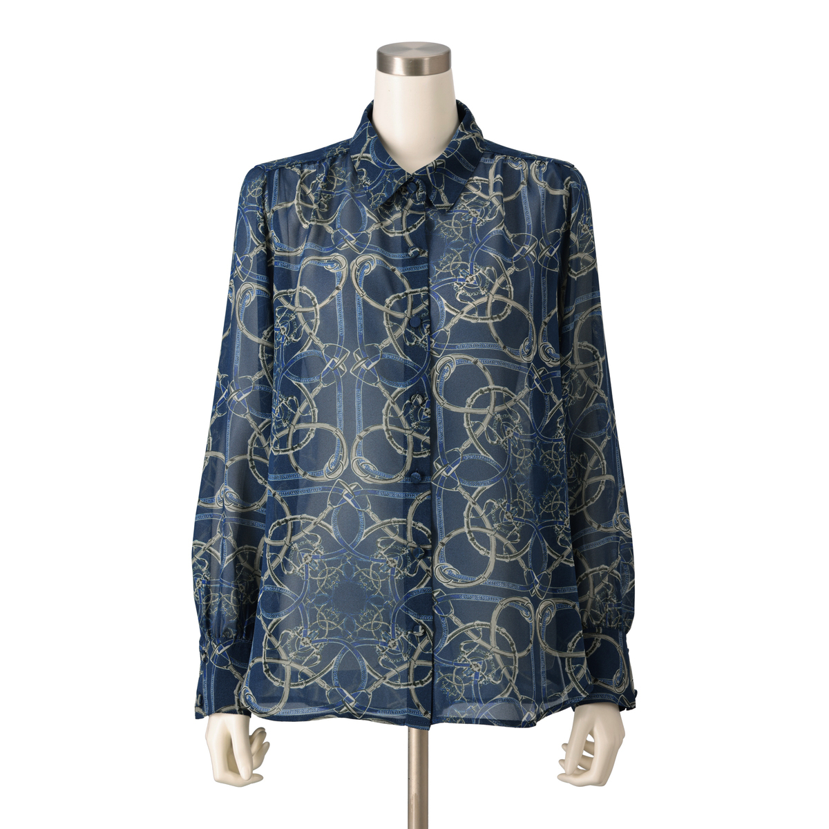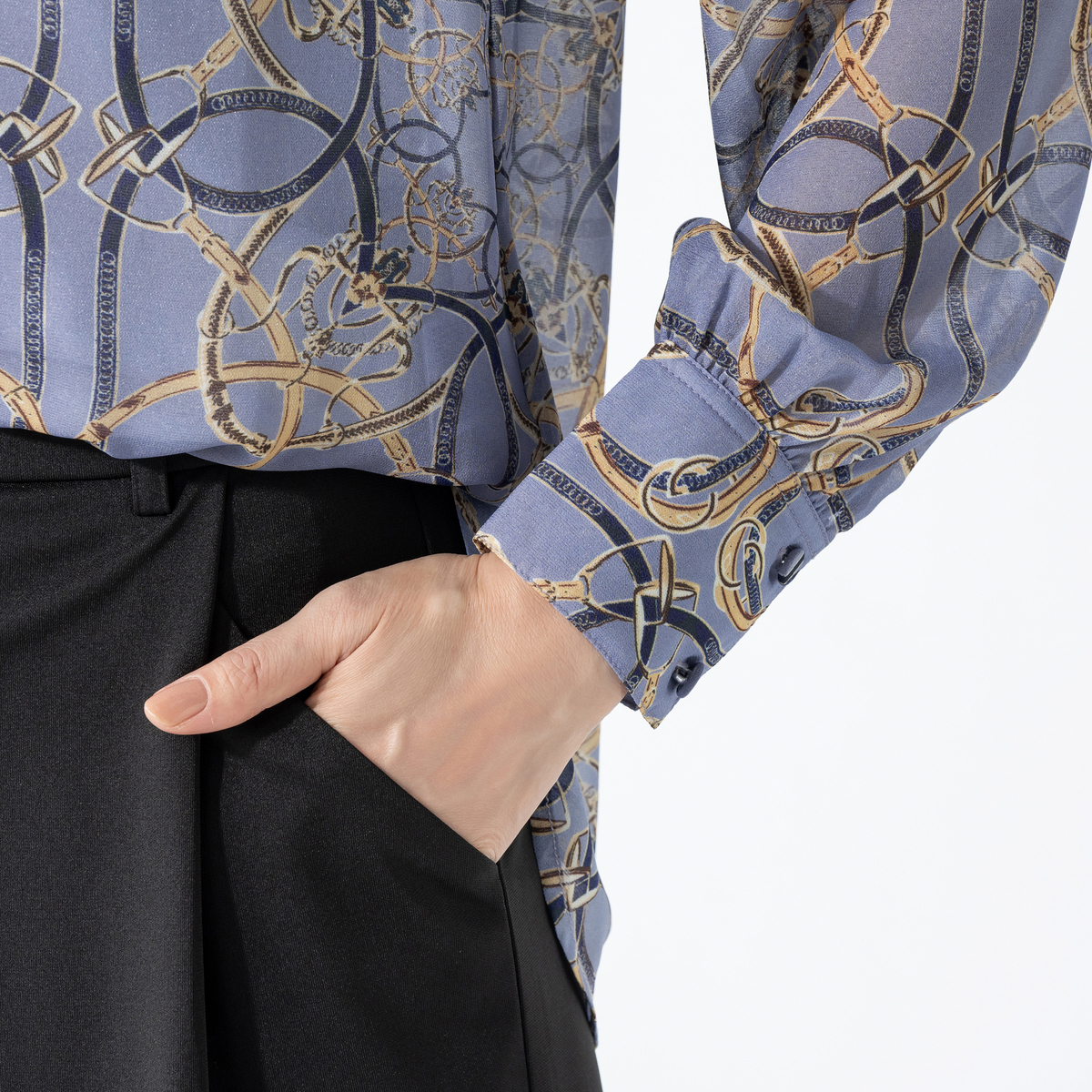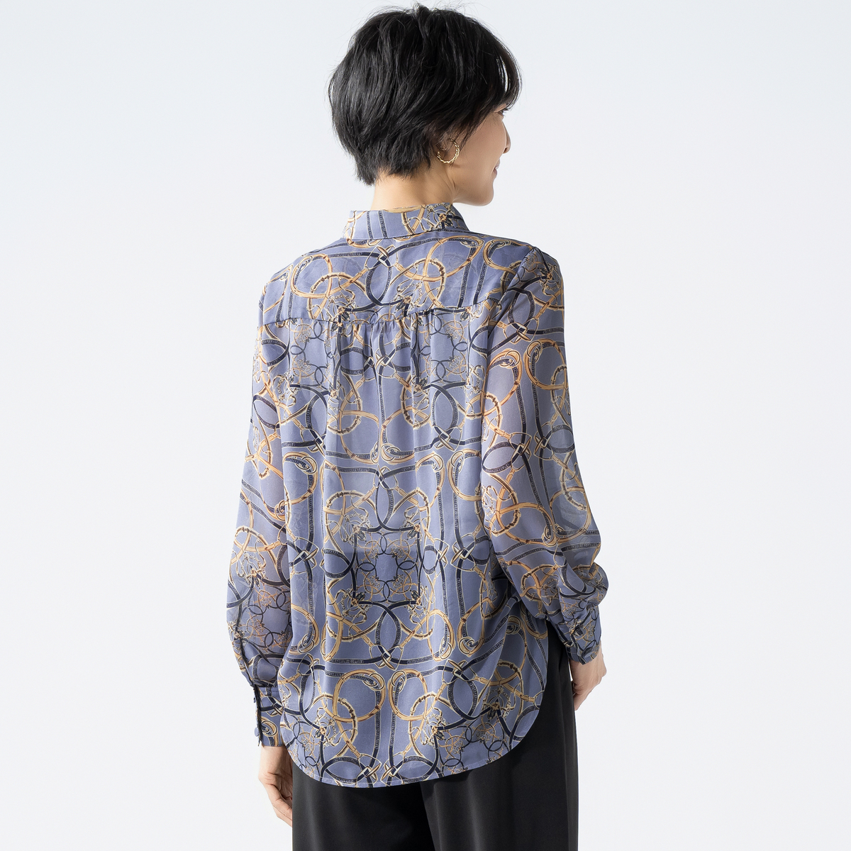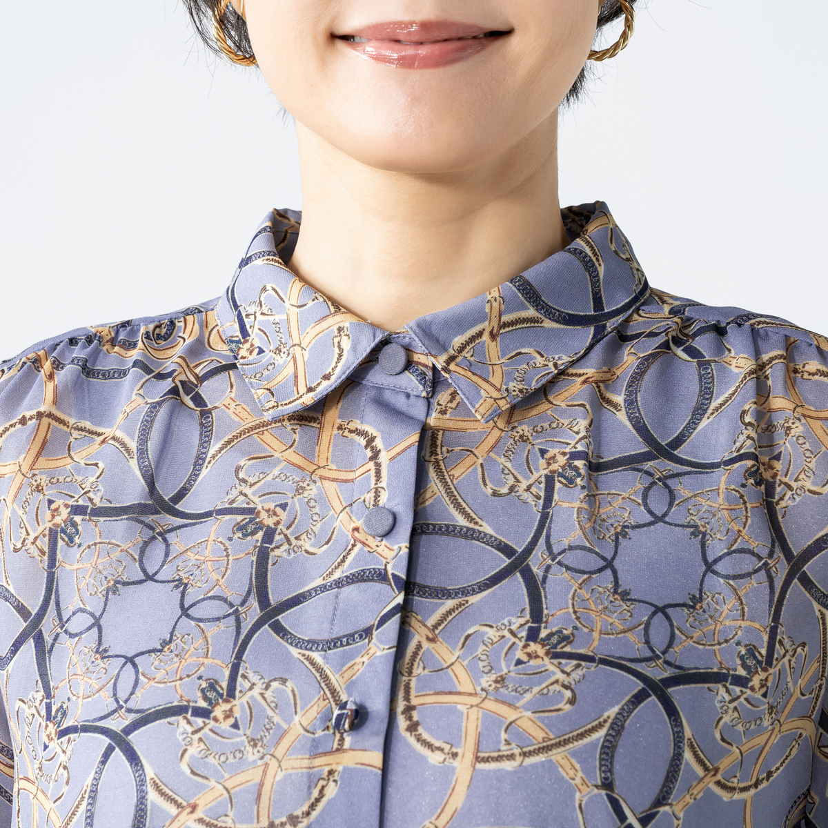上品な光沢が映えるシャイニーなブラウス。軽やかなシフォンにベルトやチェーンのプリント柄を添え、華やかな表情に仕上げました