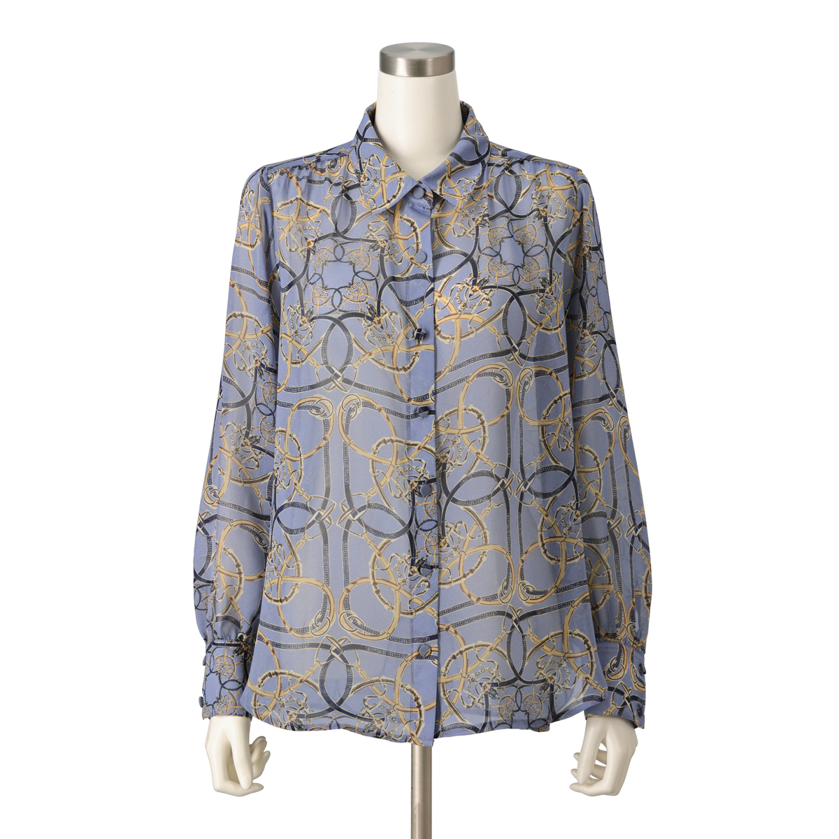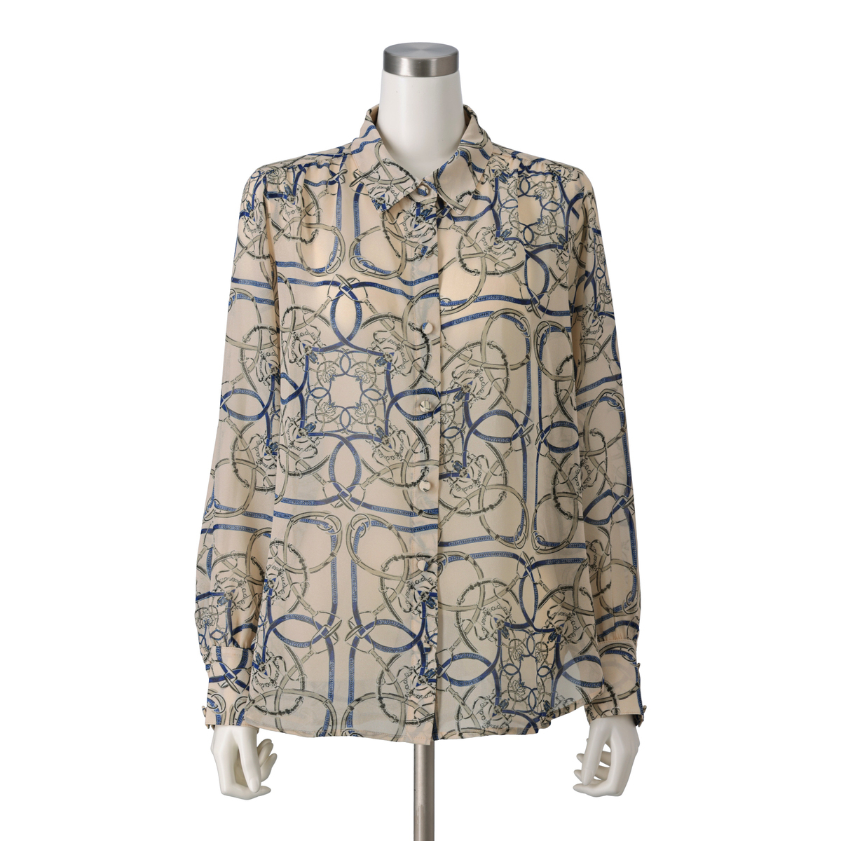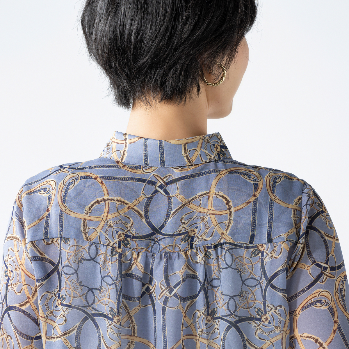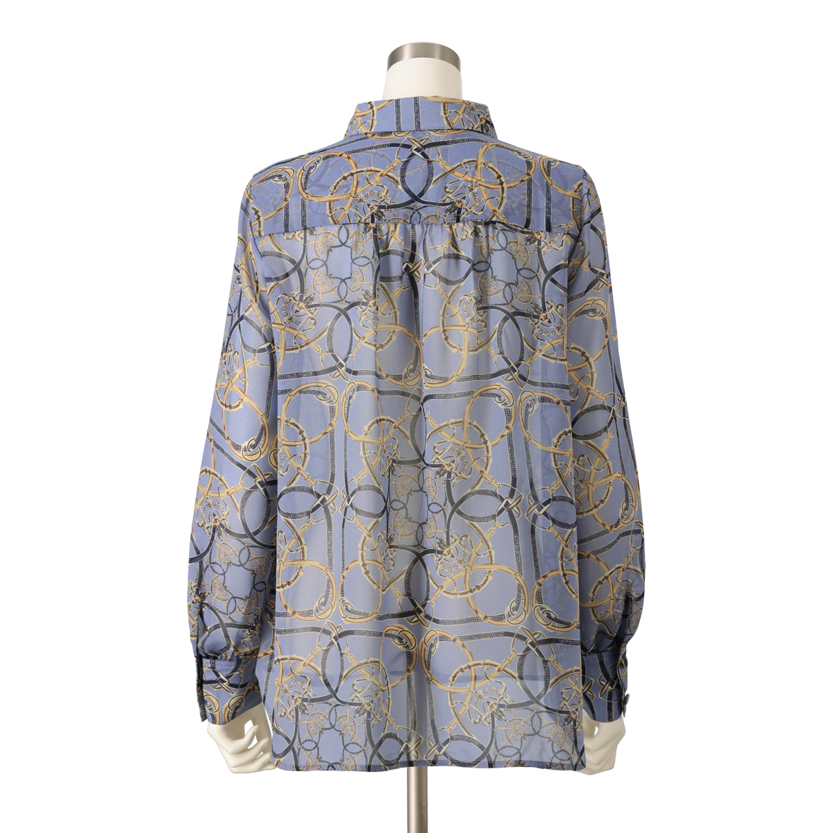上品な光沢が映えるシャイニーなブラウス。軽やかなシフォンにベルトやチェーンのプリント柄を添え、華やかな表情に仕上げました