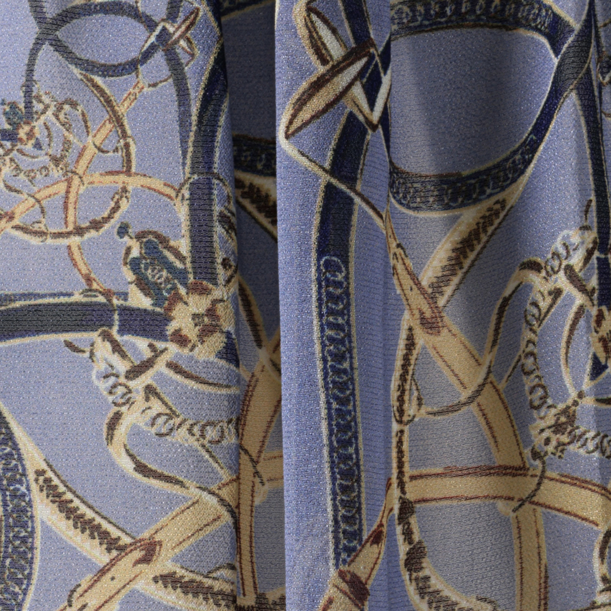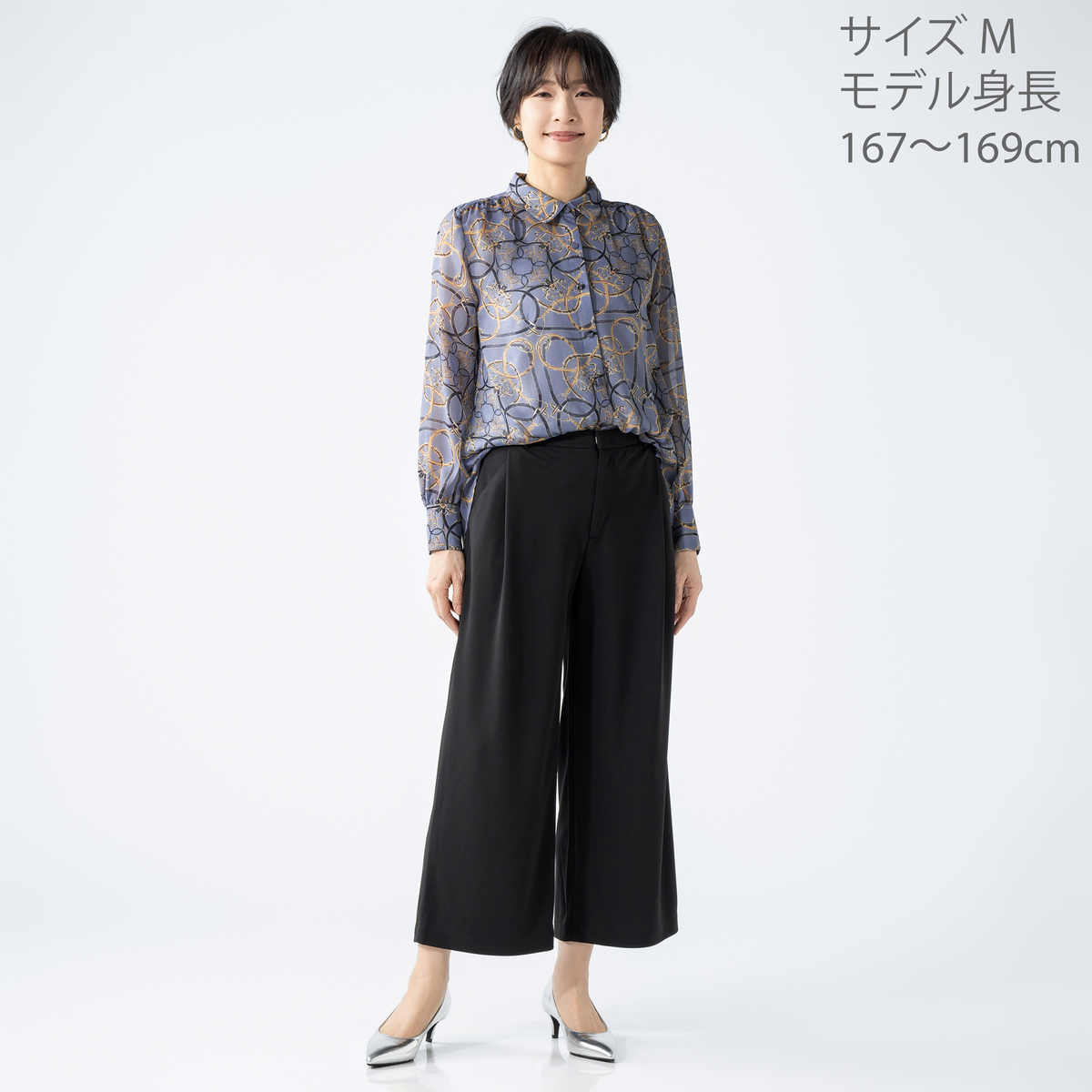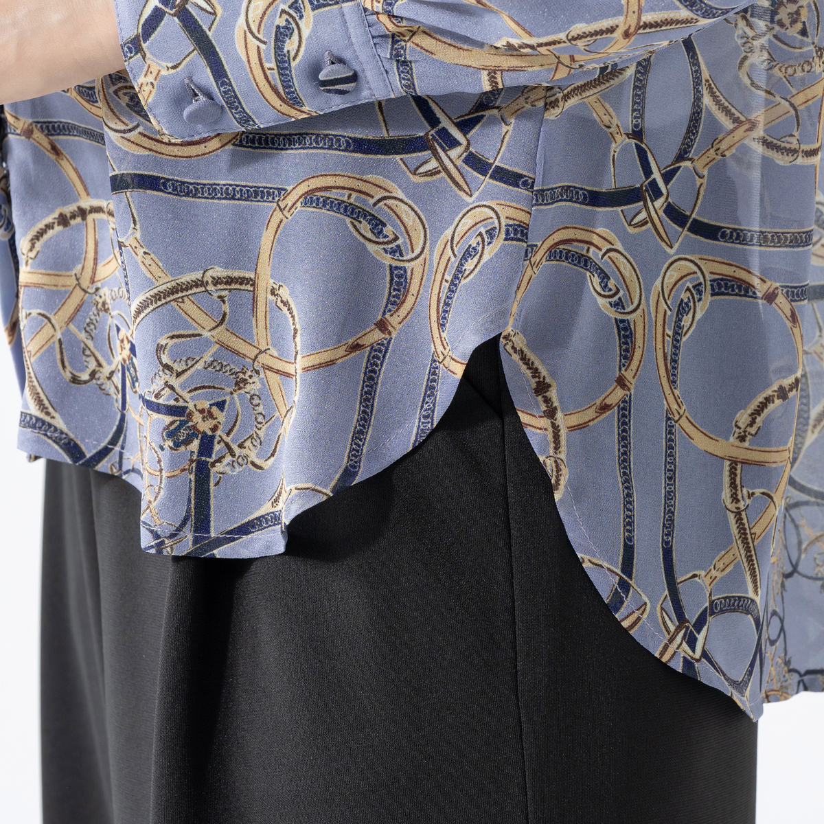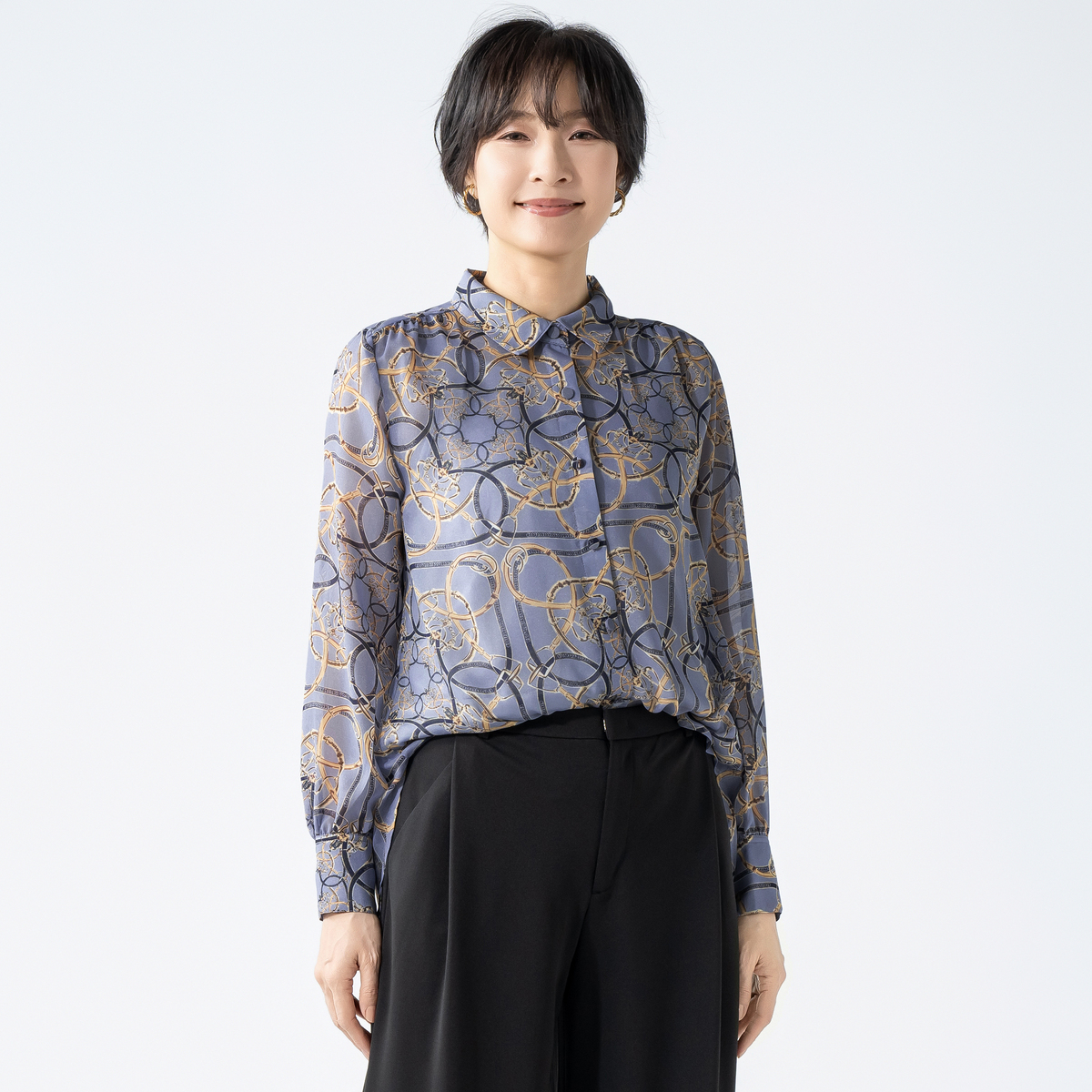 上品な光沢が映えるシャイニーなブラウス。軽やかなシフォンにベルトやチェーンのプリント柄を添え、華やかな表情に仕上げました
