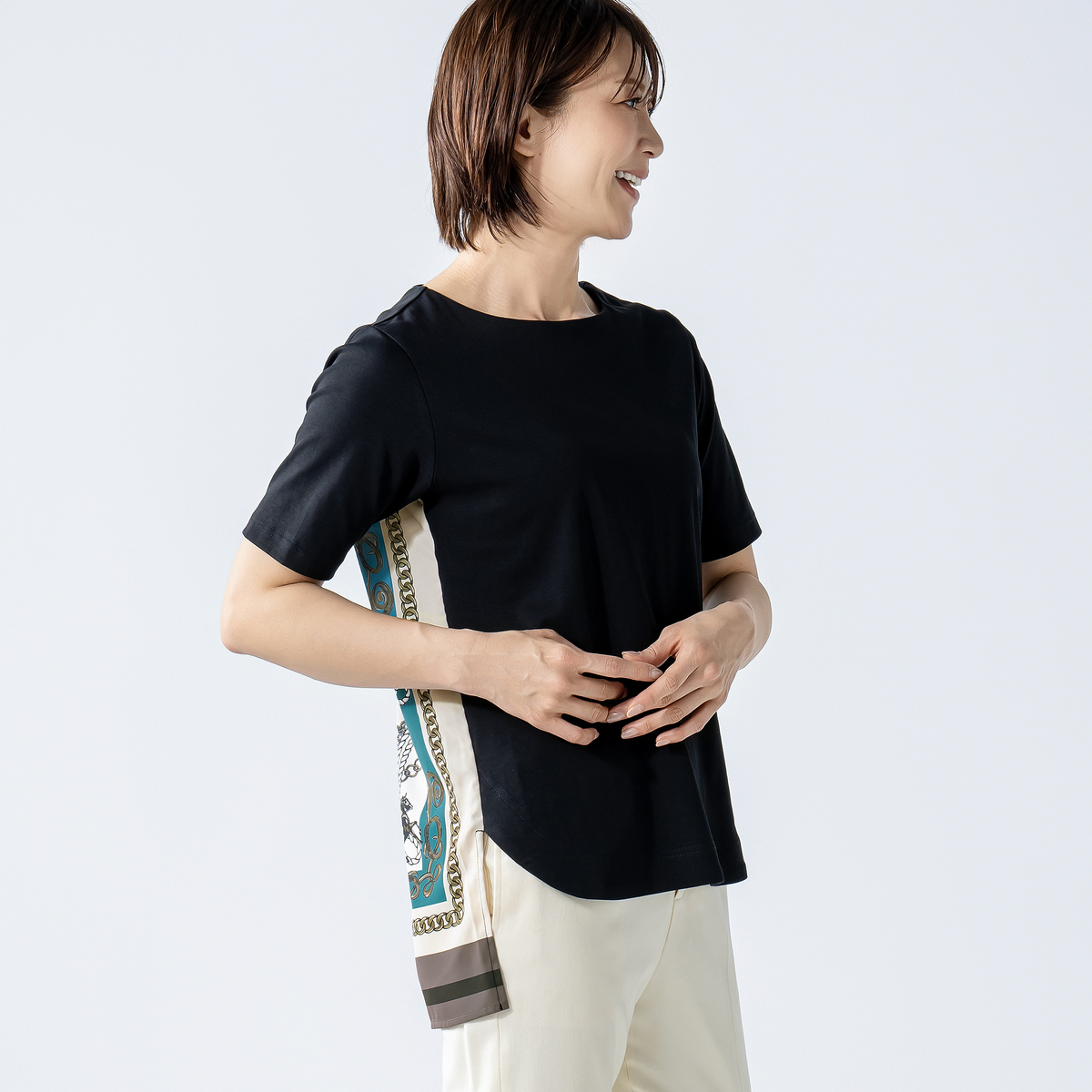 前身頃や袖、後ろヨークはシルケット加工を施したコットン100%のスムース素材で仕立てたプルオーバー。なめらかな肌触りと控えめな光沢感を楽しめます。後ろ身頃にはドレープ感が美しいデシン素材を採用。クラシックな馬具やチェーンをあしらったスカーフ柄が後ろ姿に華を添えます