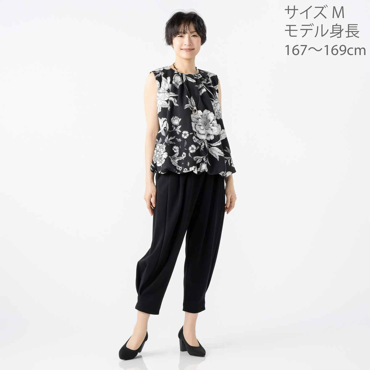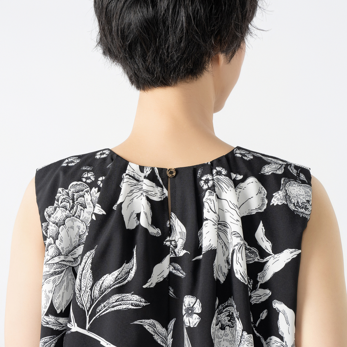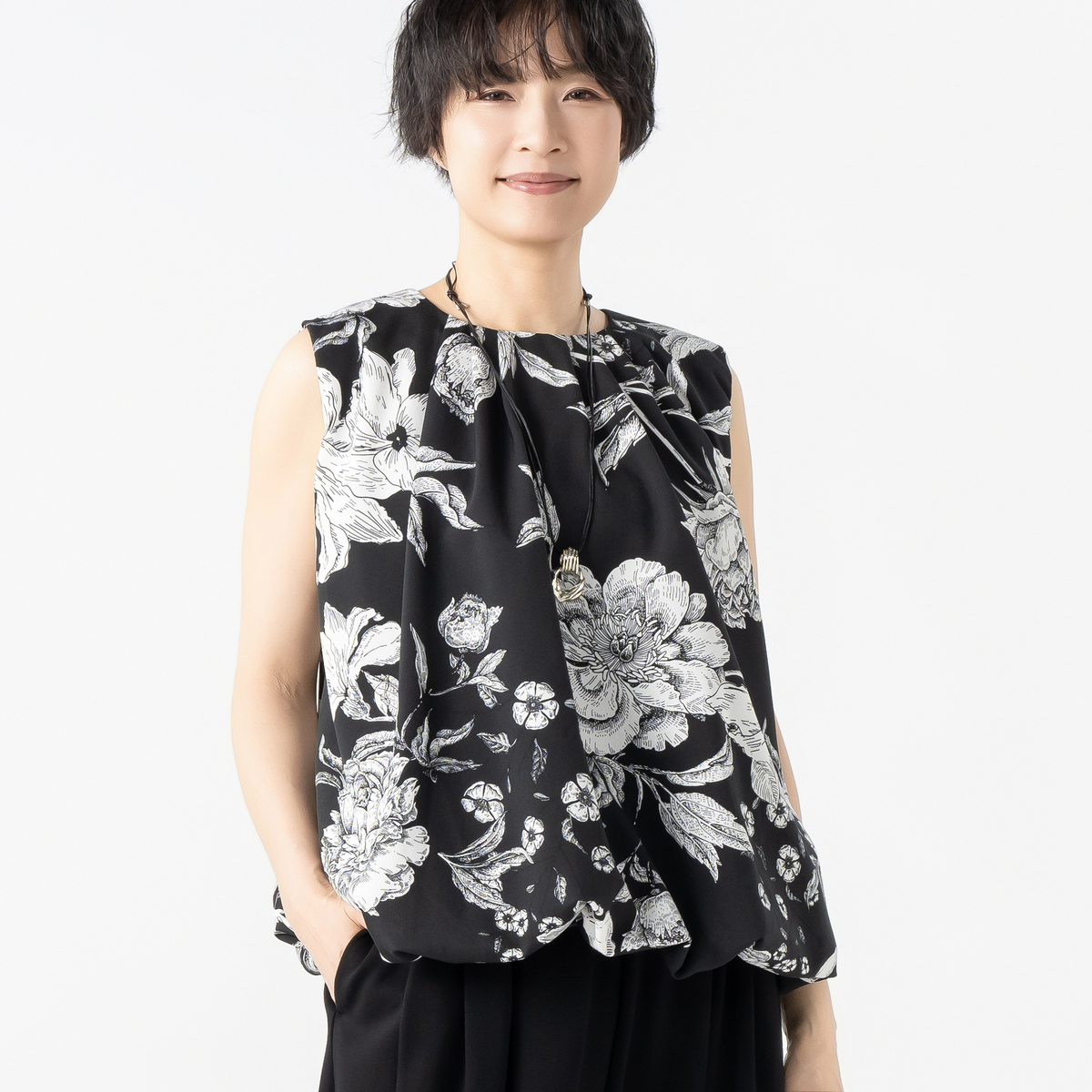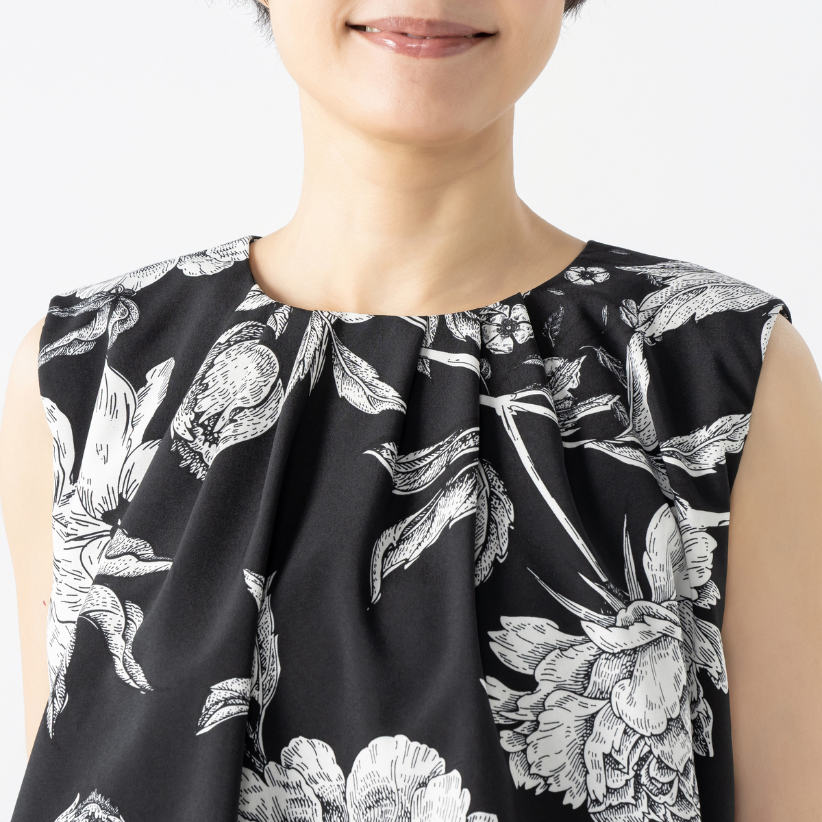 襟元にタックを寄せて立体感を出した、軽やかなブラウスです。裾はバルーン仕立てで、ふんわりとしたシルエットに。上品な華やぎ感があり、いつものコーディネートに新鮮さを加えます