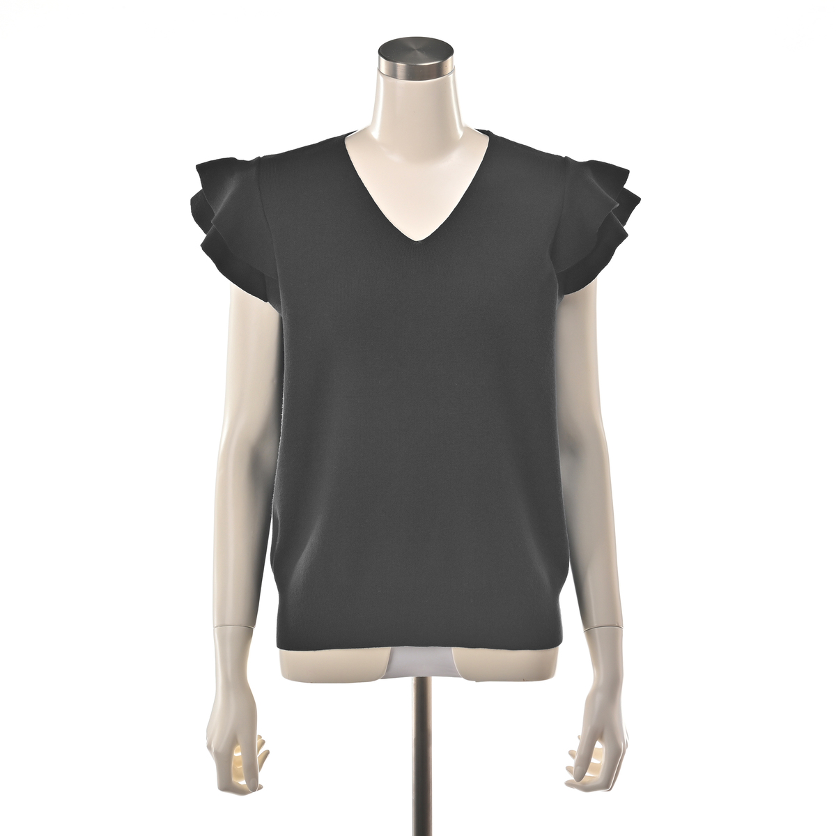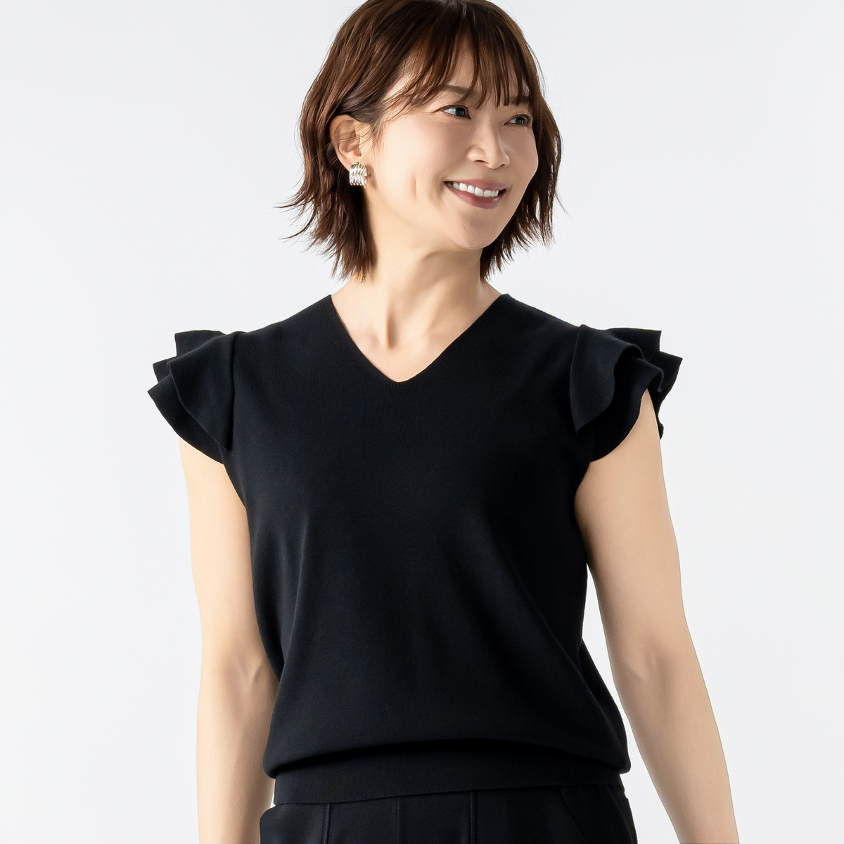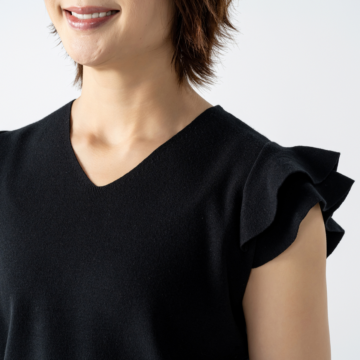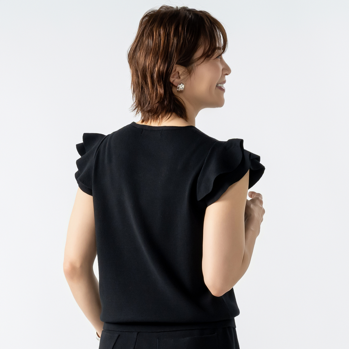 肩のフリルがさりげなく華やかさをプラス。日常の装いをアップグレードします