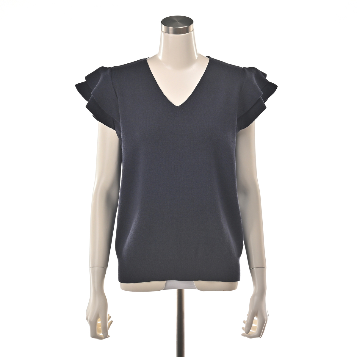 コアスパンヤーン素材を使ったフリルプルオーバーです。14ゲージ総針編みで透けにくく、すっきりとしたVネックがデコルテを美しく見せてくれます