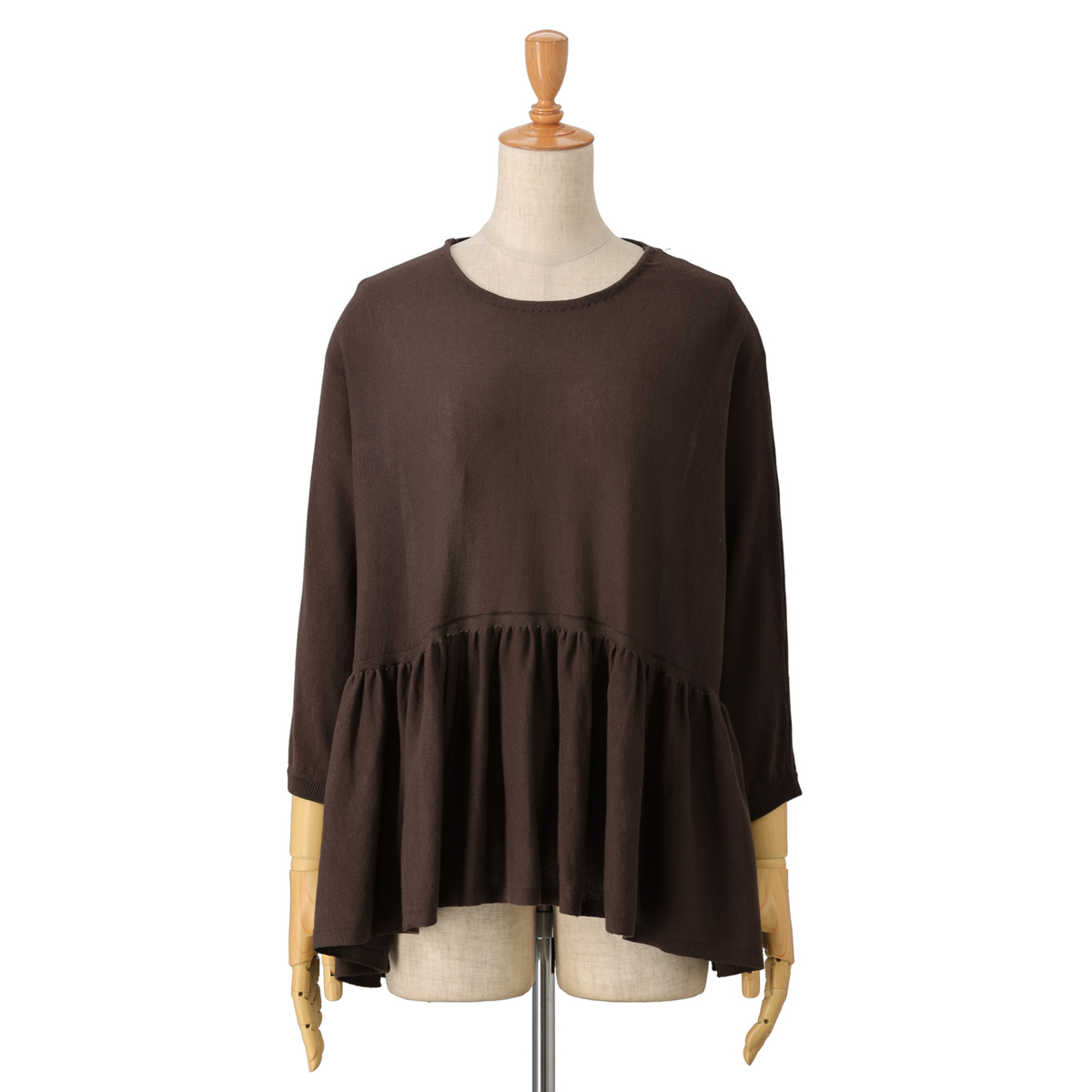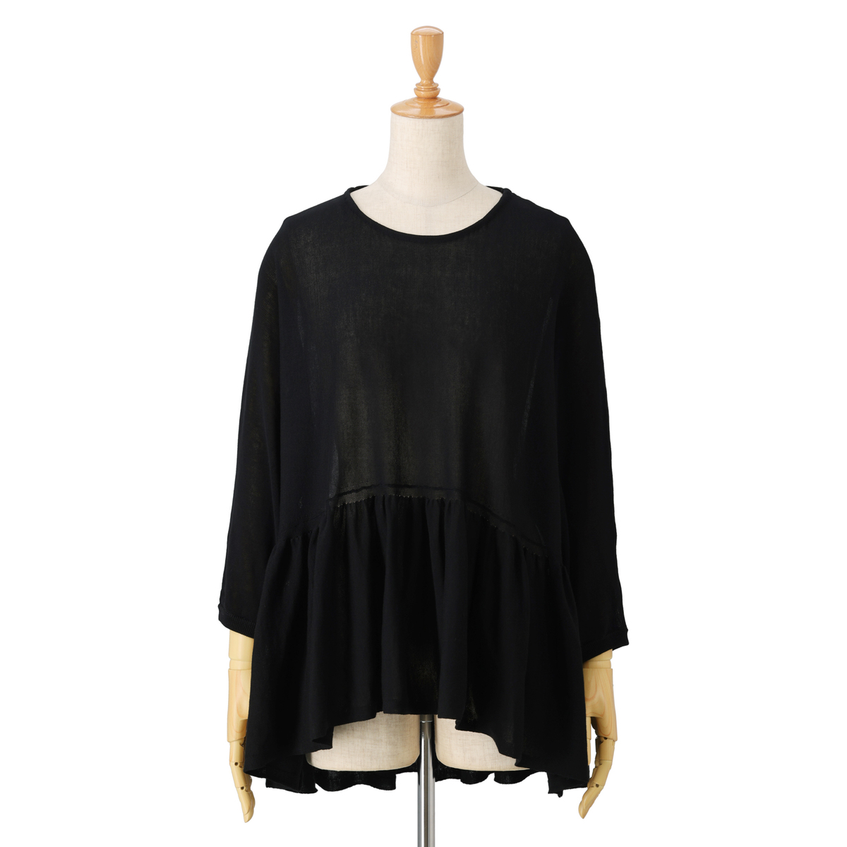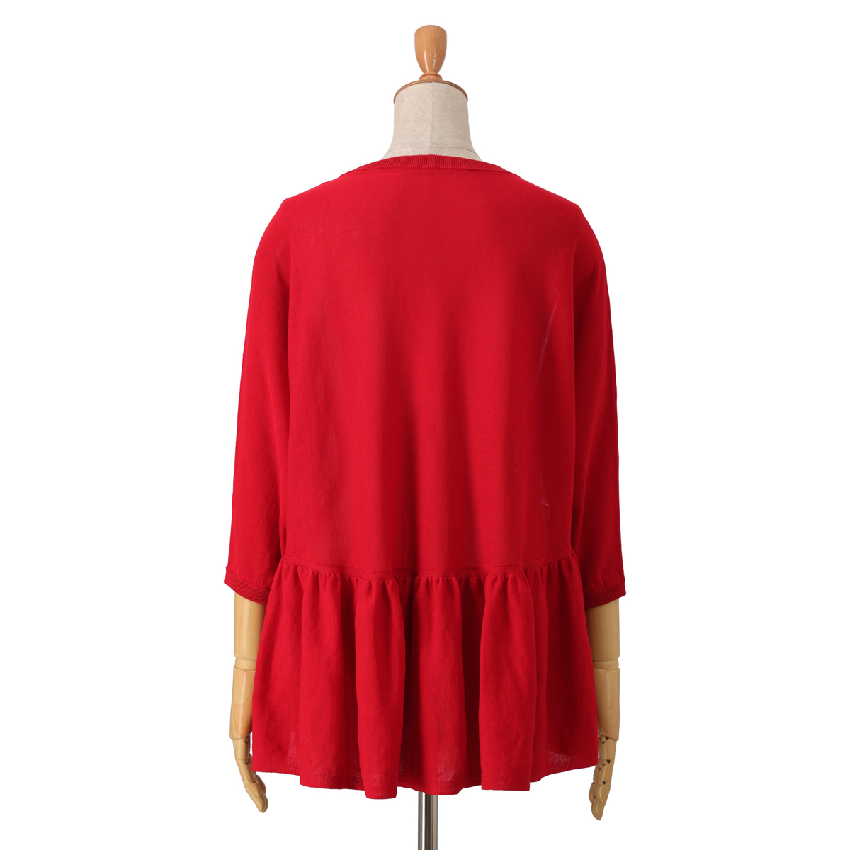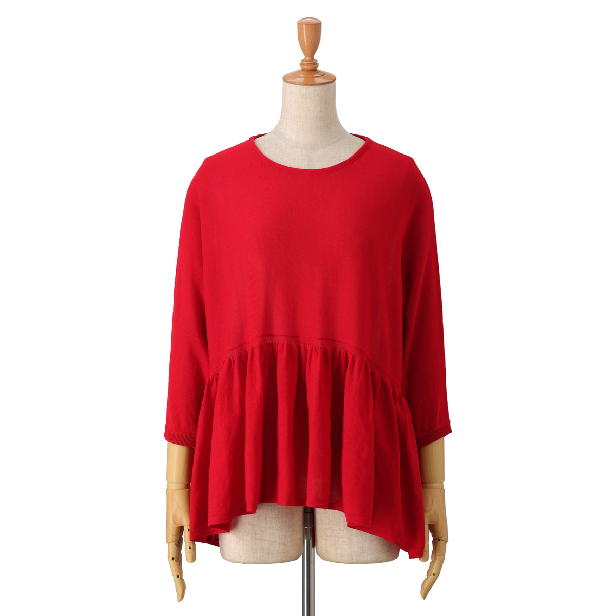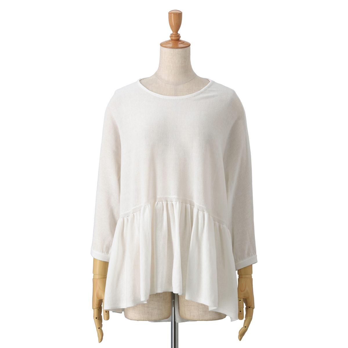 14G天竺素材を使用したフリルニットプルオーバー。身頃から裾にかけて、ニッティング技術で減らし目を入れて、フレアシルエットにしました