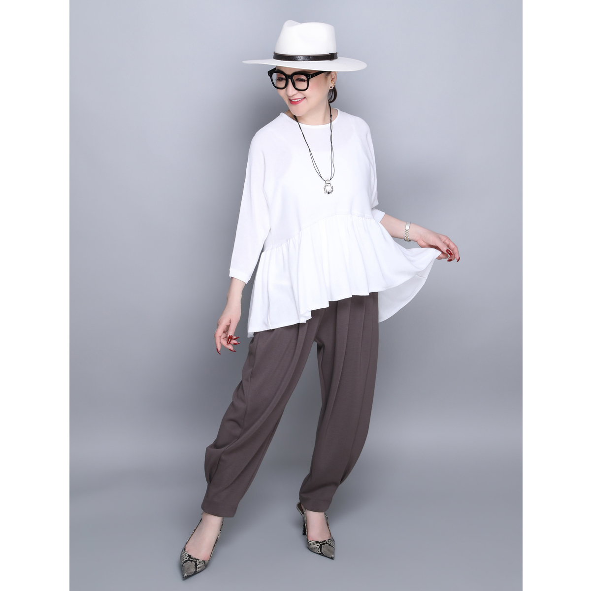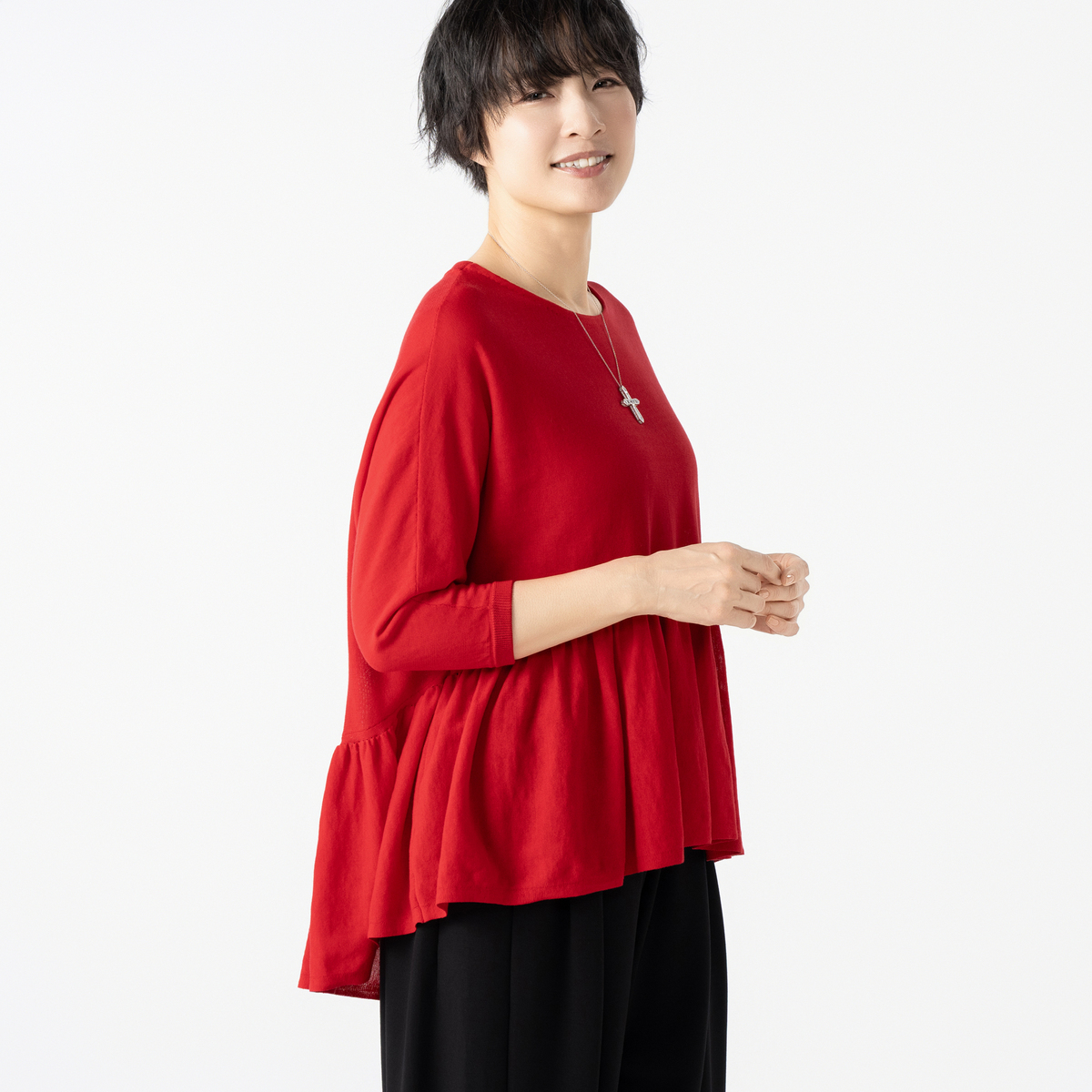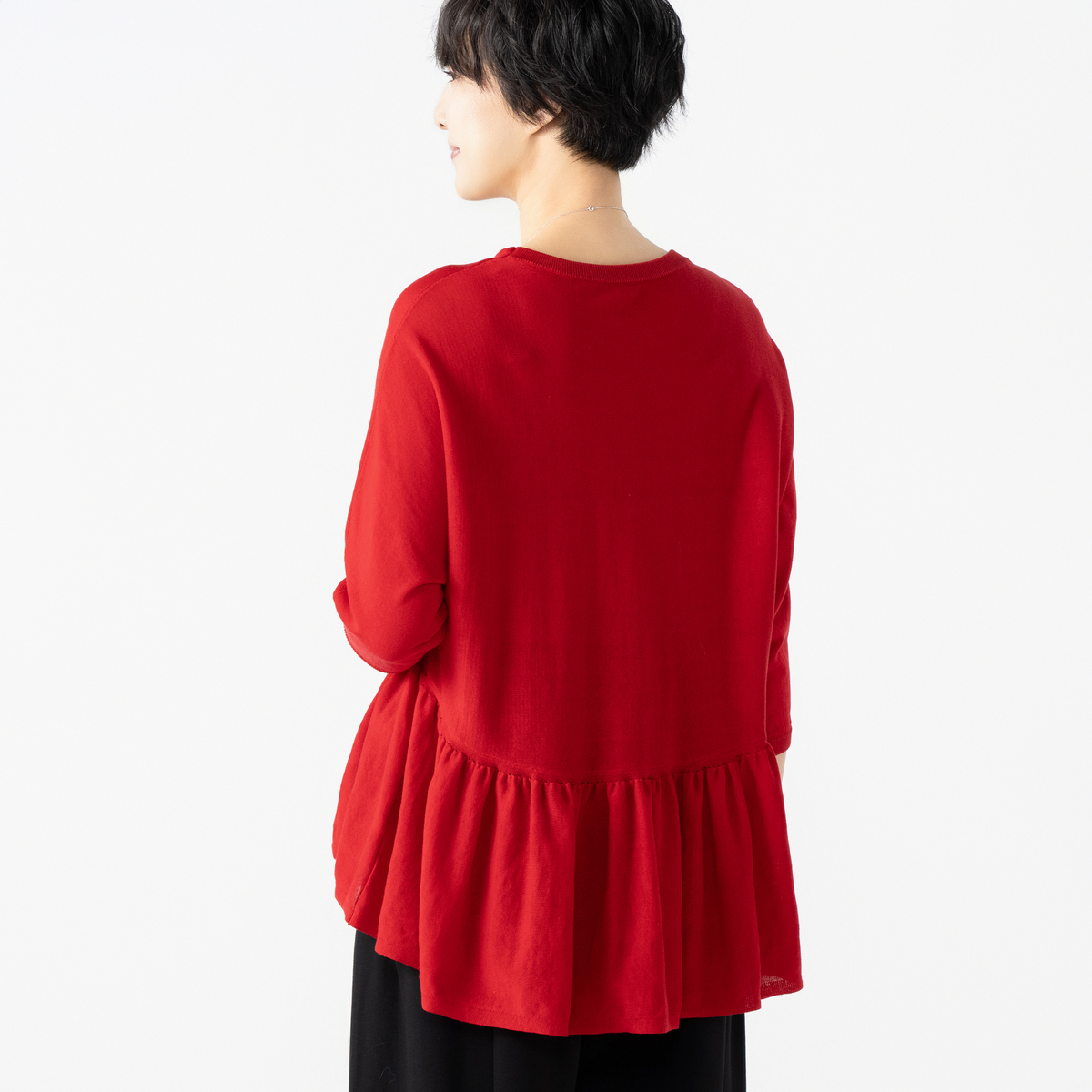 14G天竺素材を使用したフリルニットプルオーバー。身頃から裾にかけて、ニッティング技術で減らし目を入れて、フレアシルエットにしました