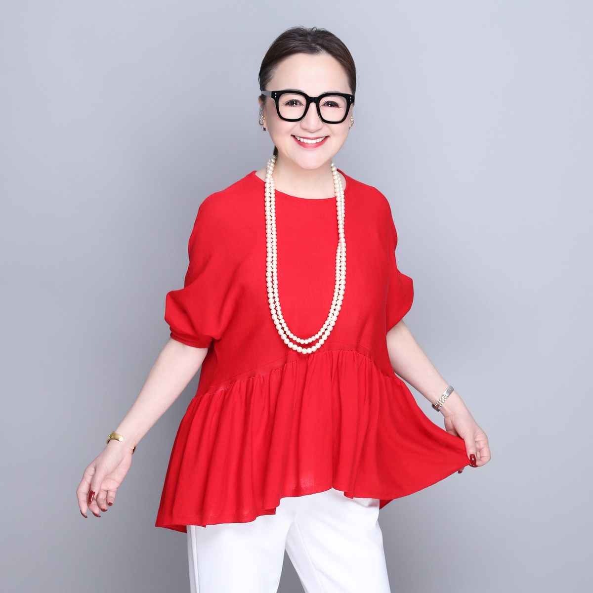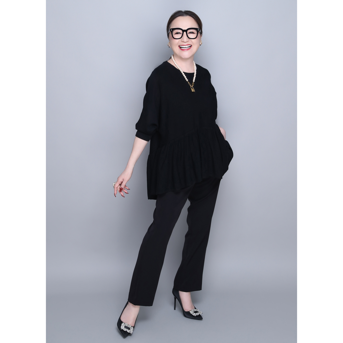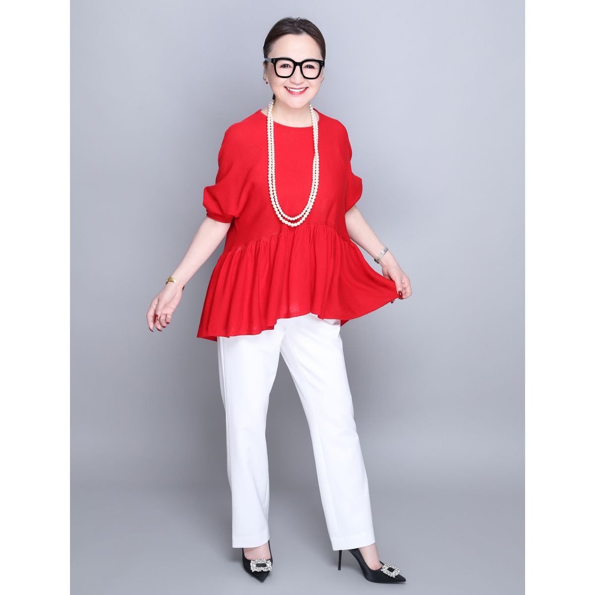 14G天竺素材を使用したフリルニットプルオーバー。身頃から裾にかけて、ニッティング技術で減らし目を入れて、フレアシルエットにしました