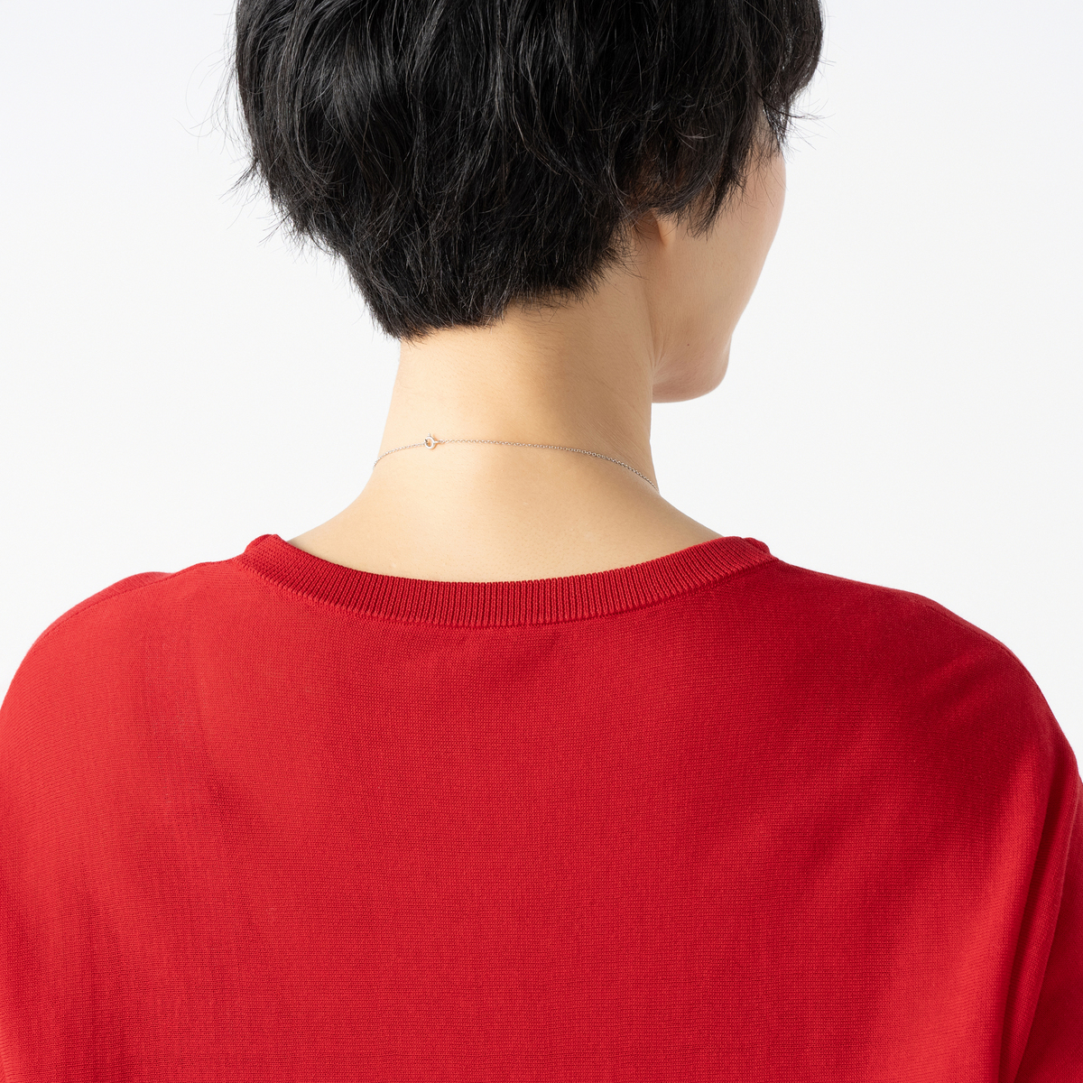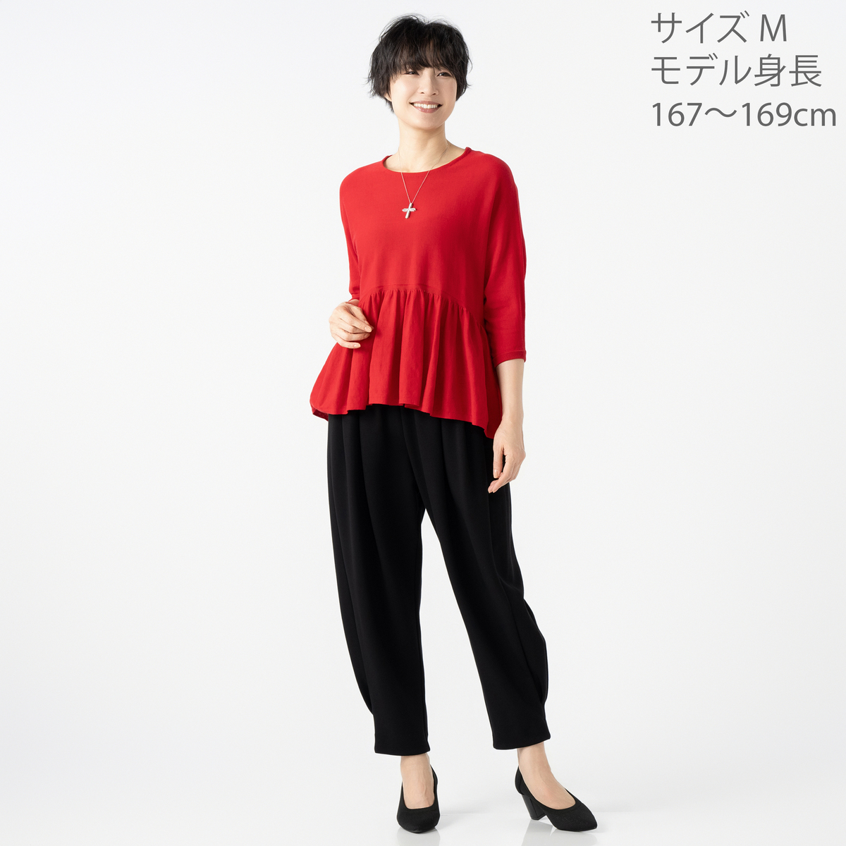 身頃から編み続いてフレアを作っているのがデザインポイントに。シンプルながらも細部にこだわったデザインで、日常のコーディネートに上品なアクセントをプラスします