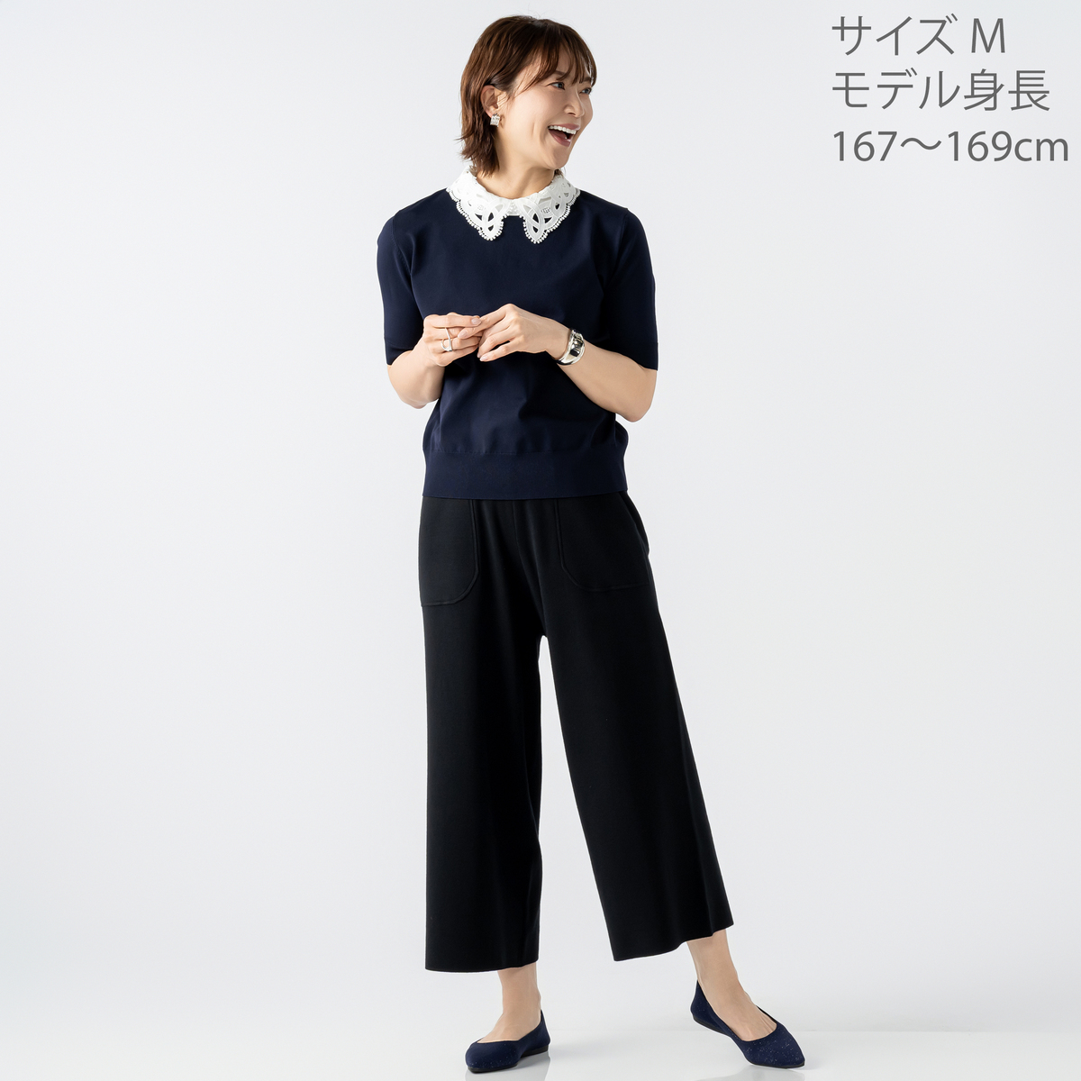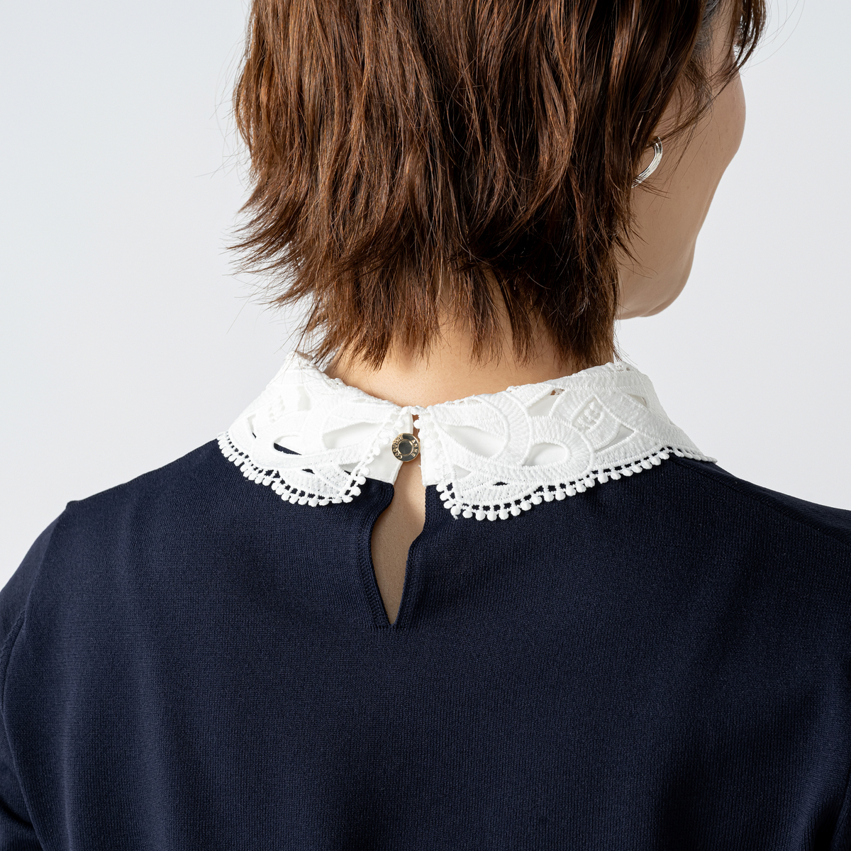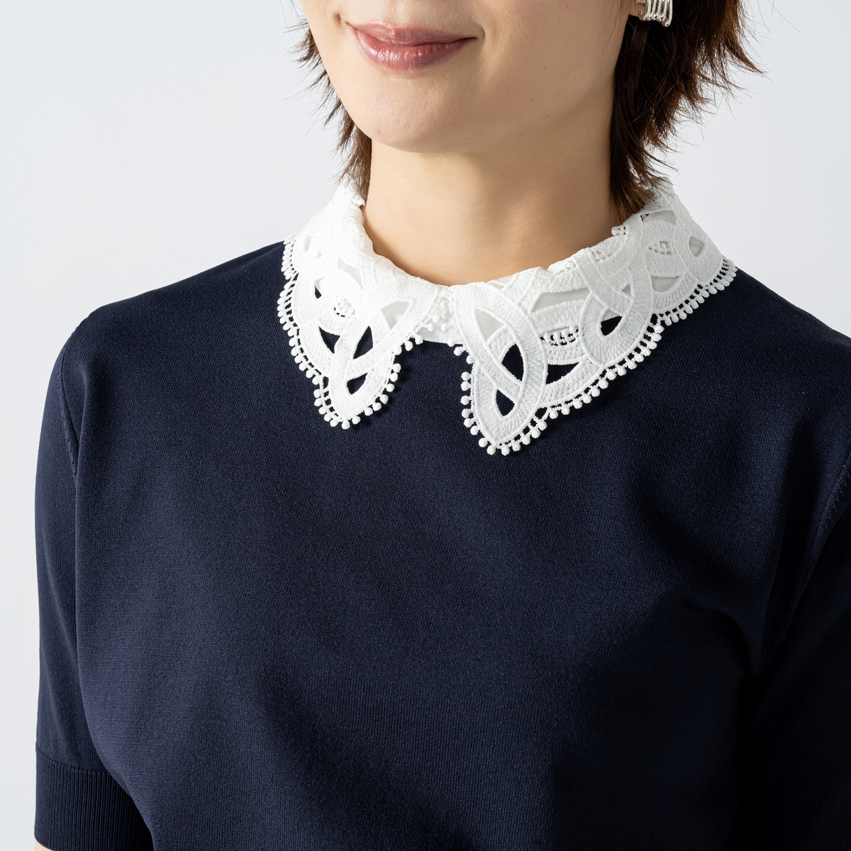 立体感のある14G天竺ニットに、レース刺繍の襟が映える大人フェミニンな半袖トップスです。ほどよい存在感が、日常にさりげない華やかさを添えます