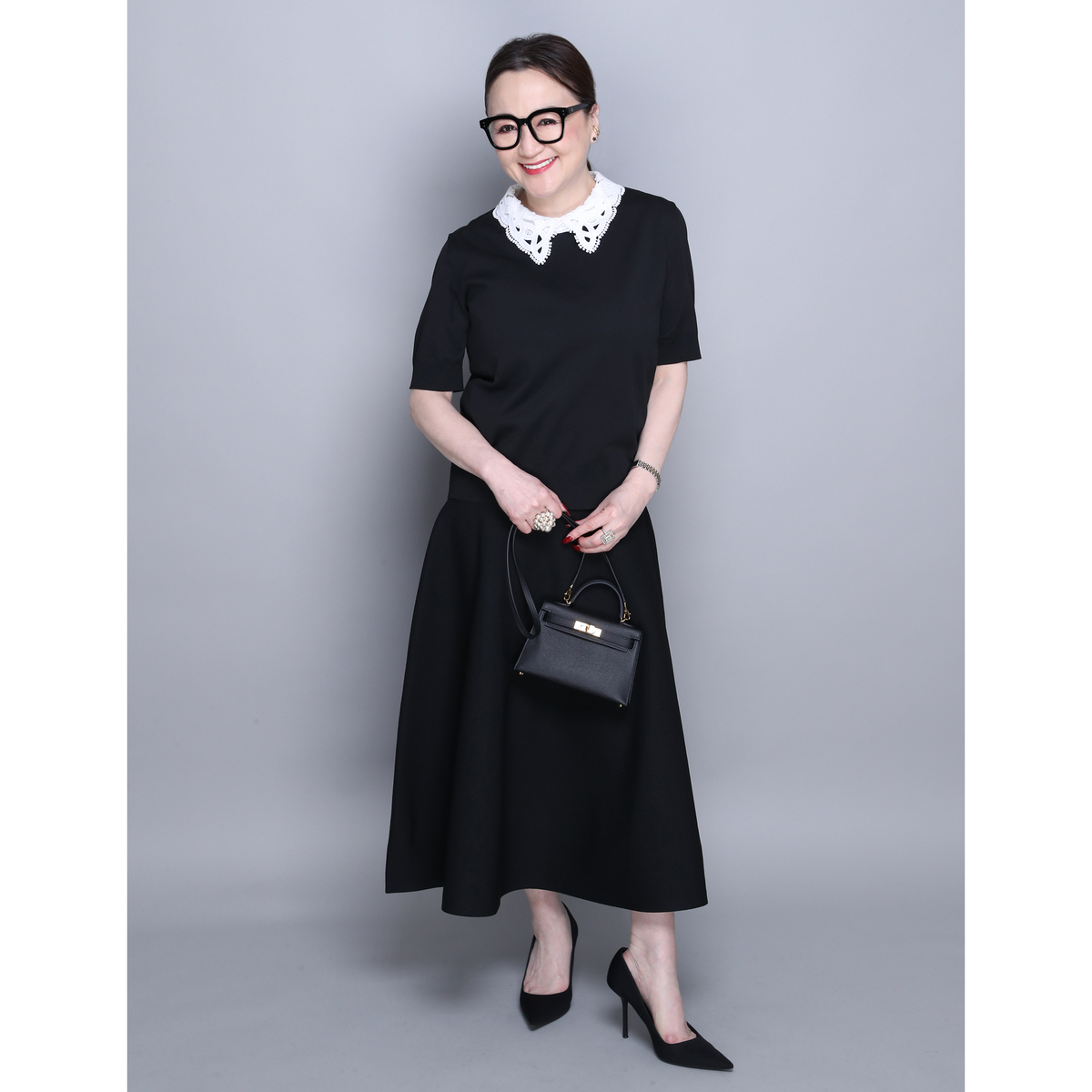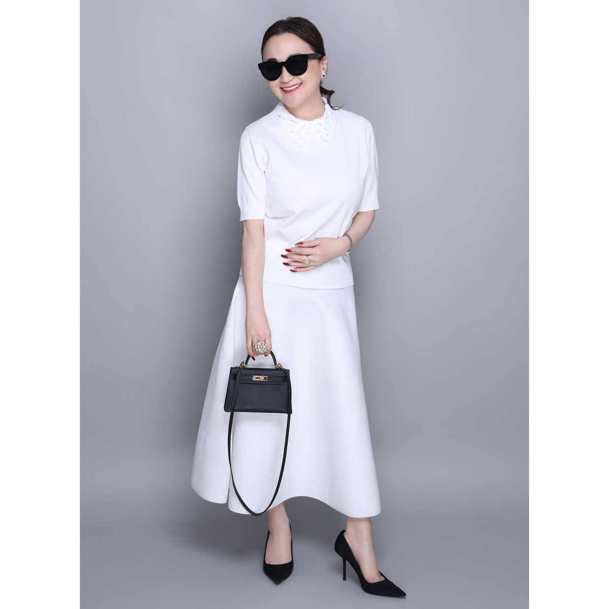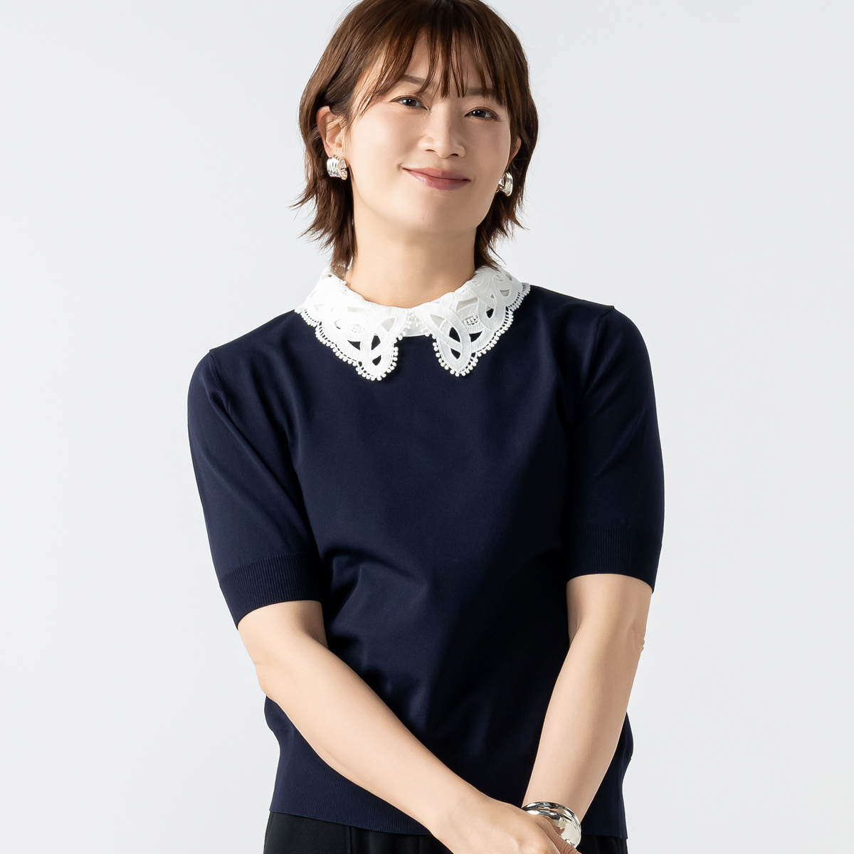 立体感のある14G天竺ニットに、レース刺繍の襟が映える大人フェミニンな半袖トップスです。ほどよい存在感が、日常にさりげない華やかさを添えます