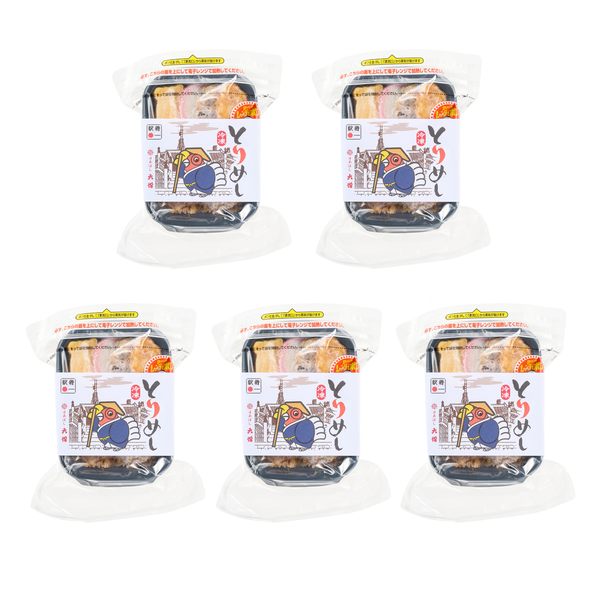 甘めに炊き上げた鶏だしごはんに軟骨入り鶏つくね、鶏そぼろ味噌味、鶏照焼き、蒸し鶏塩ダレ和えの四種の具材を盛り付けた冷凍駅弁とりめし5個セット。多彩な鶏のおかずが楽しめます