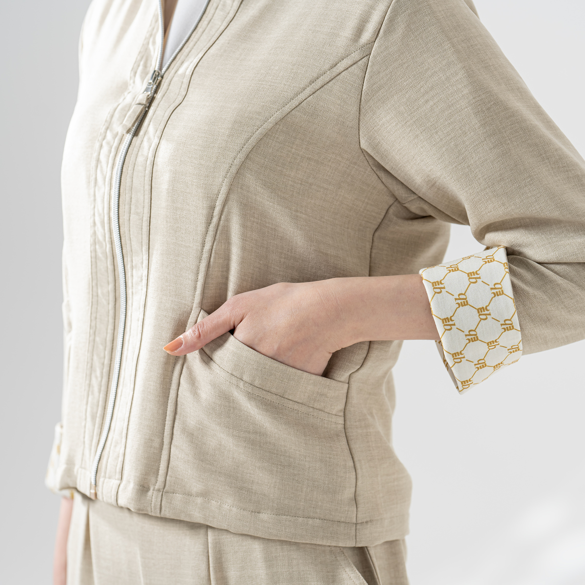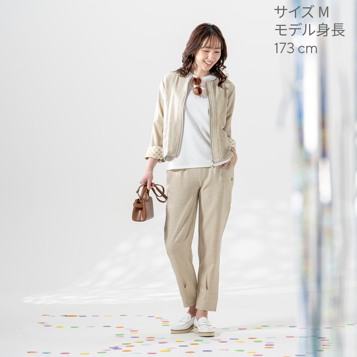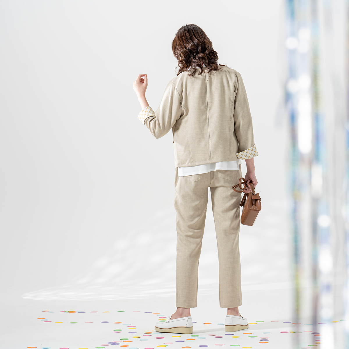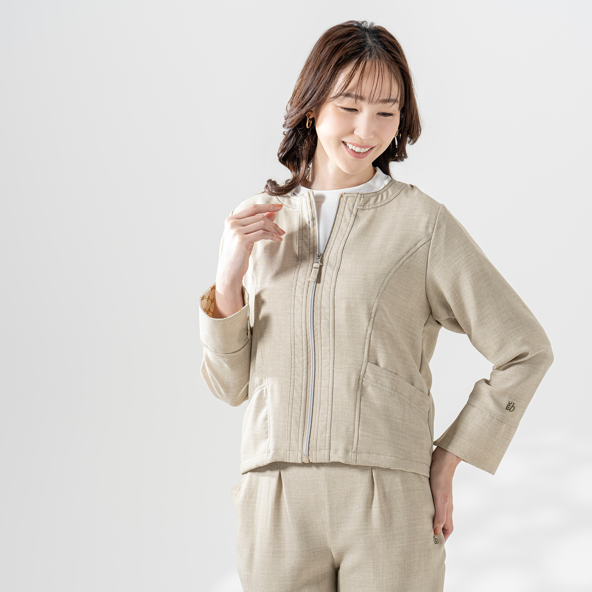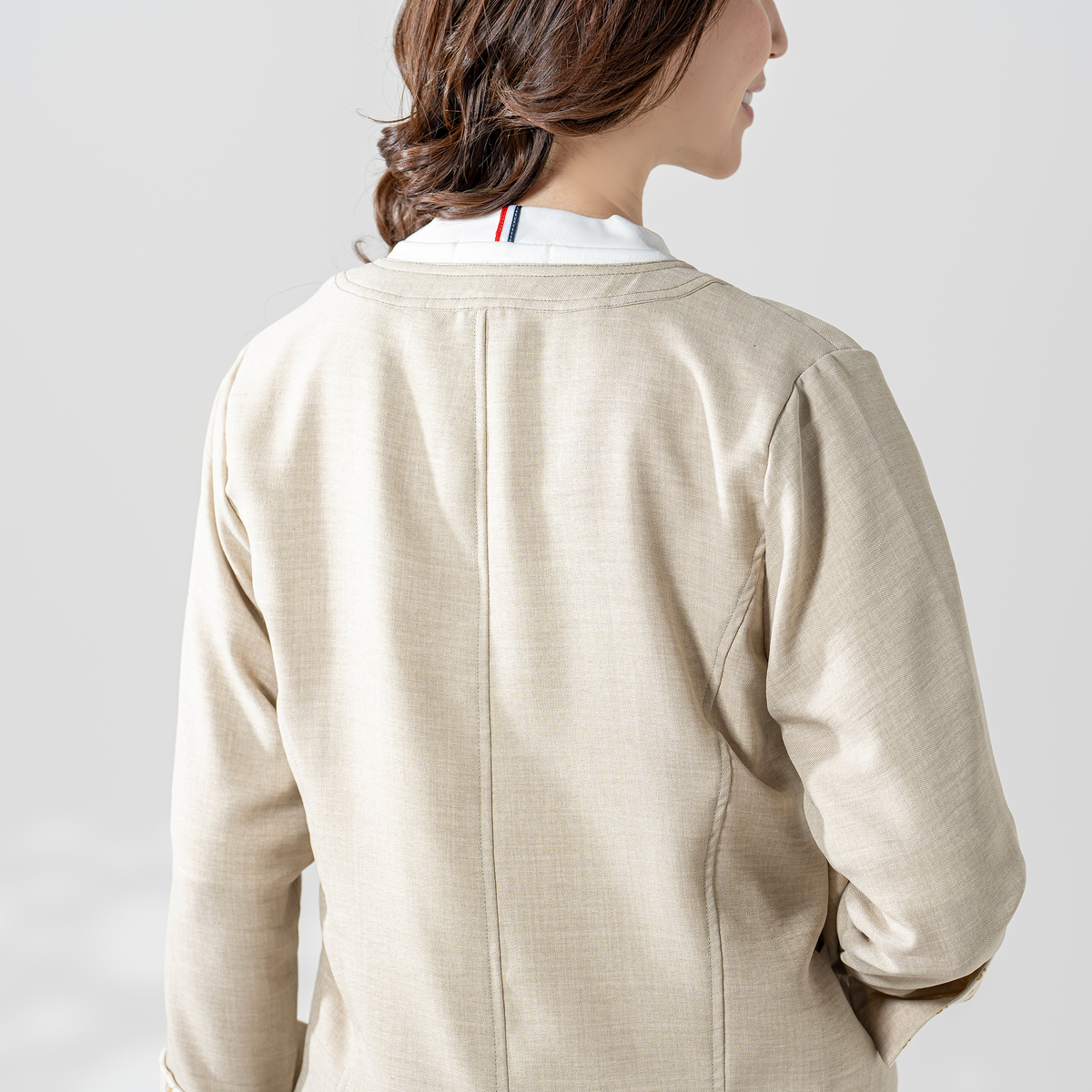 ノーカラーデザインで軽やかな着心地ときちんと感を両立したジャケット。袖口は本体カラーに合わせた別布を使用し、ロールアップすると別布が覗きます。脇切替を前振りにすることで自然な細見え効果も期待でき、羽織るだけでバランスよく決まります