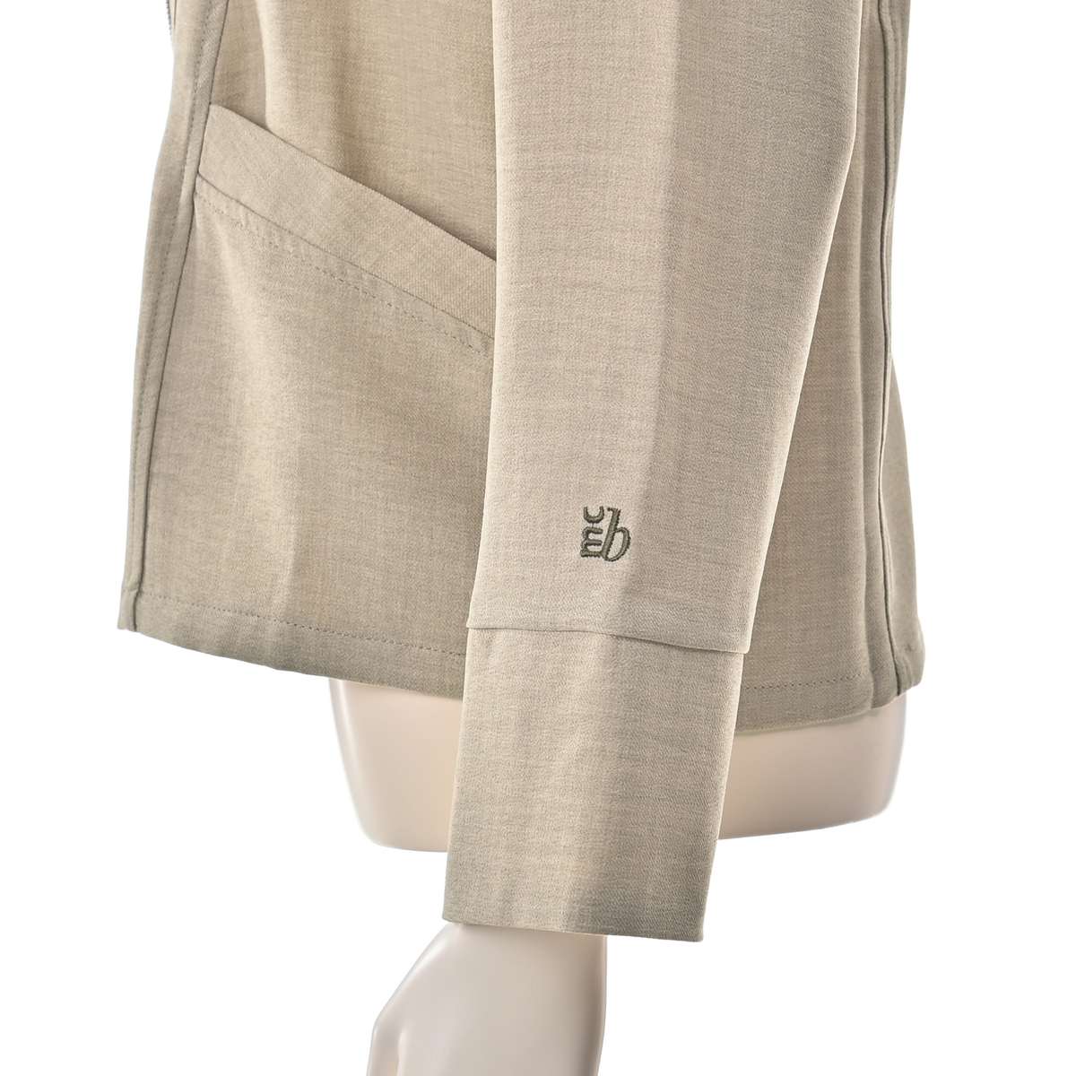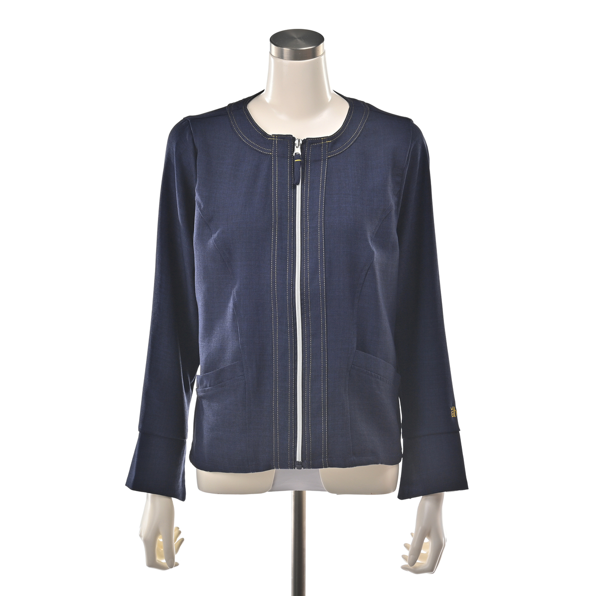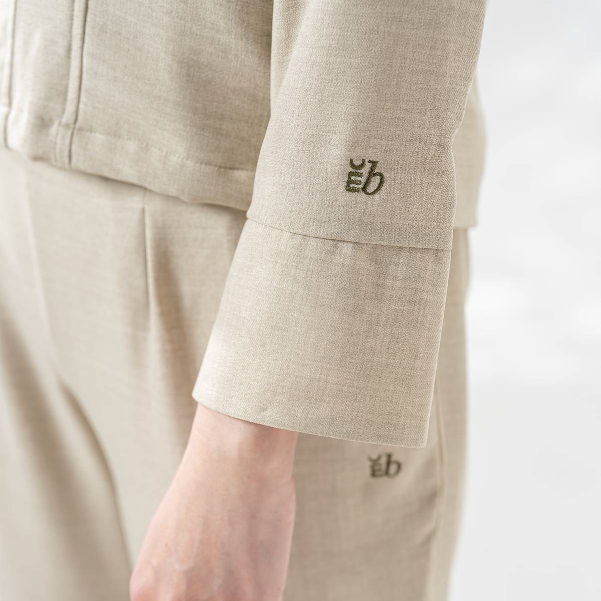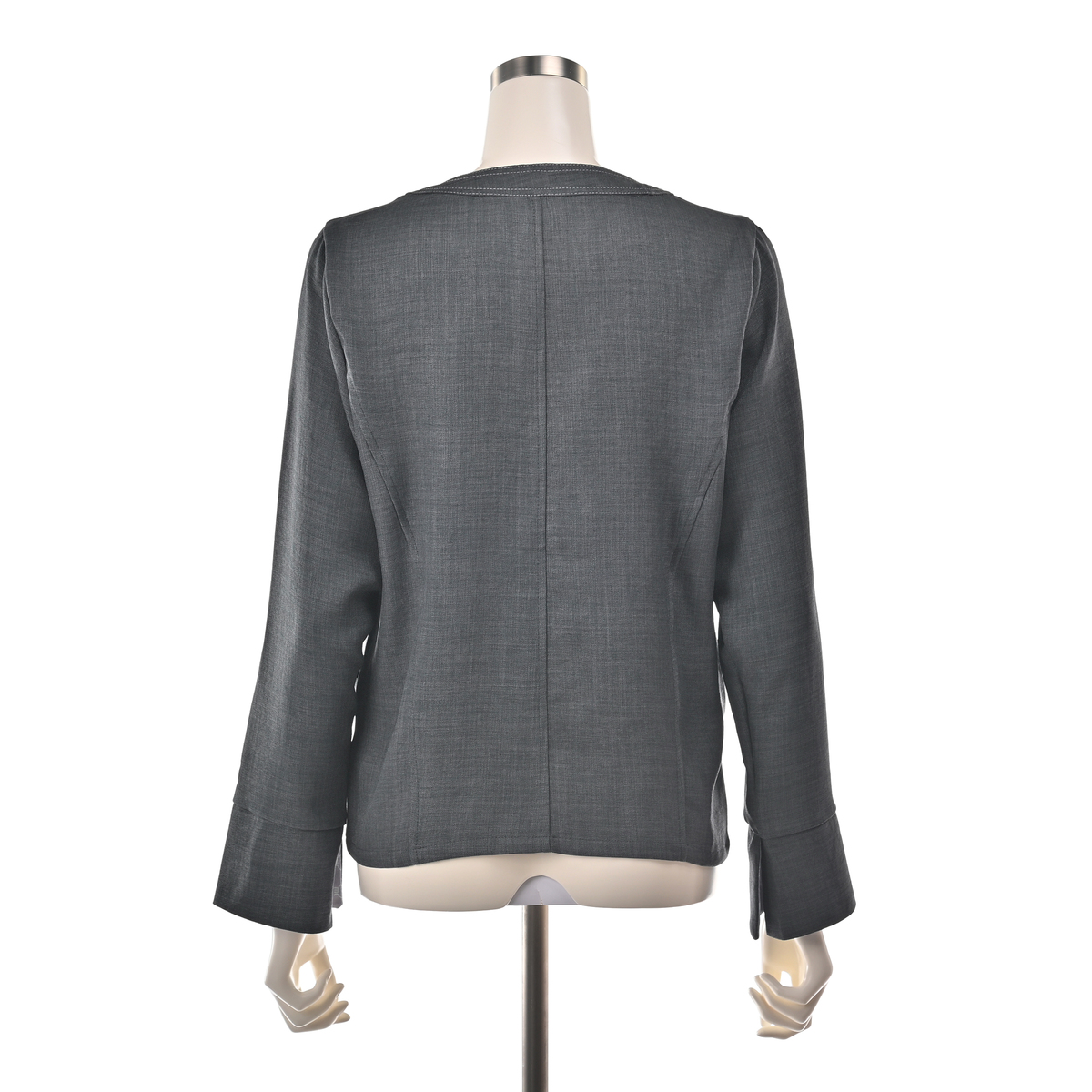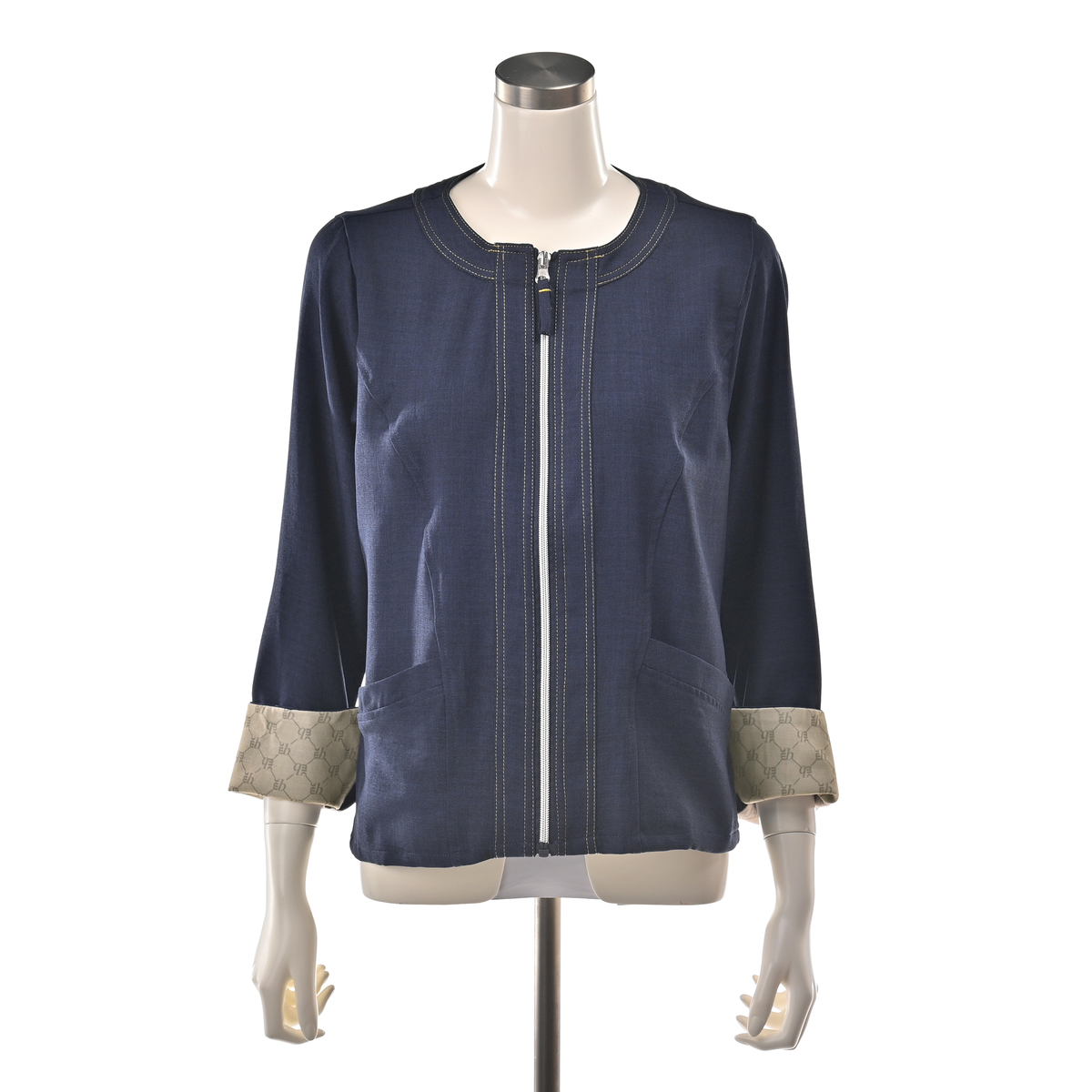 ノーカラーデザインで軽やかな着心地ときちんと感を両立したジャケット。袖口は本体カラーに合わせた別布を使用し、ロールアップすると別布が覗きます。脇切替を前振りにすることで自然な細見え効果も期待でき、羽織るだけでバランスよく決まります