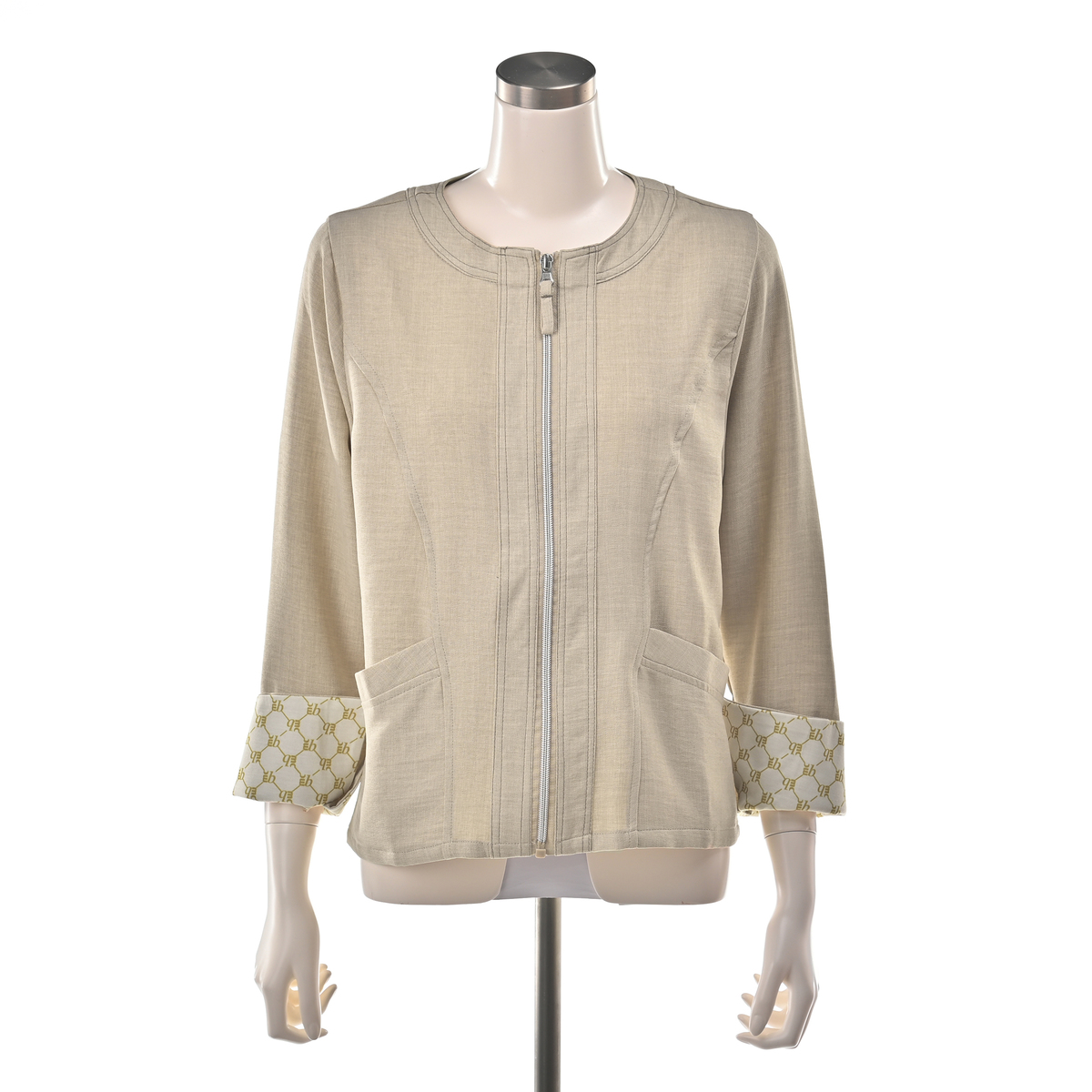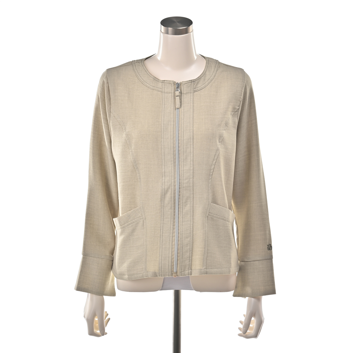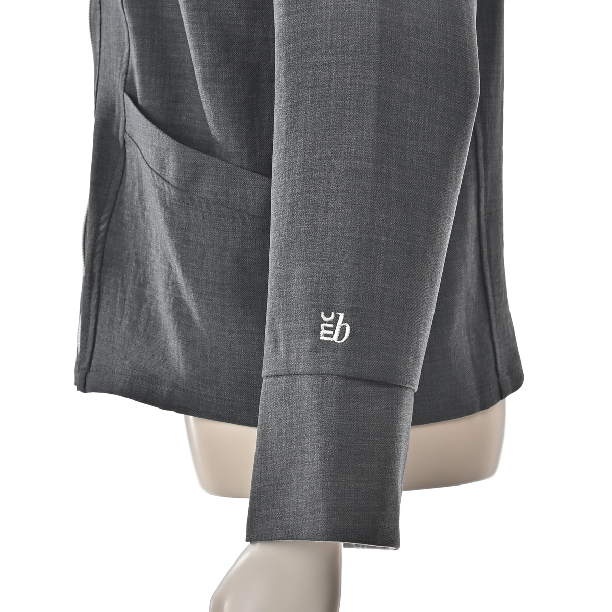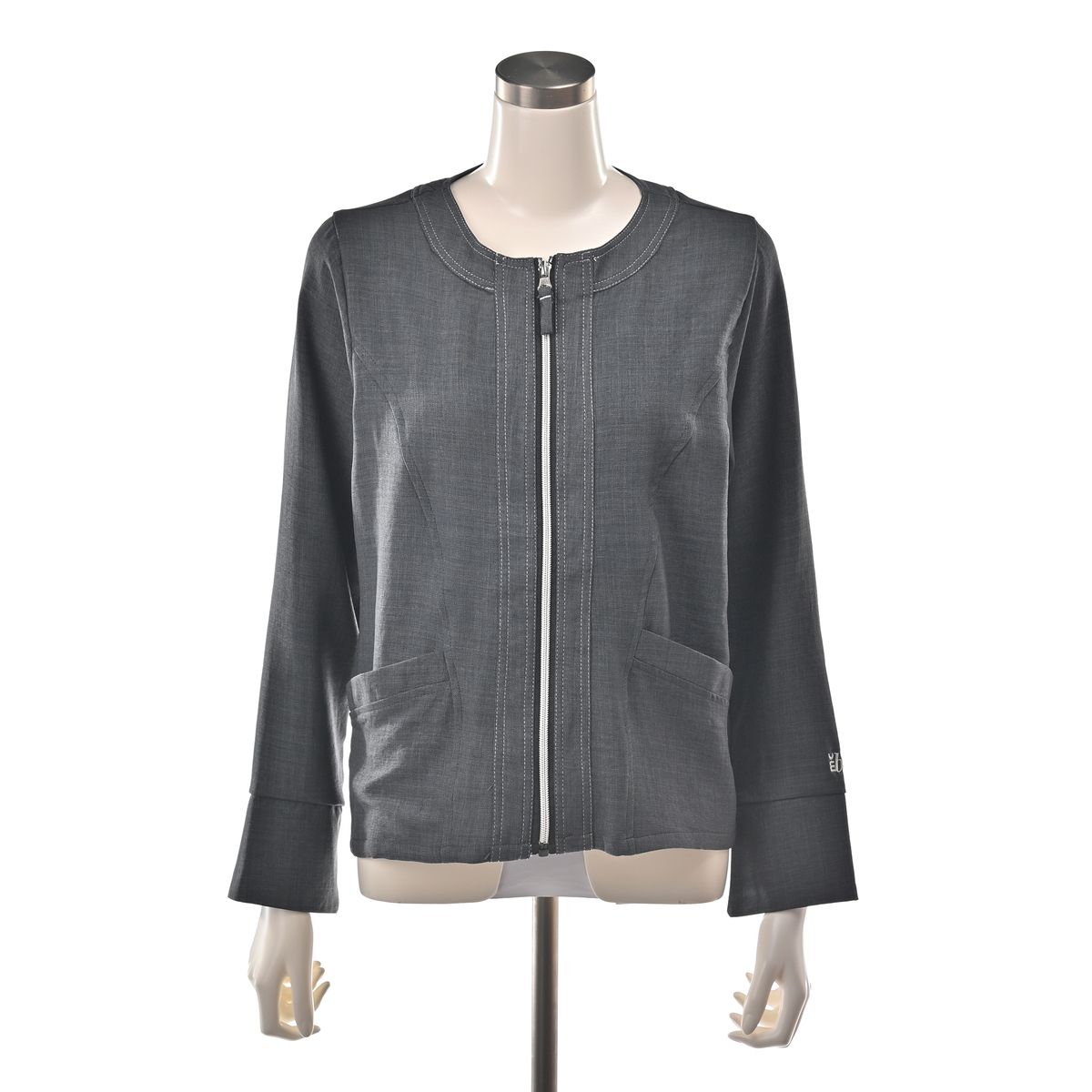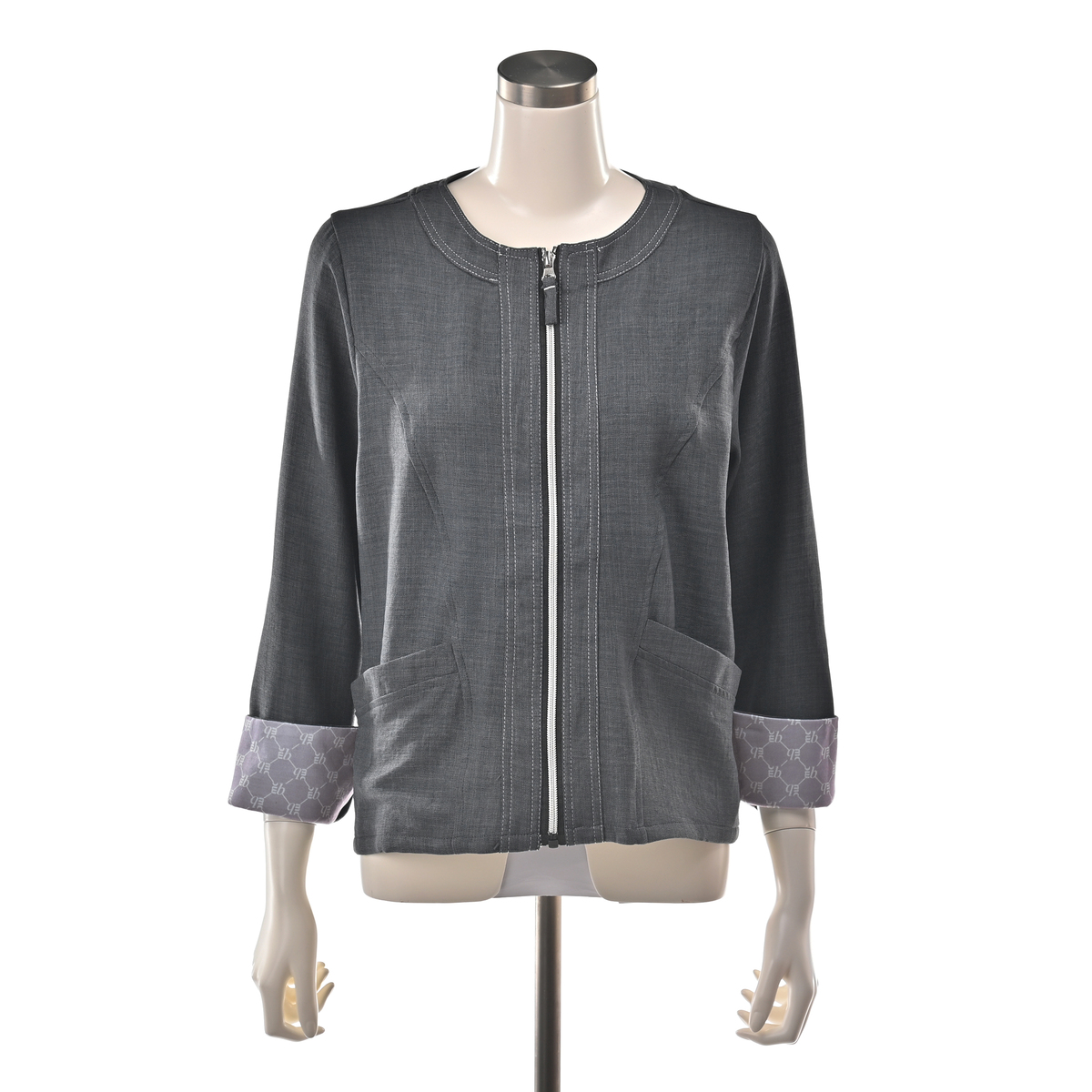 ノーカラーデザインで軽やかな着心地ときちんと感を両立したジャケット。袖口は本体カラーに合わせた別布を使用し、ロールアップすると別布が覗きます。脇切替を前振りにすることで自然な細見え効果も期待でき、羽織るだけでバランスよく決まります