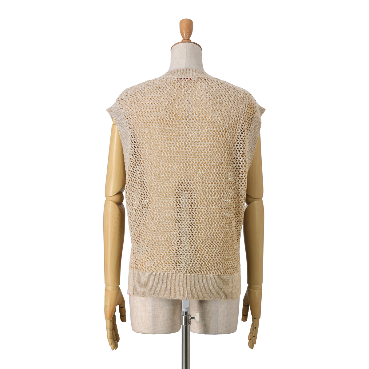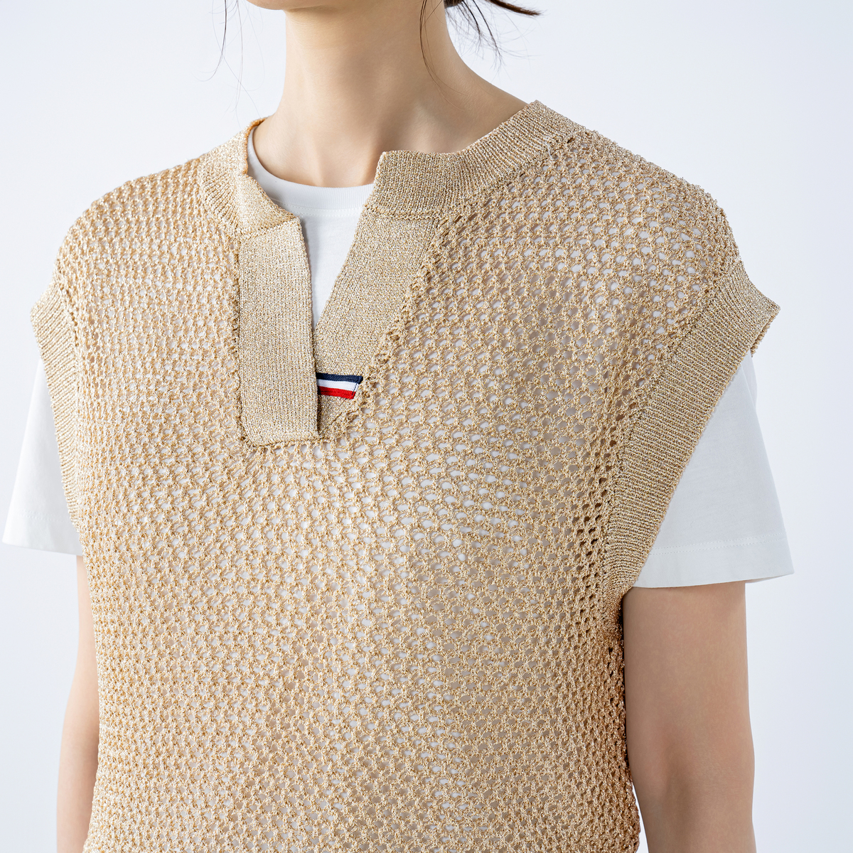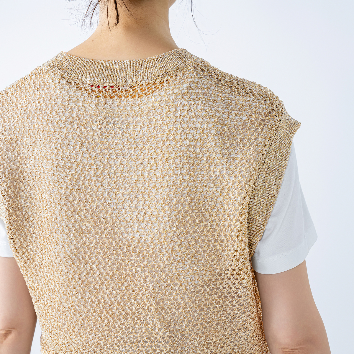 編地の表情が印象的なベストです。メッシュ編みのニット素材を使用し、程よい透け感と凹凸のある編地が見た目にも軽やか。細く上品な糸使いでスタイリングに取り入れやすく、季節の変わり目に活躍する着回し力の高いアイテムです