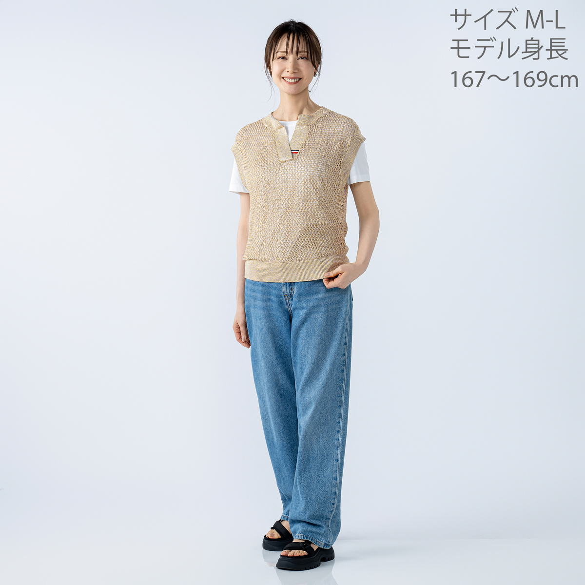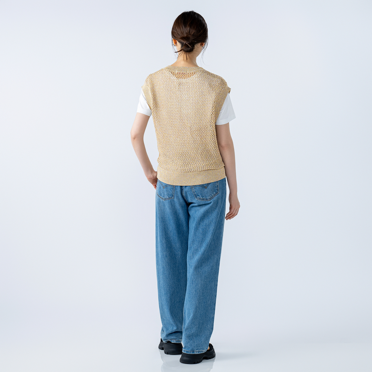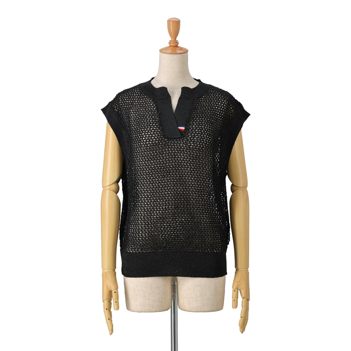 編地の表情が印象的なベストです。メッシュ編みのニット素材を使用し、程よい透け感と凹凸のある編地が見た目にも軽やか。細く上品な糸使いでスタイリングに取り入れやすく、季節の変わり目に活躍する着回し力の高いアイテムです